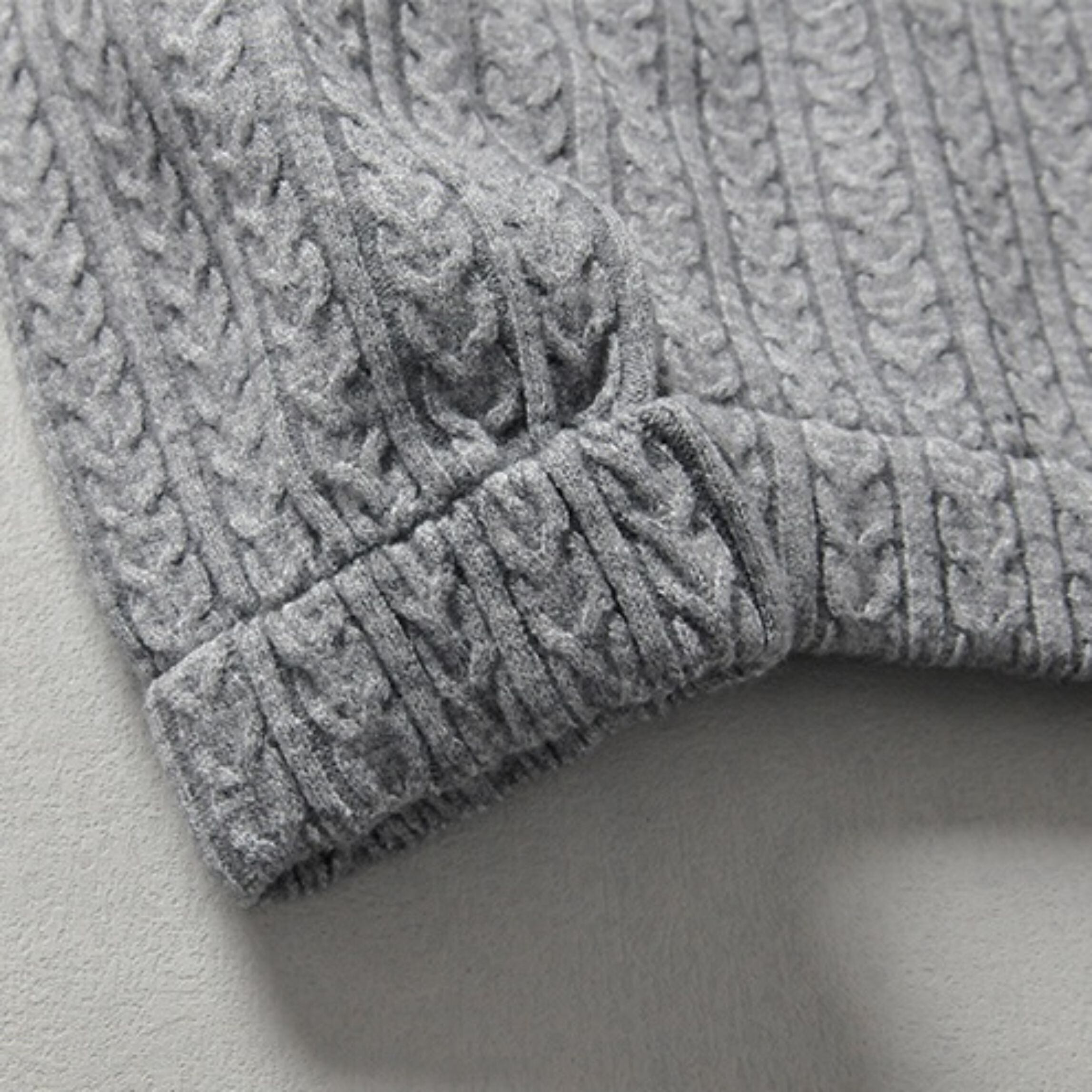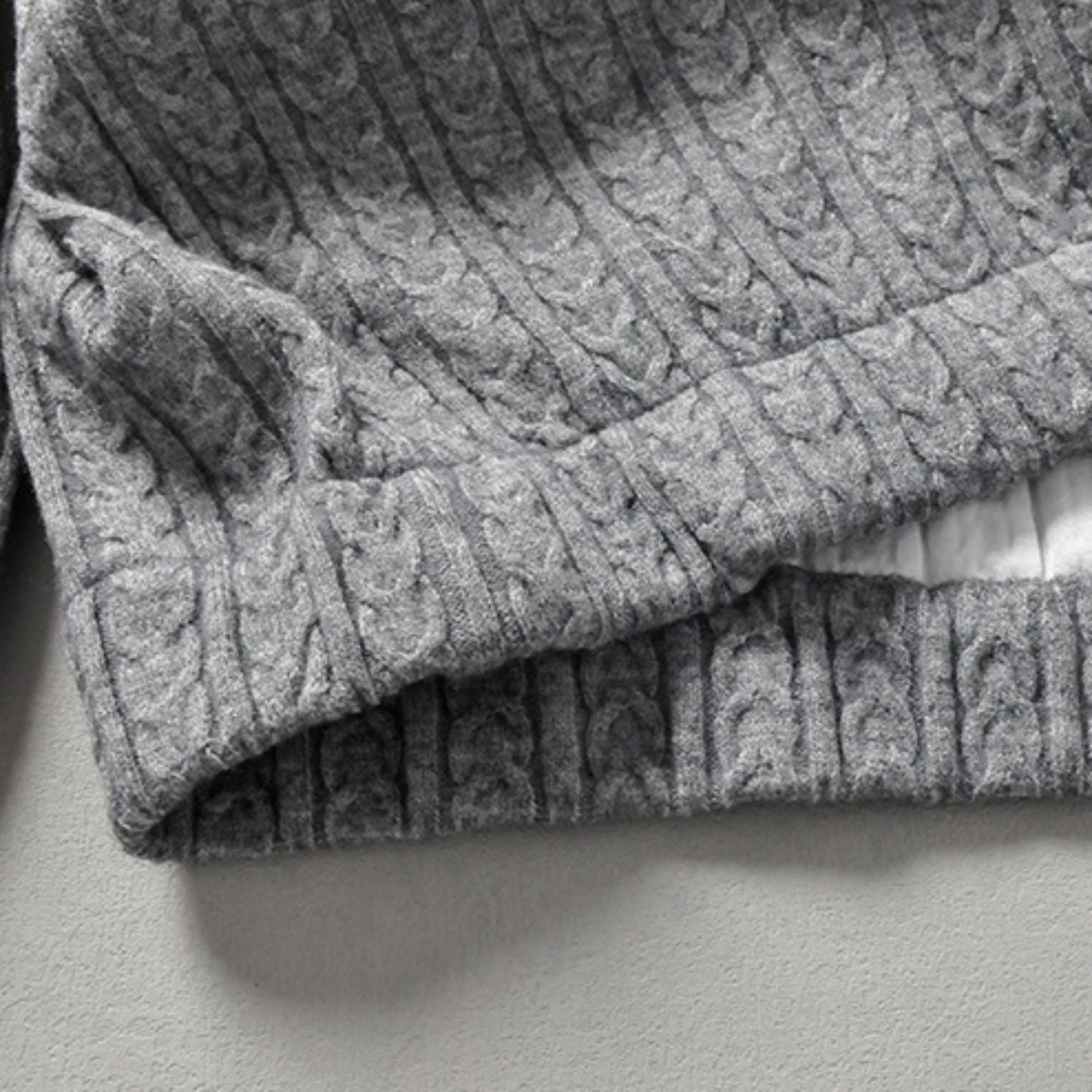 上品なケーブルデザインが全体に施されたニット。