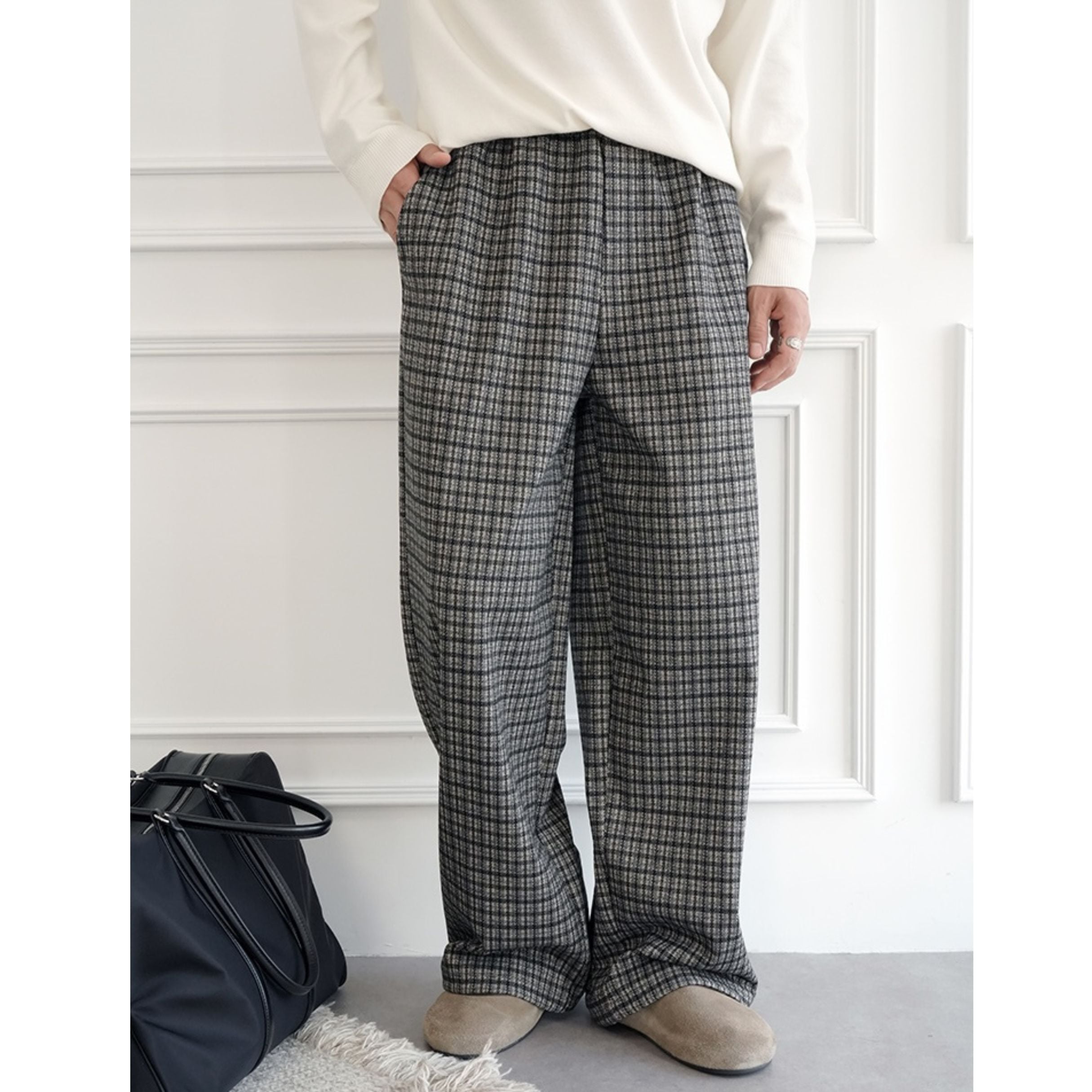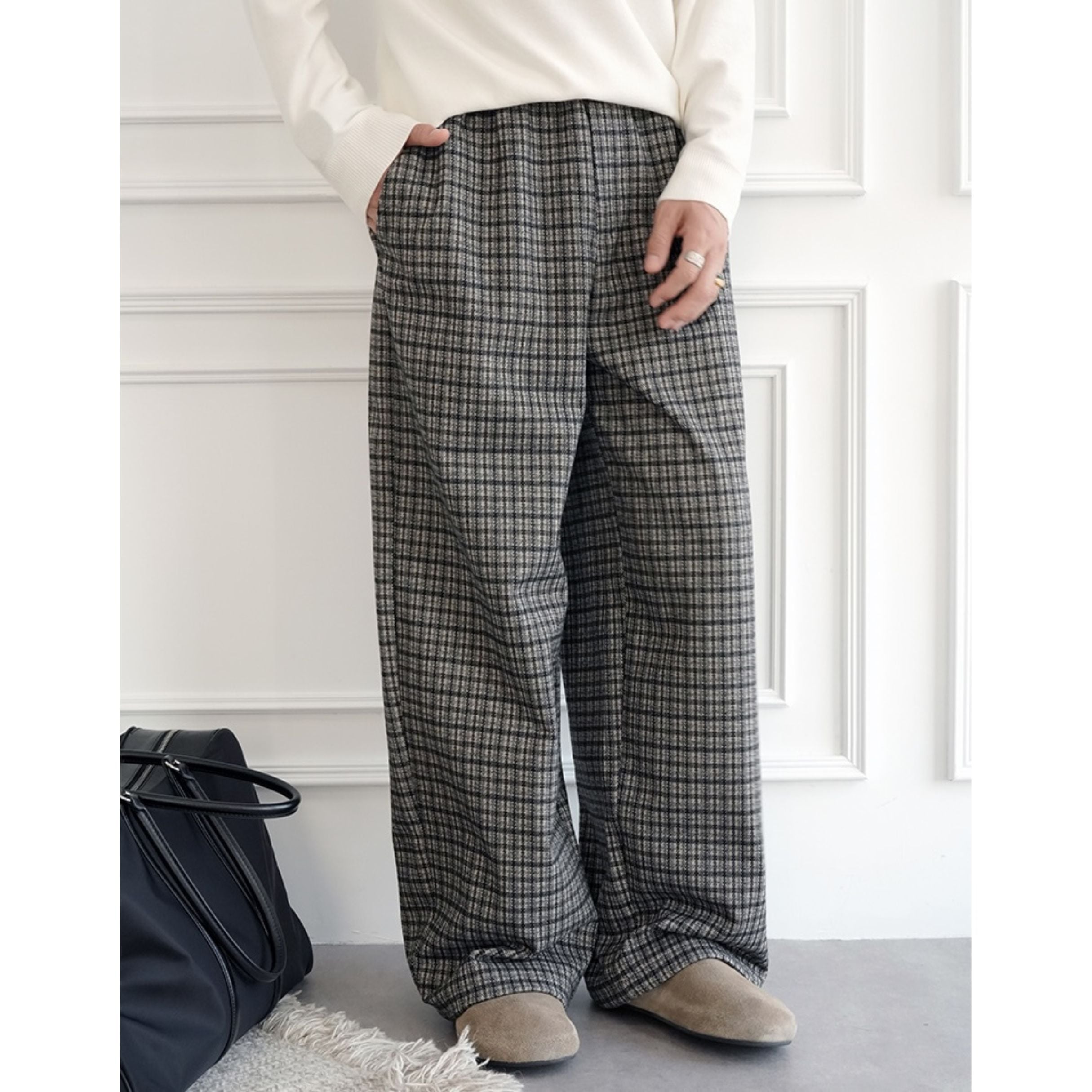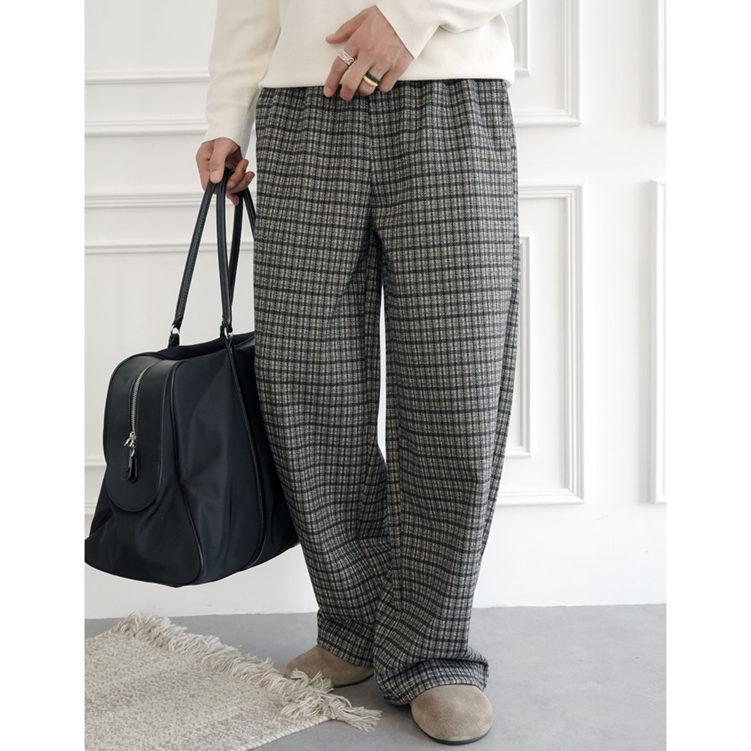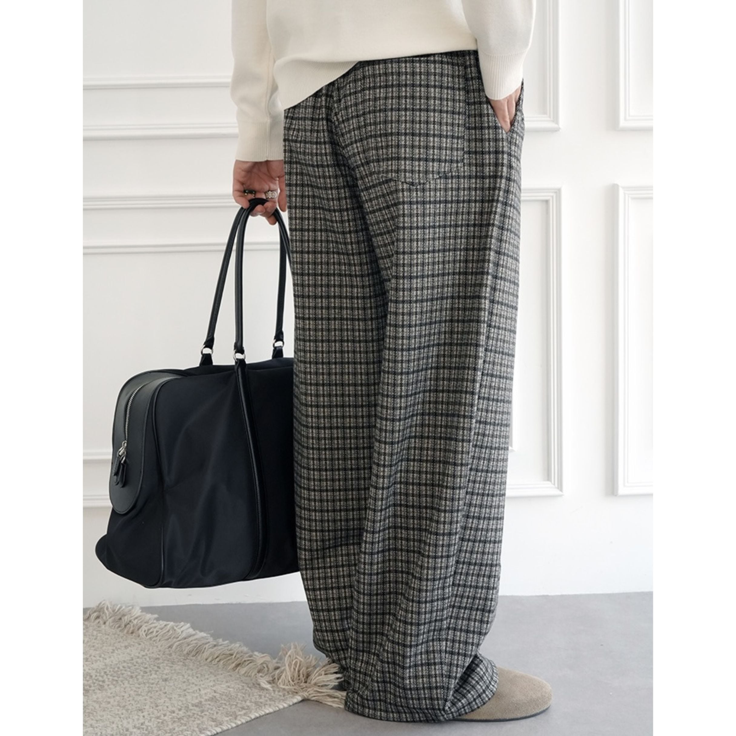 クラシカルなグレンチェック柄が魅力のワイドパンツ。