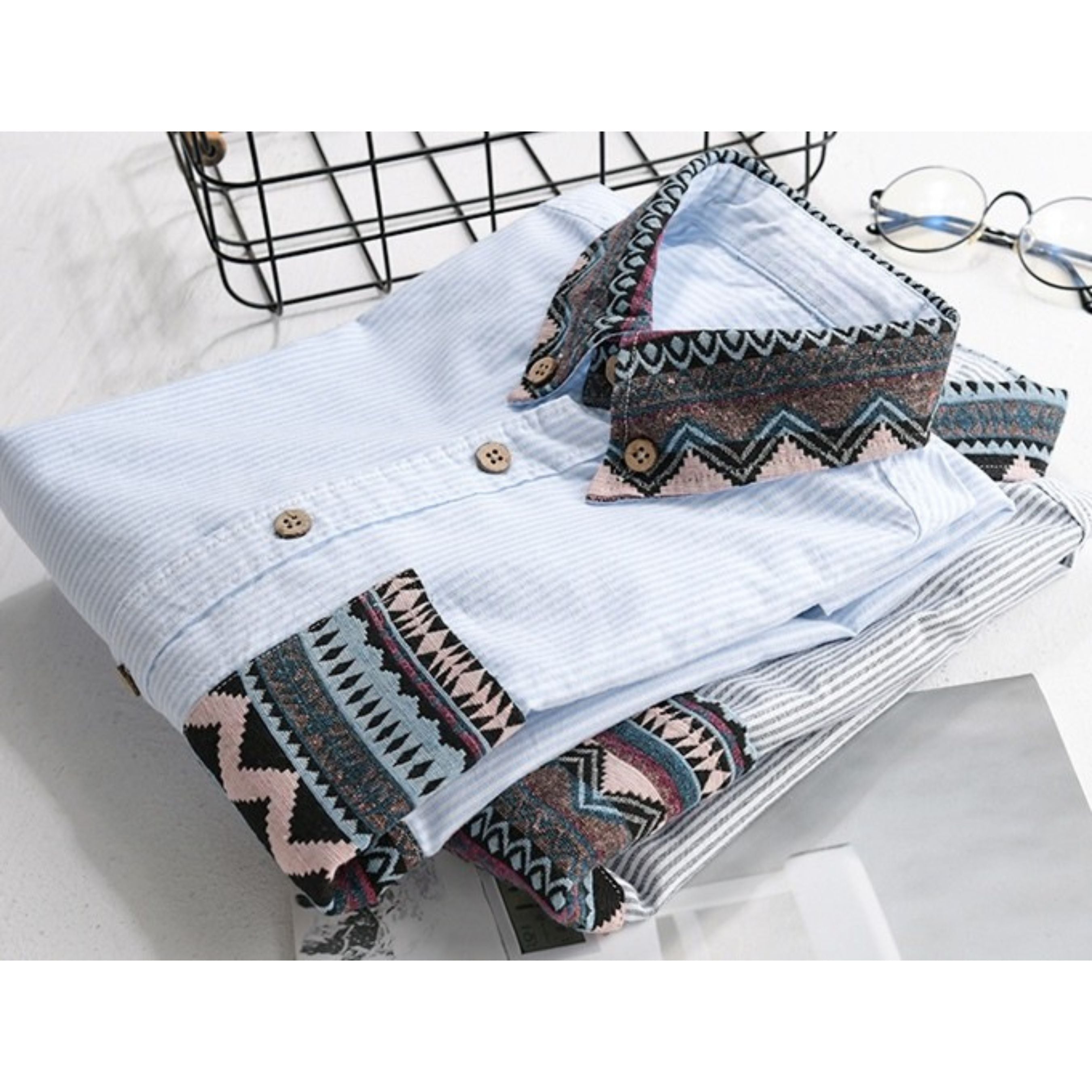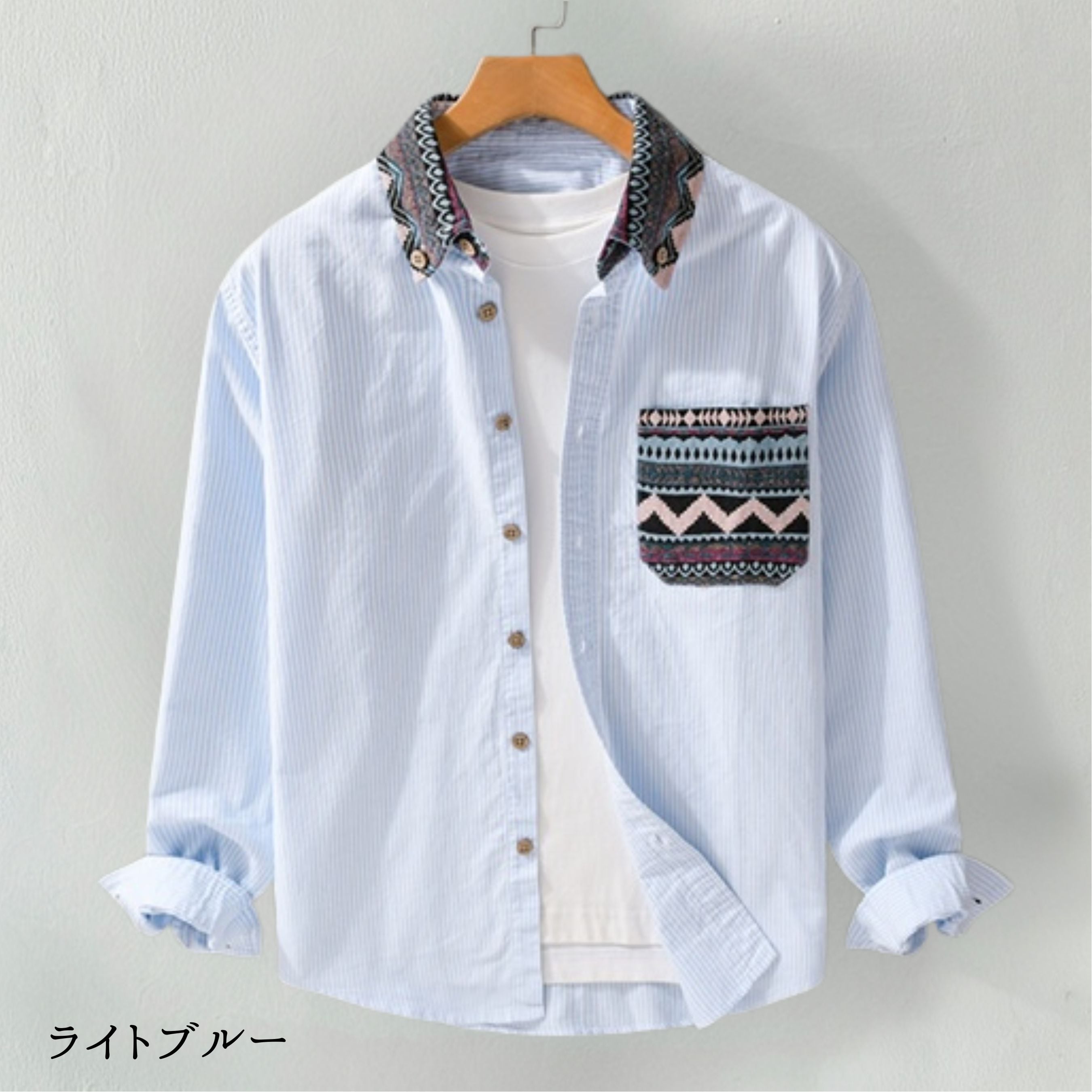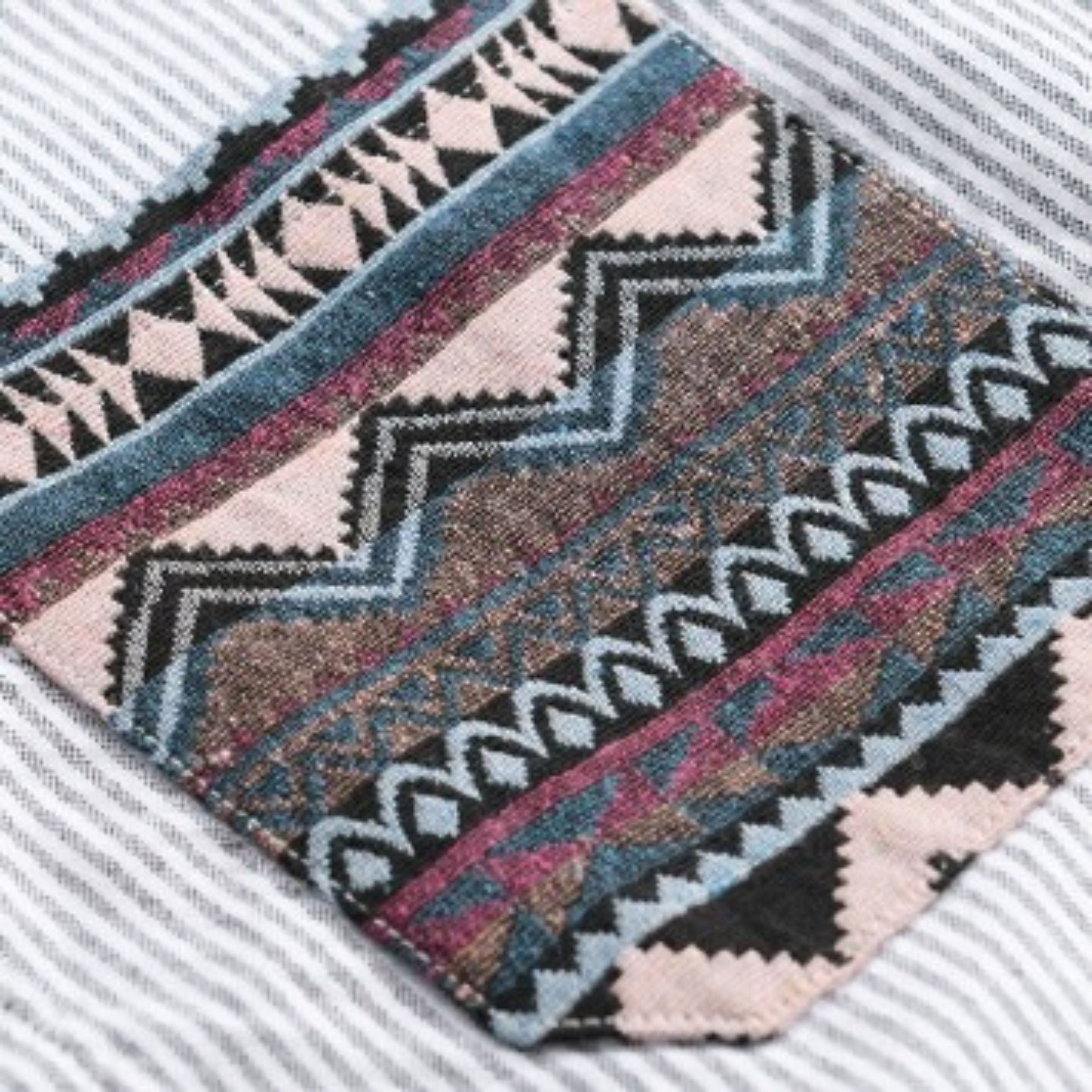 襟とポケットにあしらわれたエスニック調のパターンが、