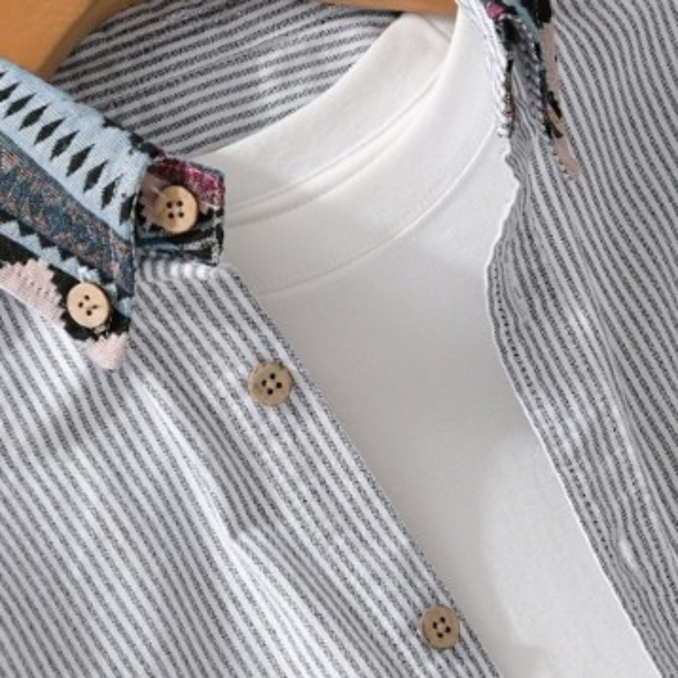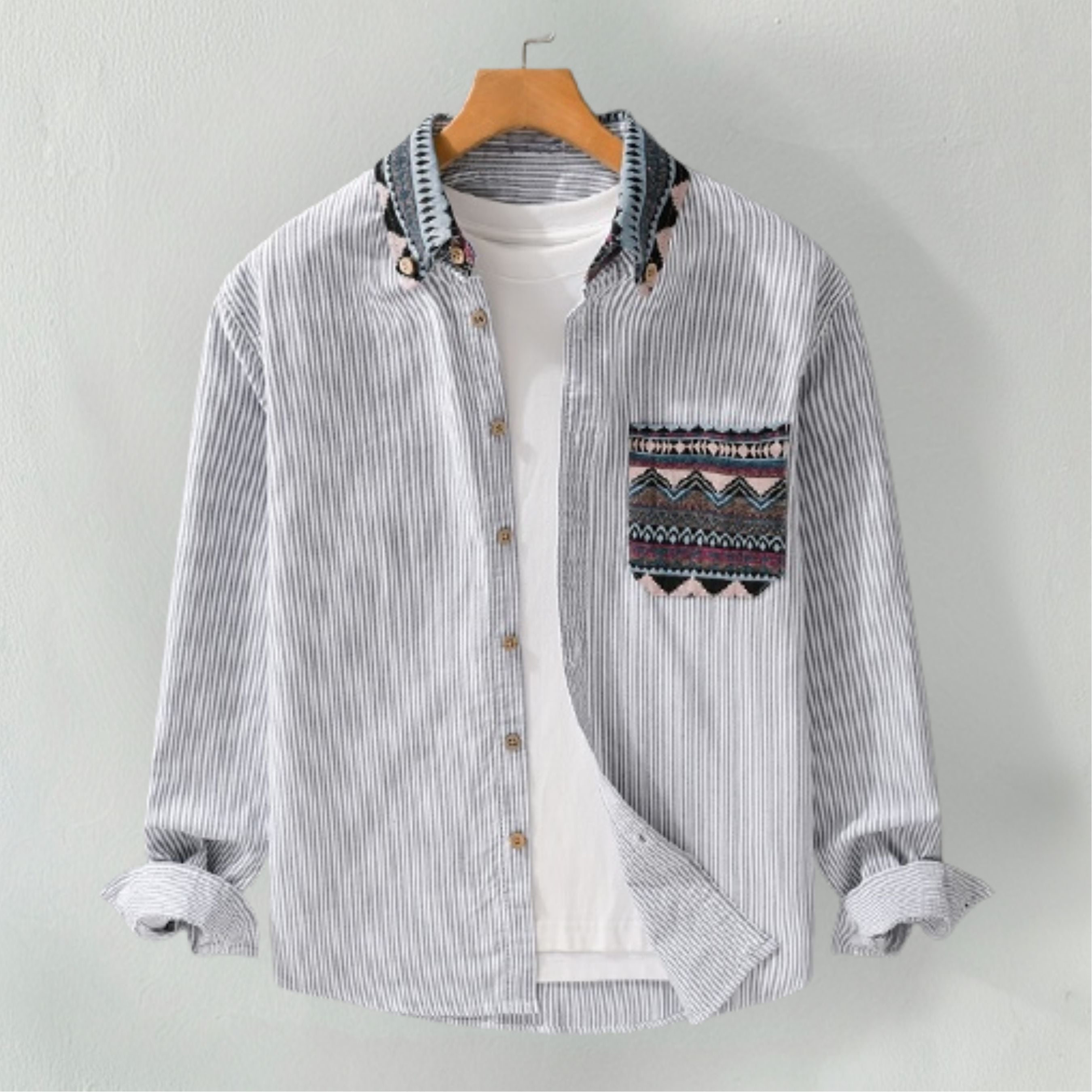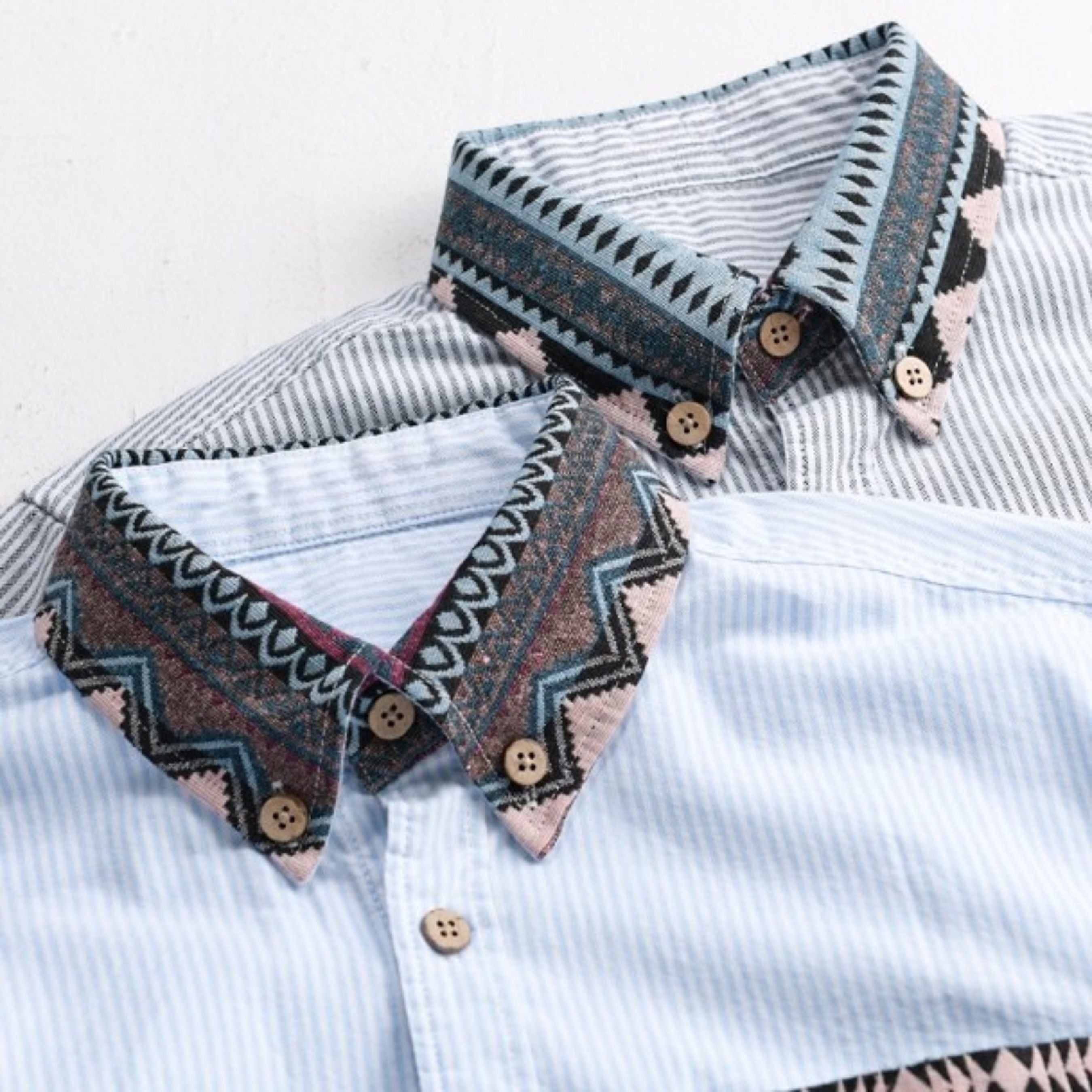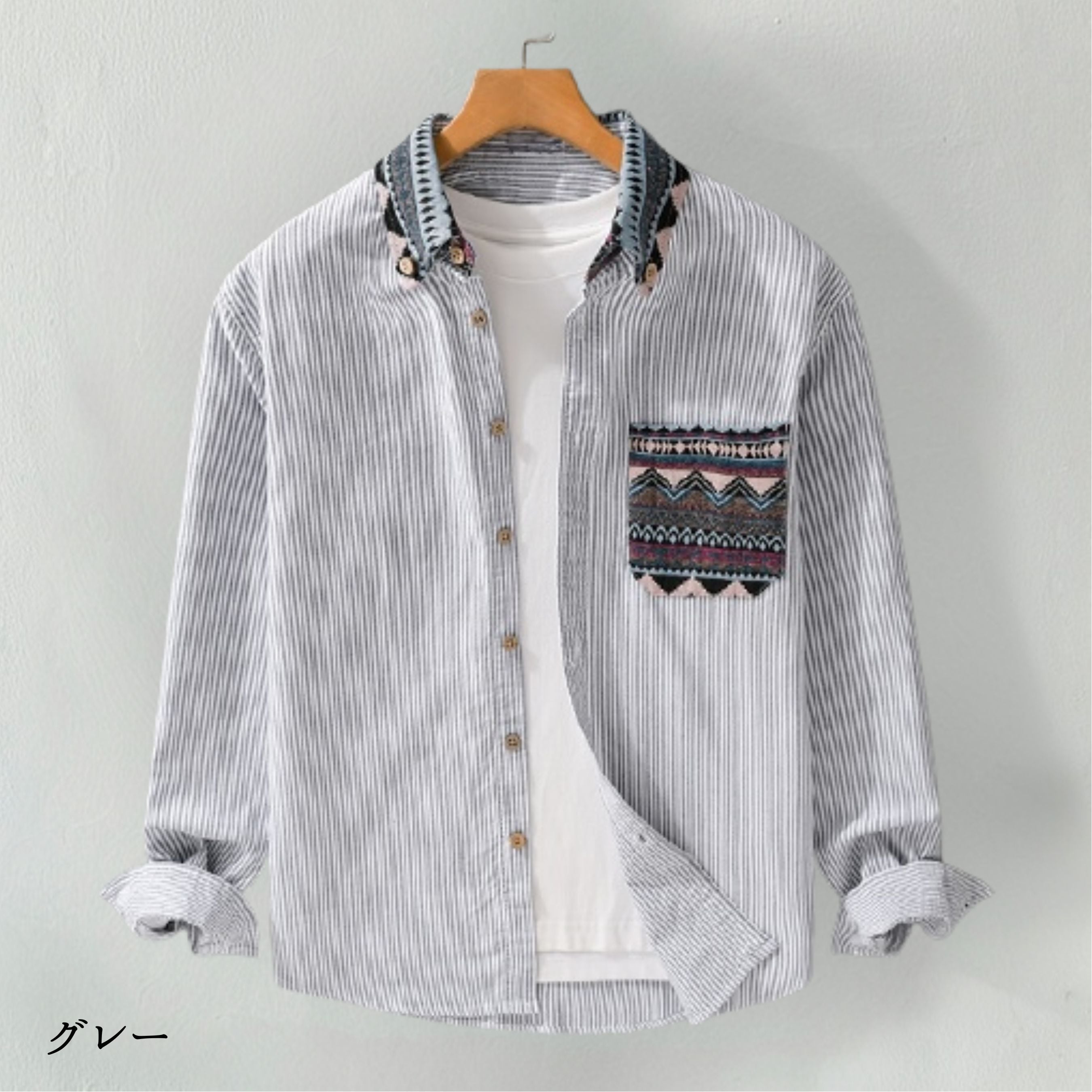 シンプルなストライプシャツに個性と奥行きをプラス。