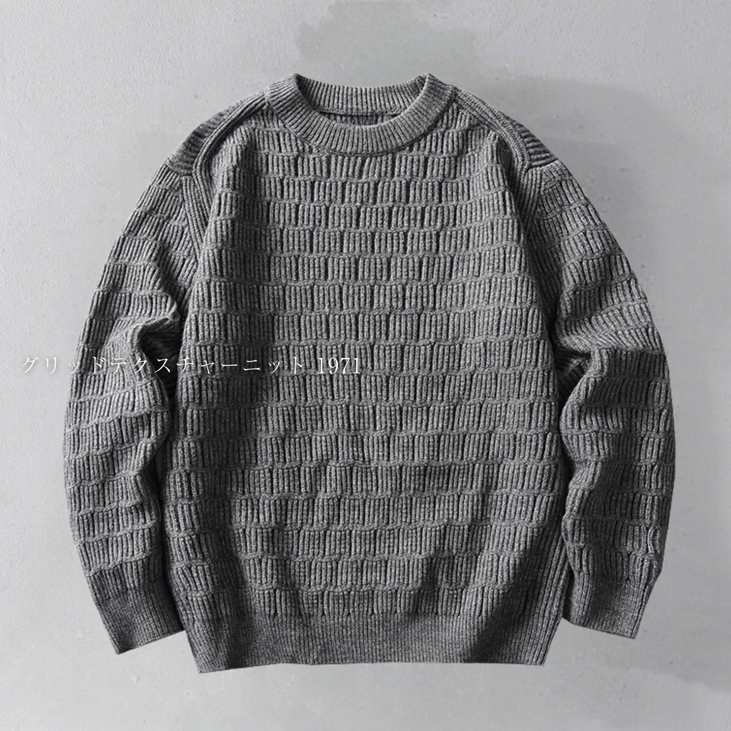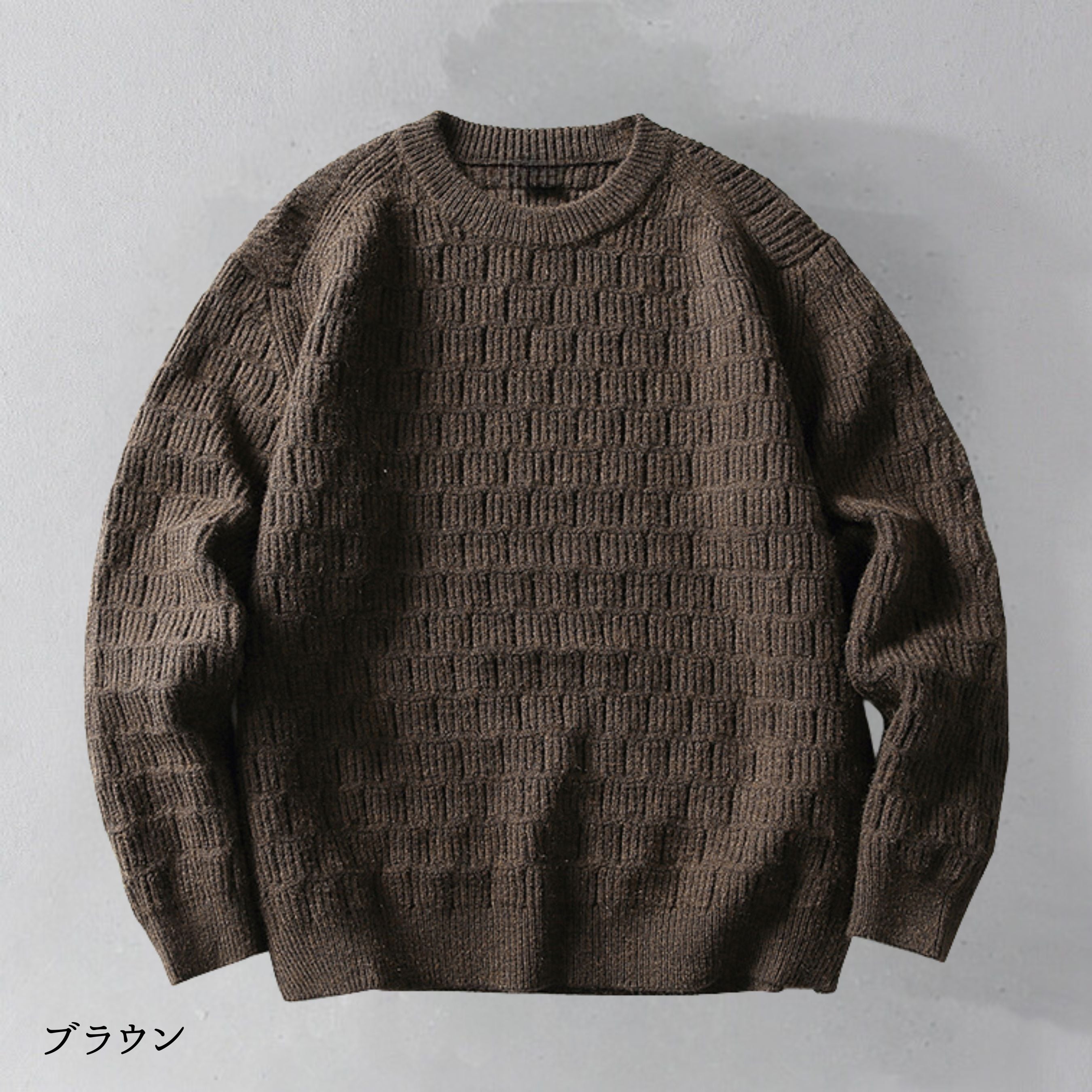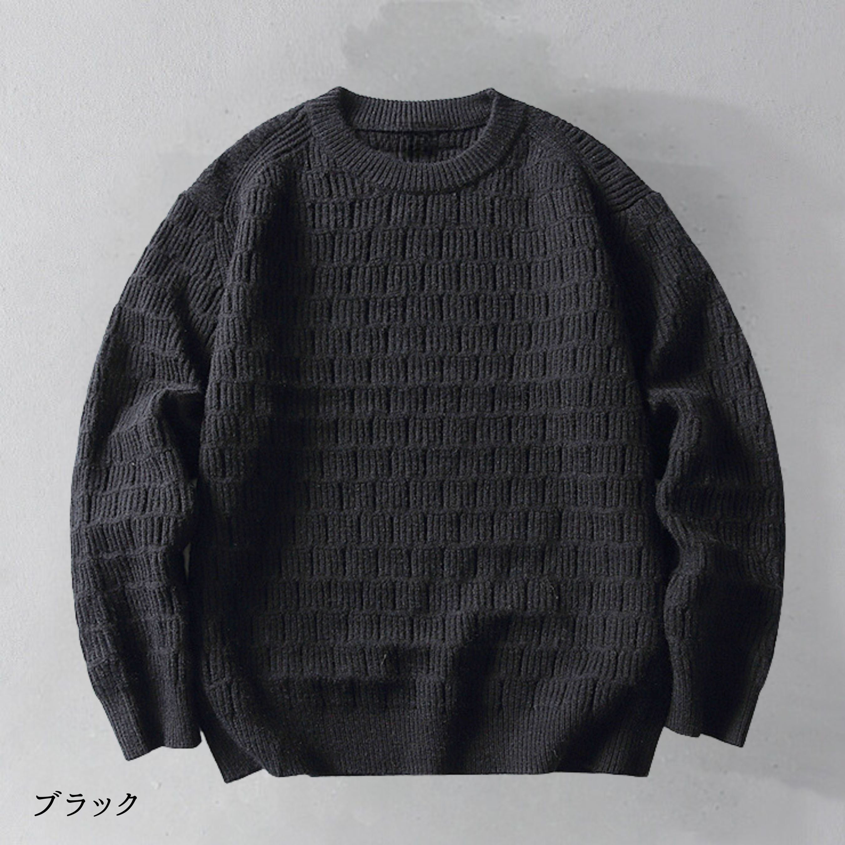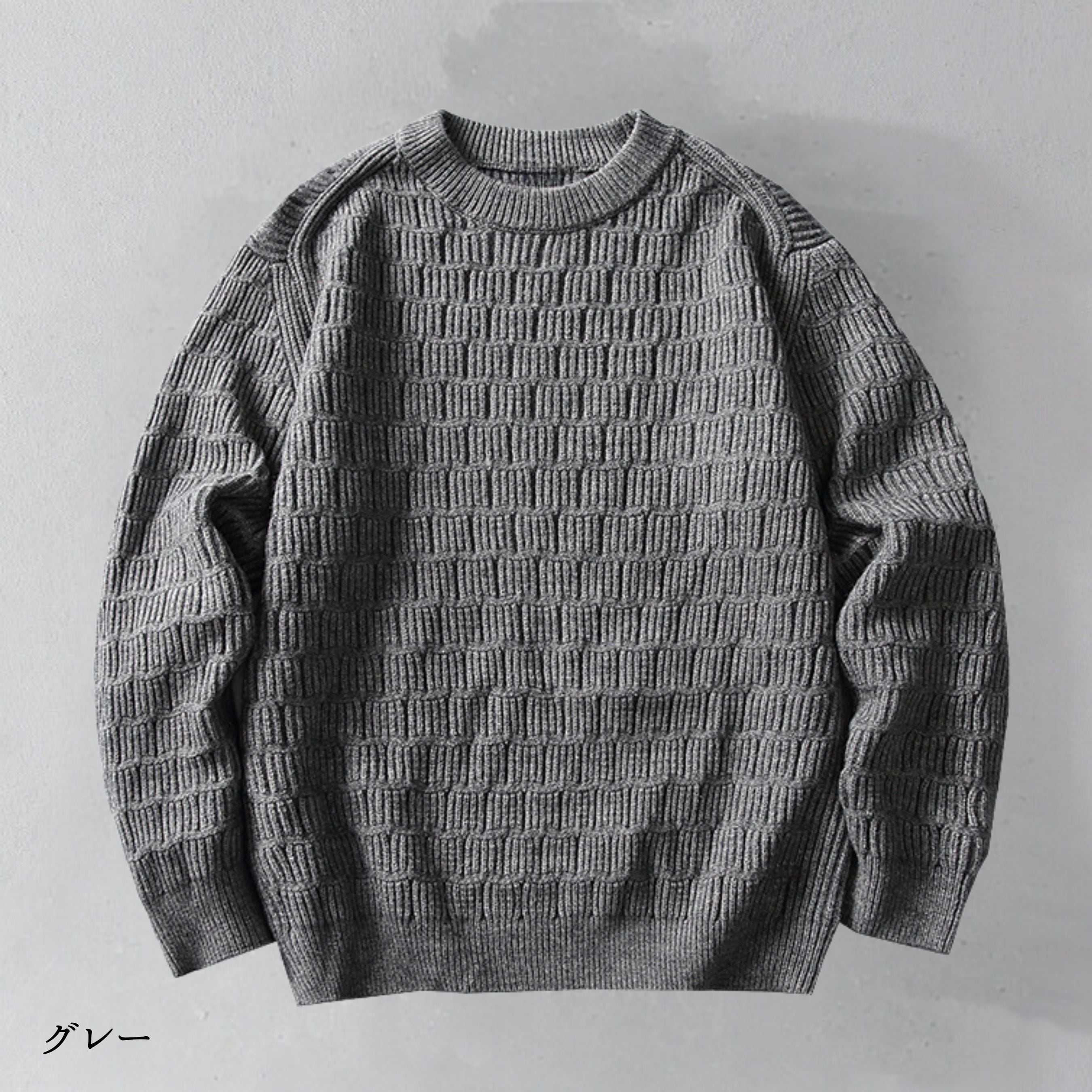 立体感のあるリブ編みのデザインが特徴的なクルーネックニット。