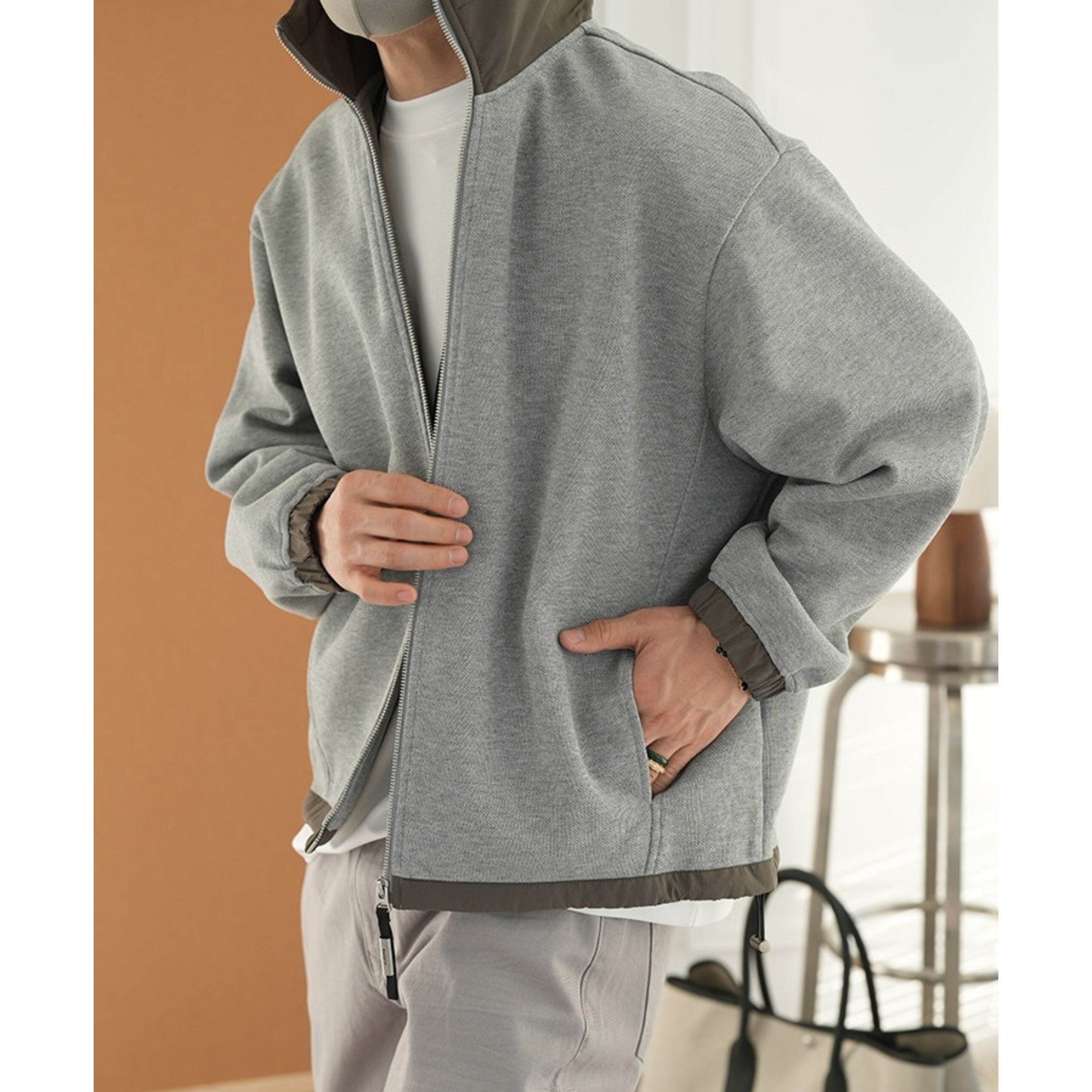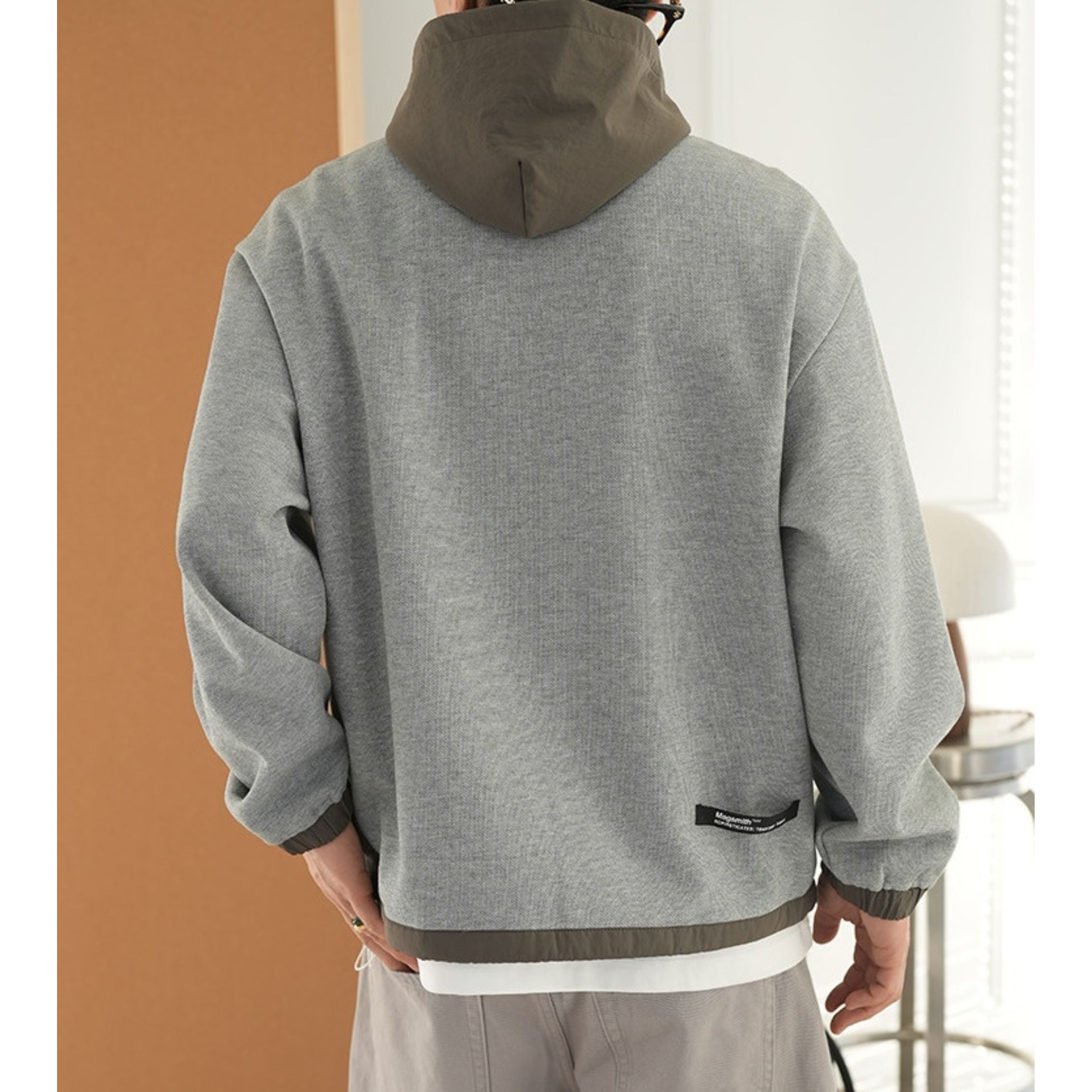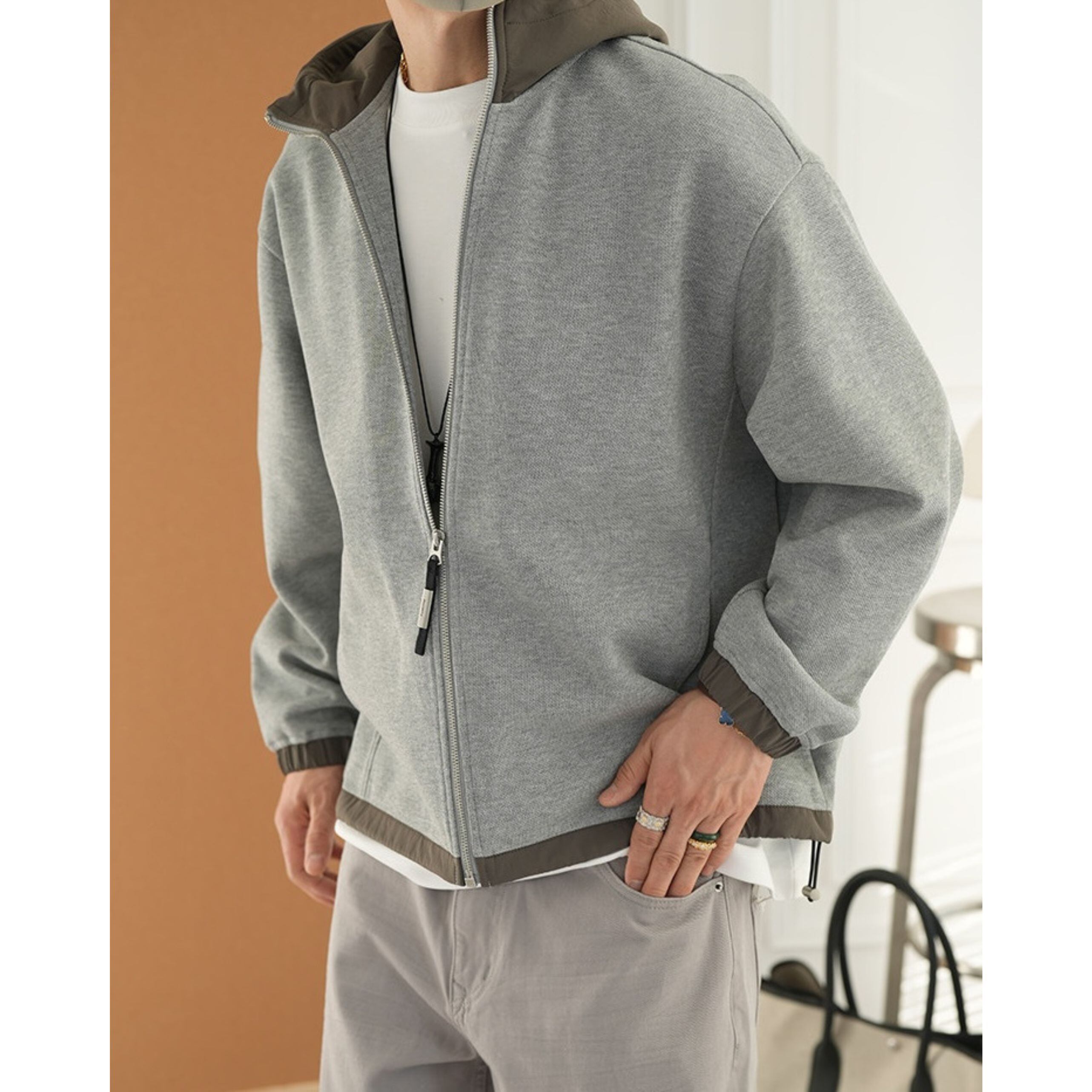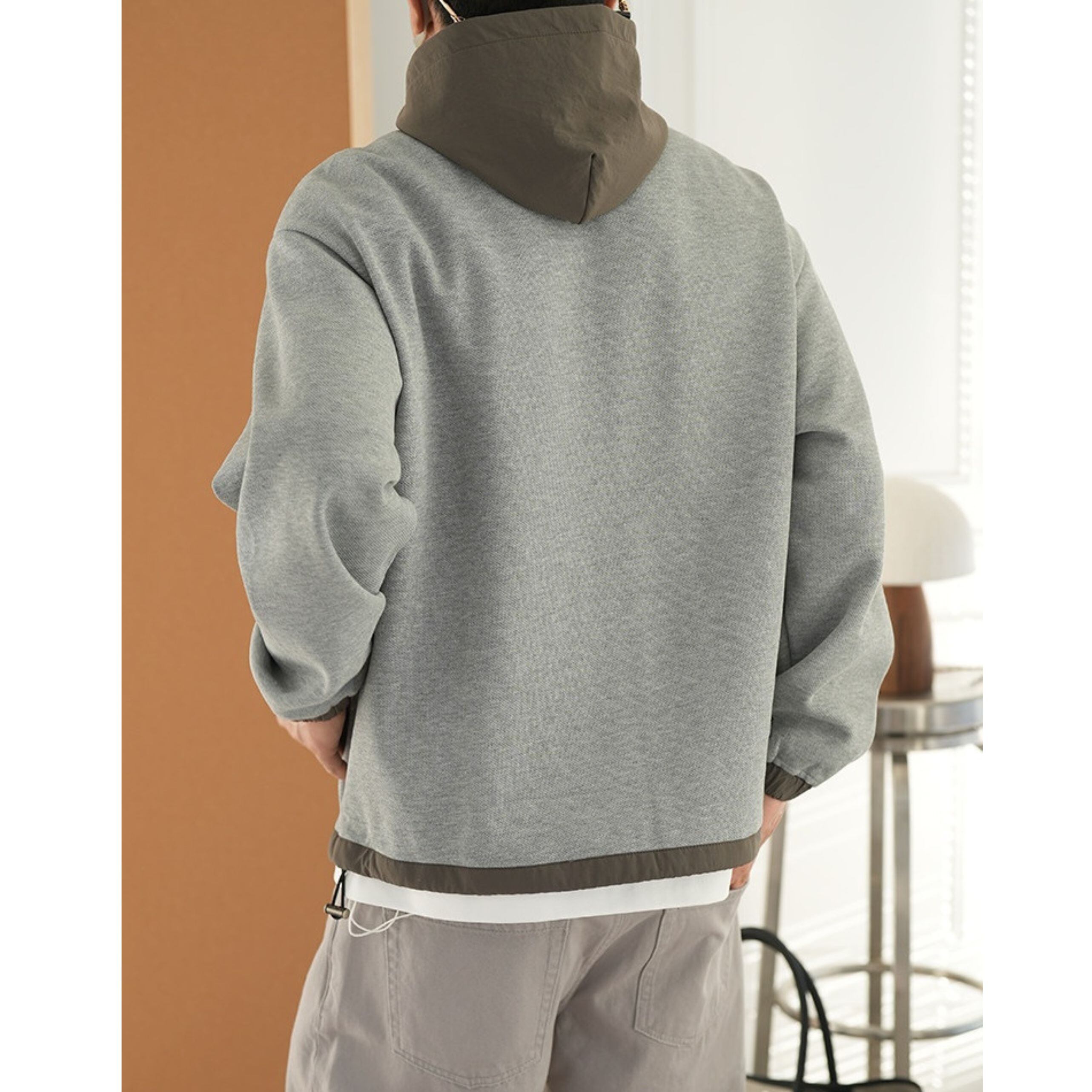 フードの配色が洗練されたアクセントをプラスする一枚。