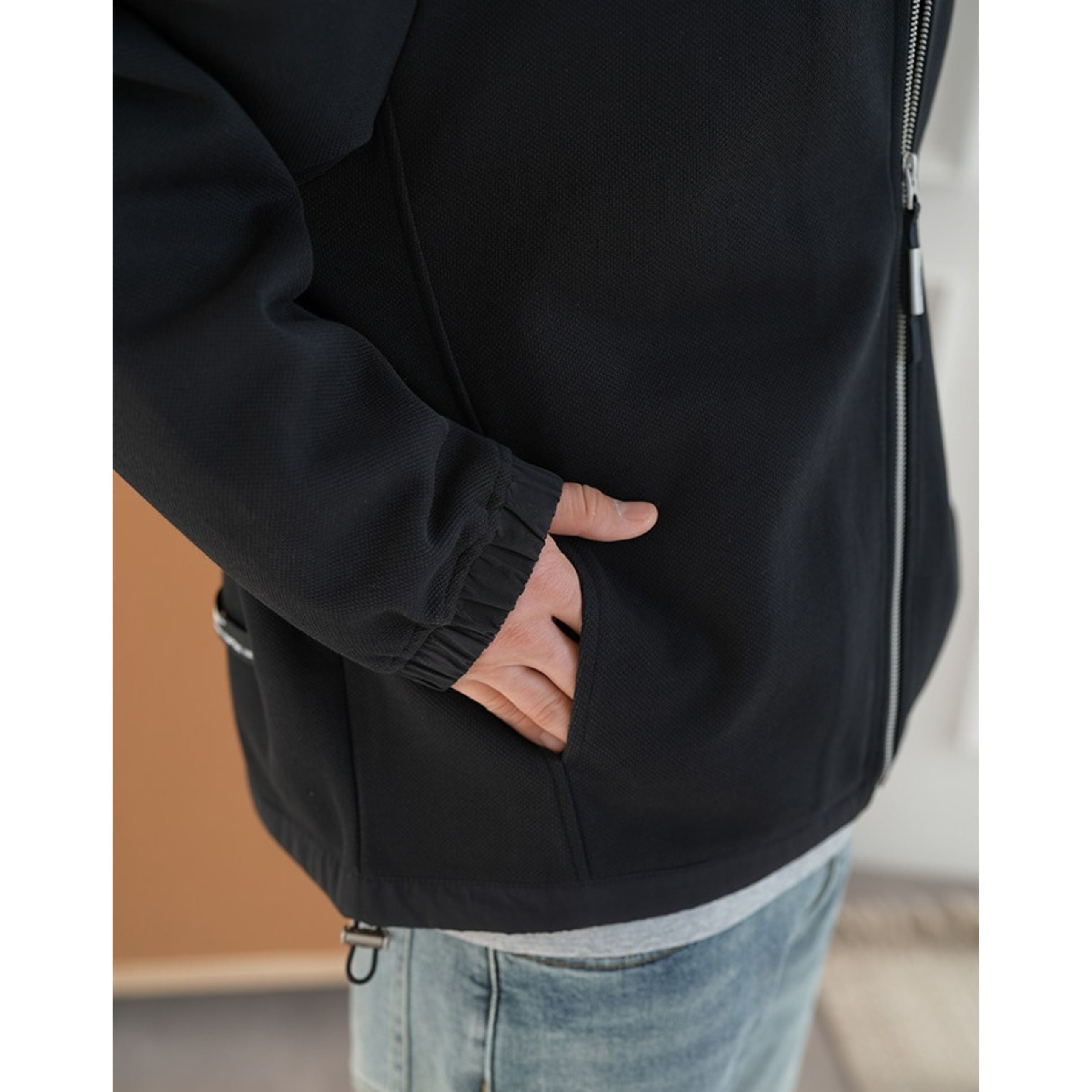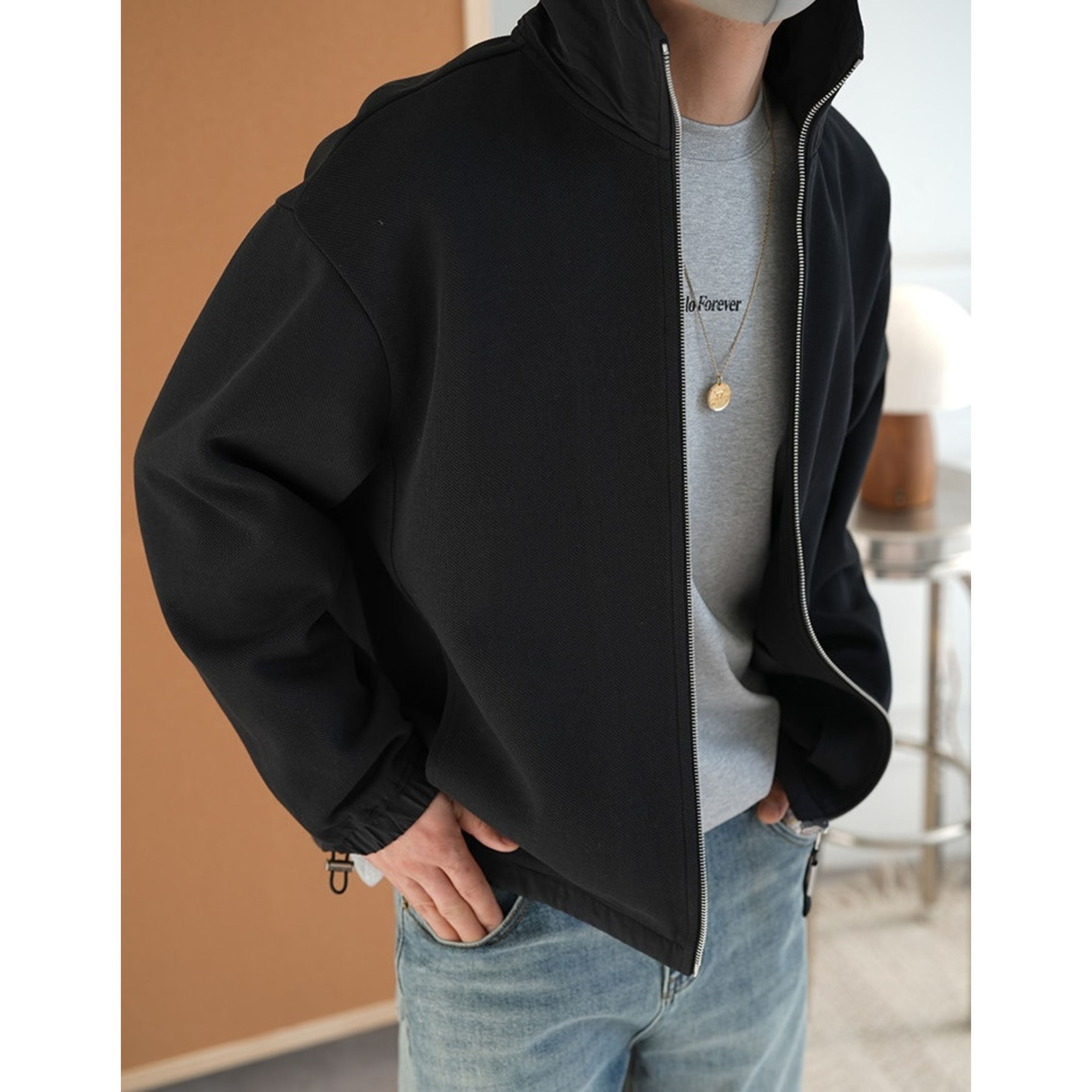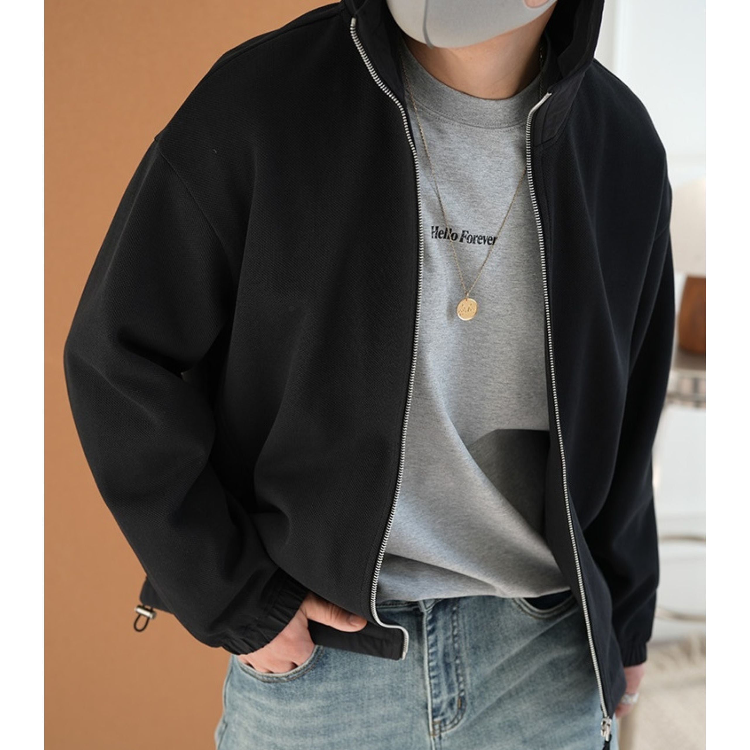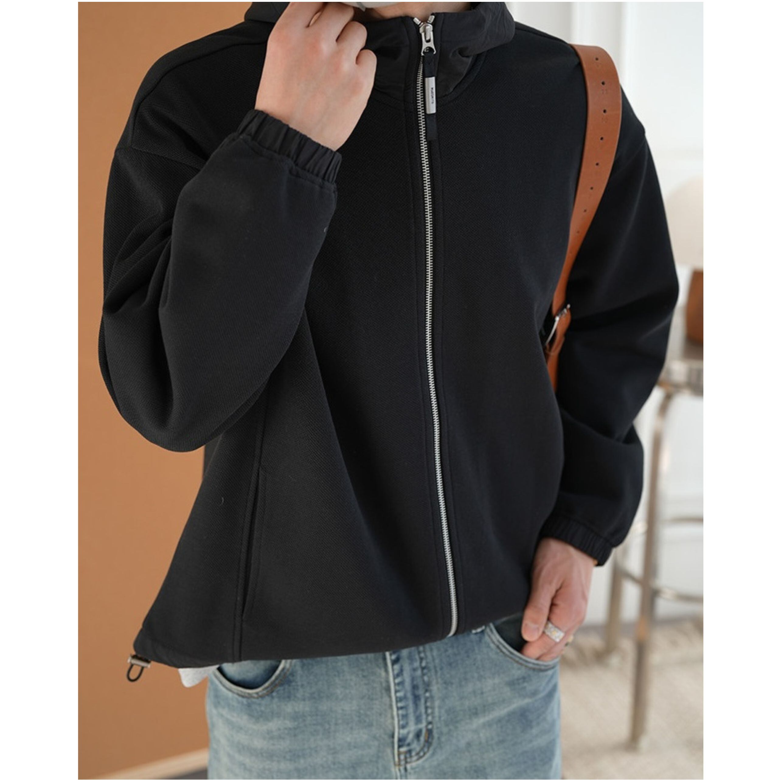 フードの配色が洗練されたアクセントをプラスする一枚。