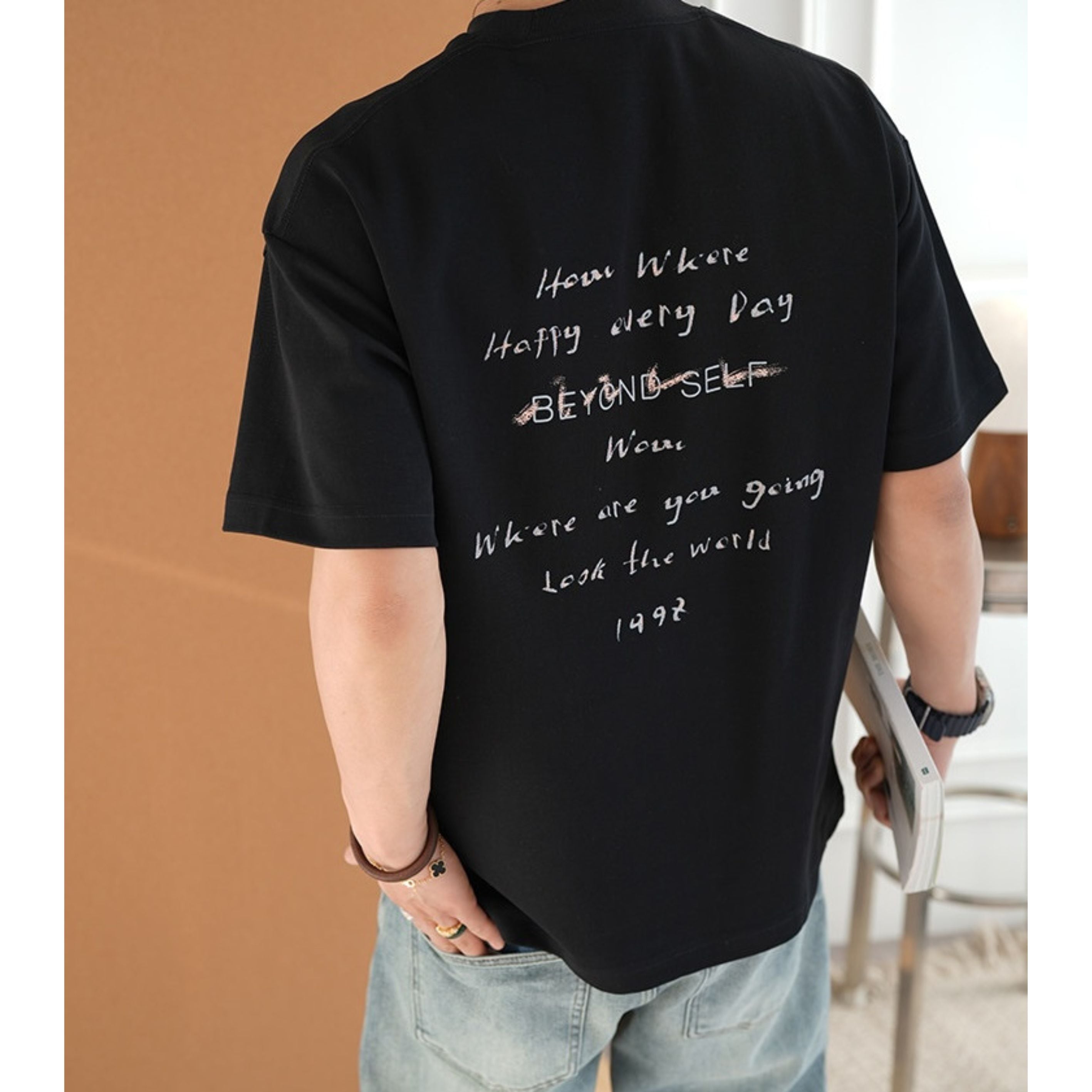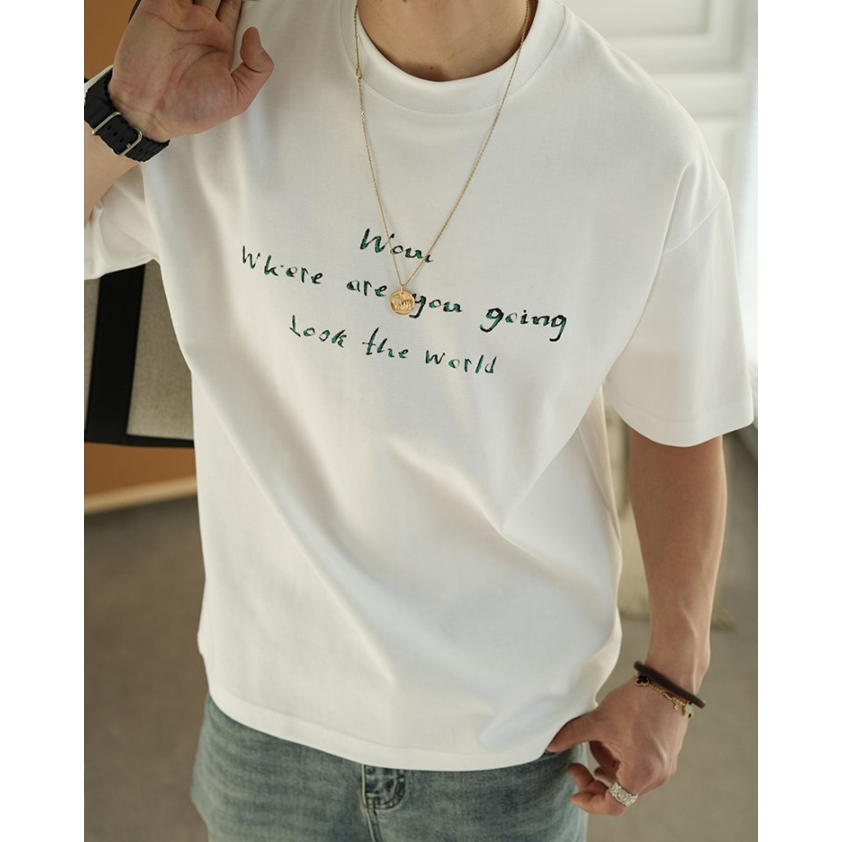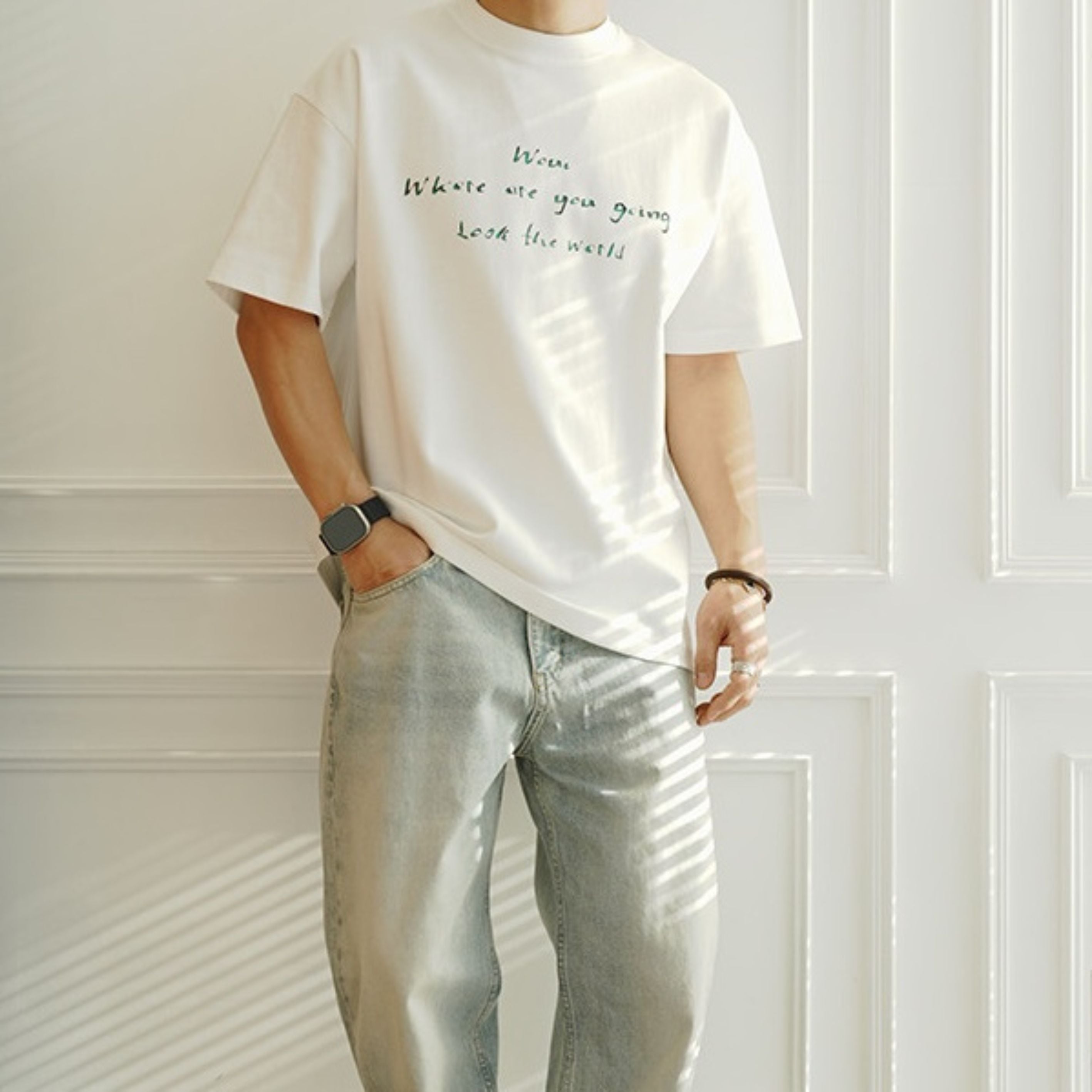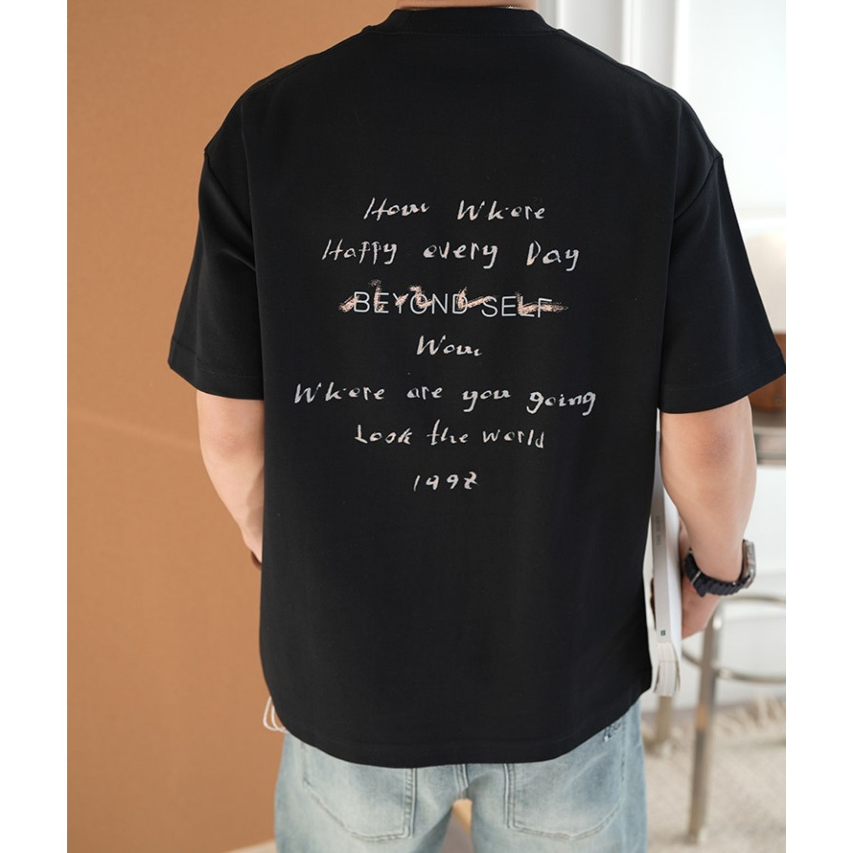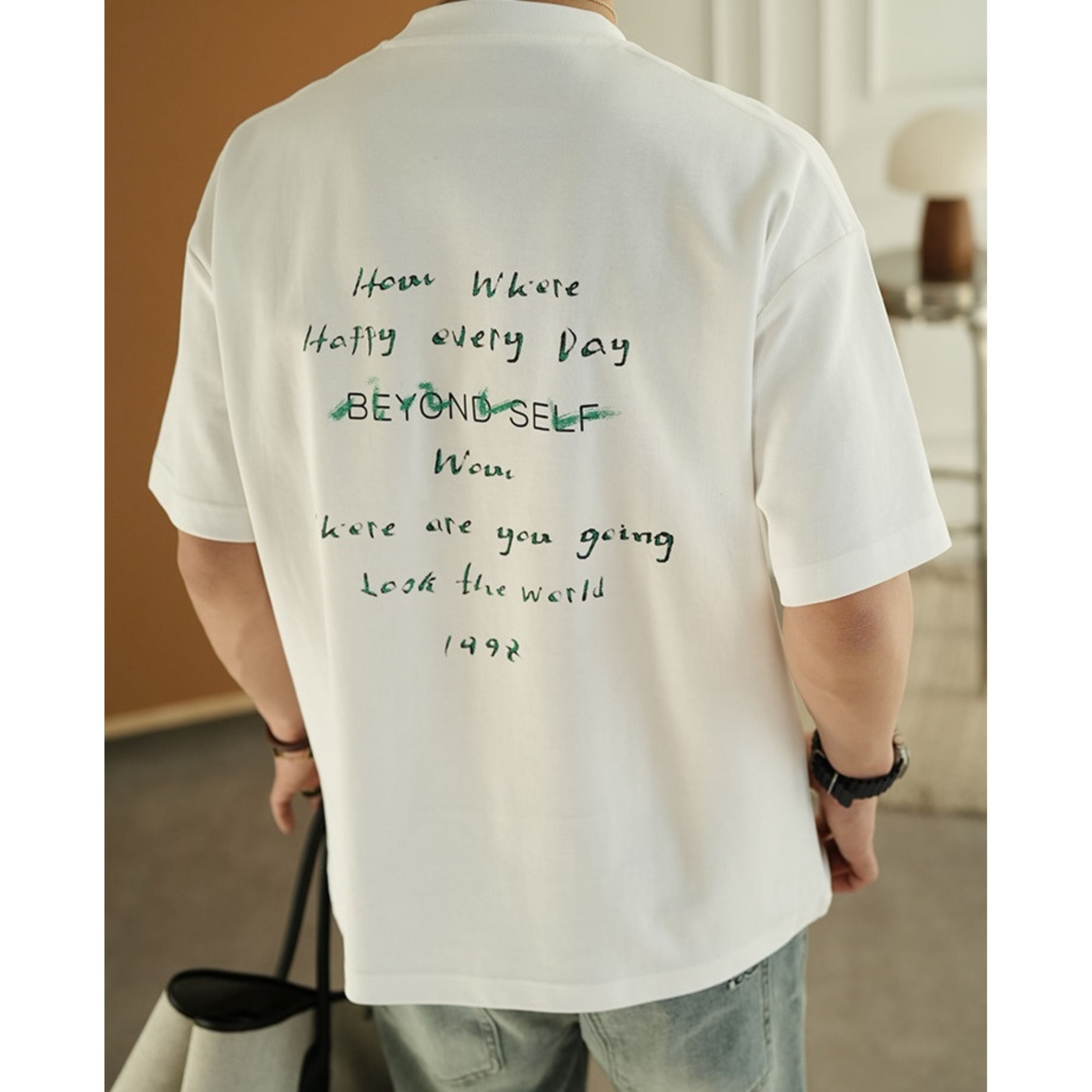 手書き風のレタープリントが印象的なクルーネックTシャツ。