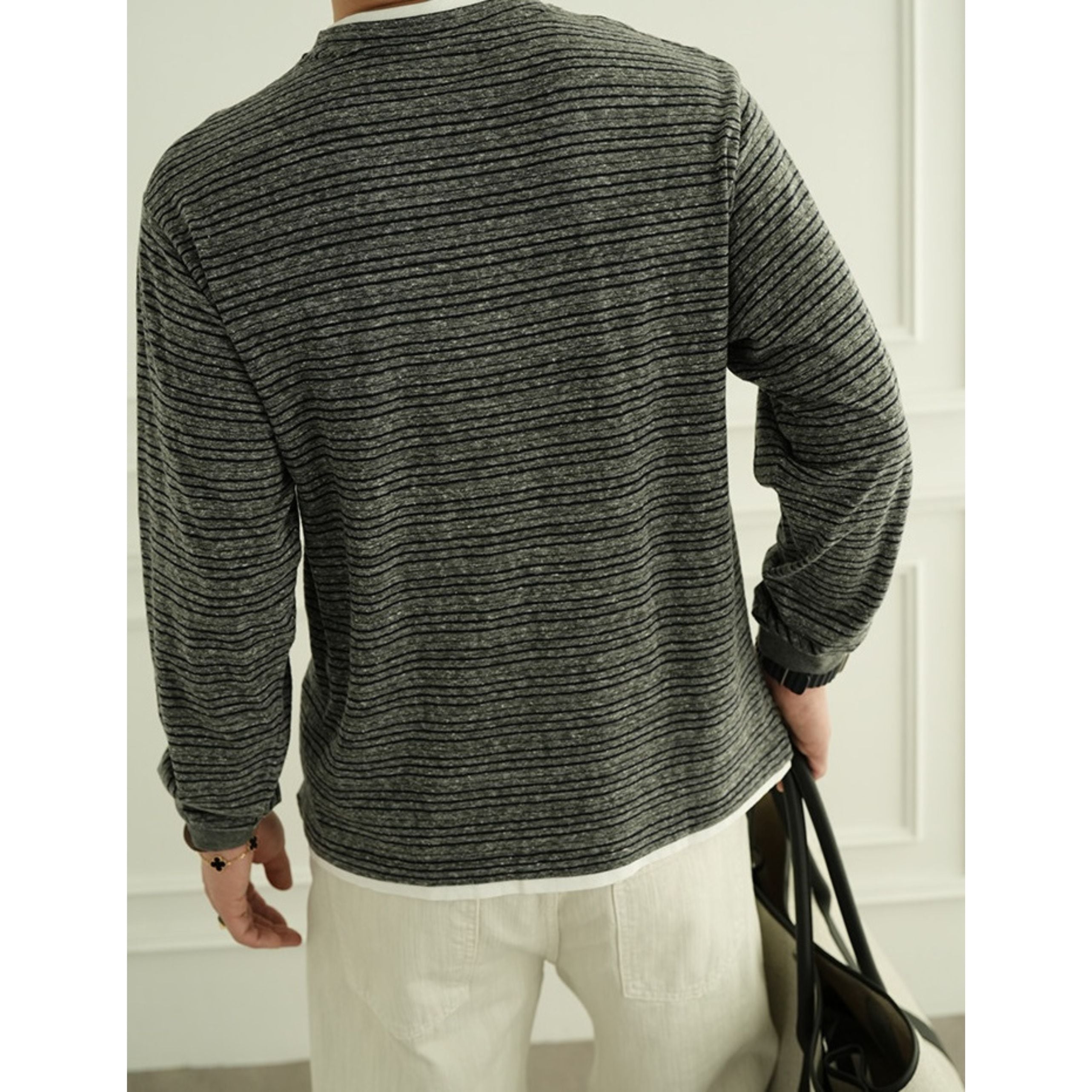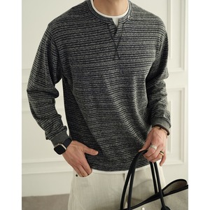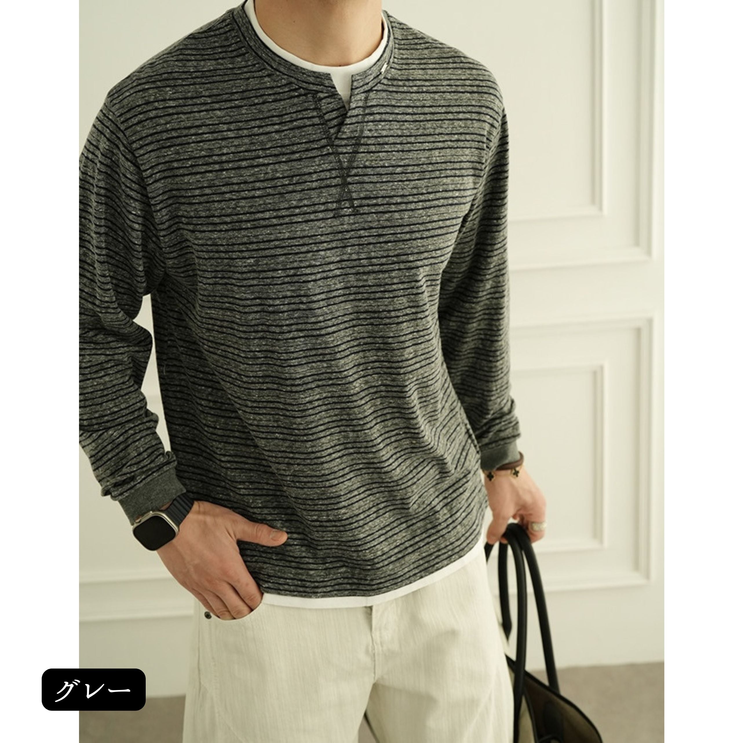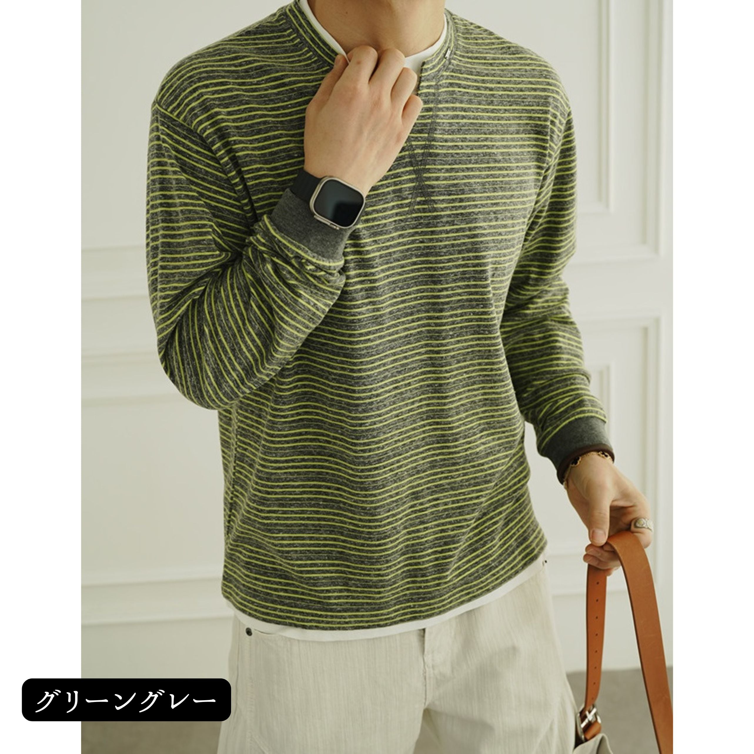 細かなピッチのボーダー柄が上品な印象を与える、