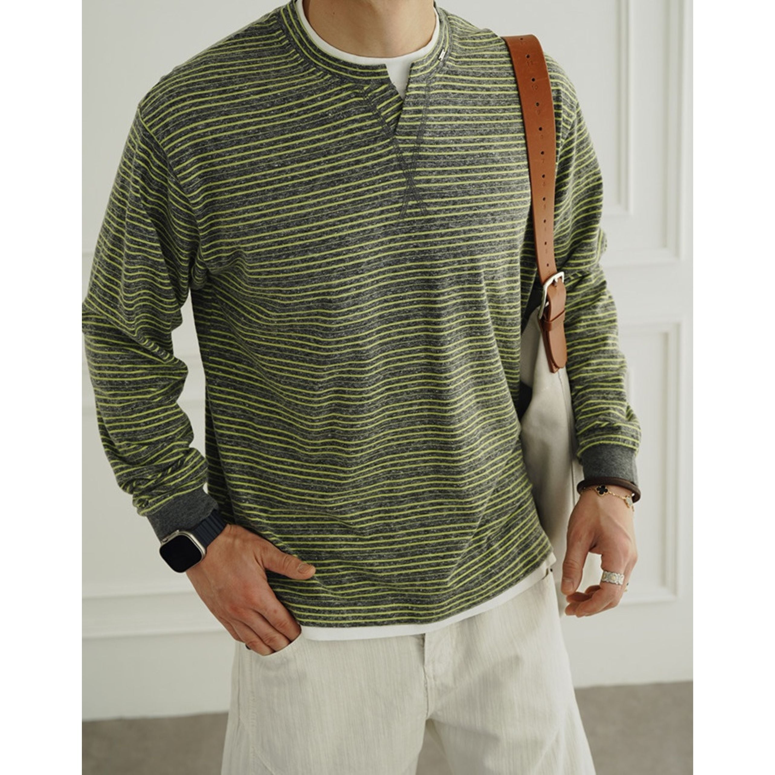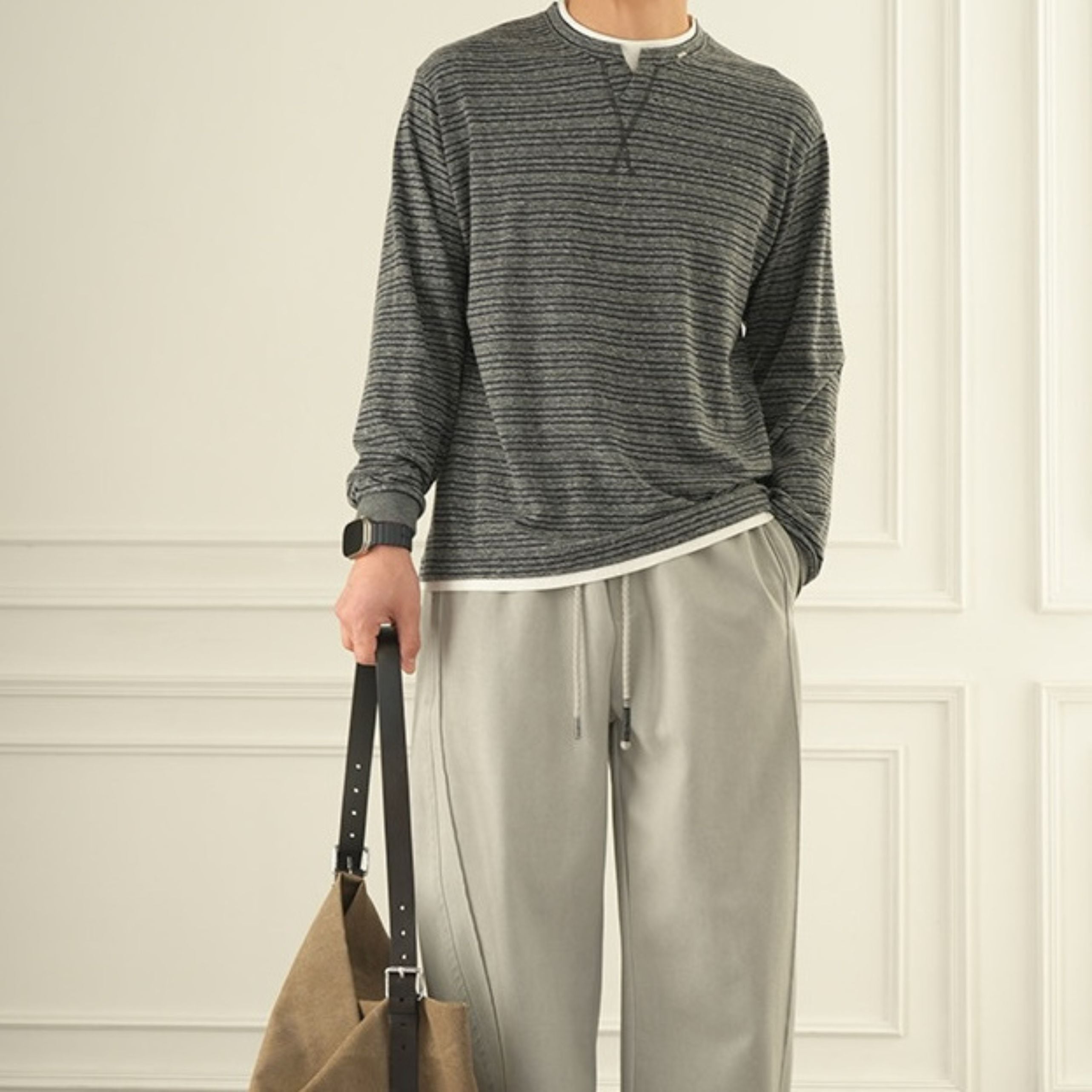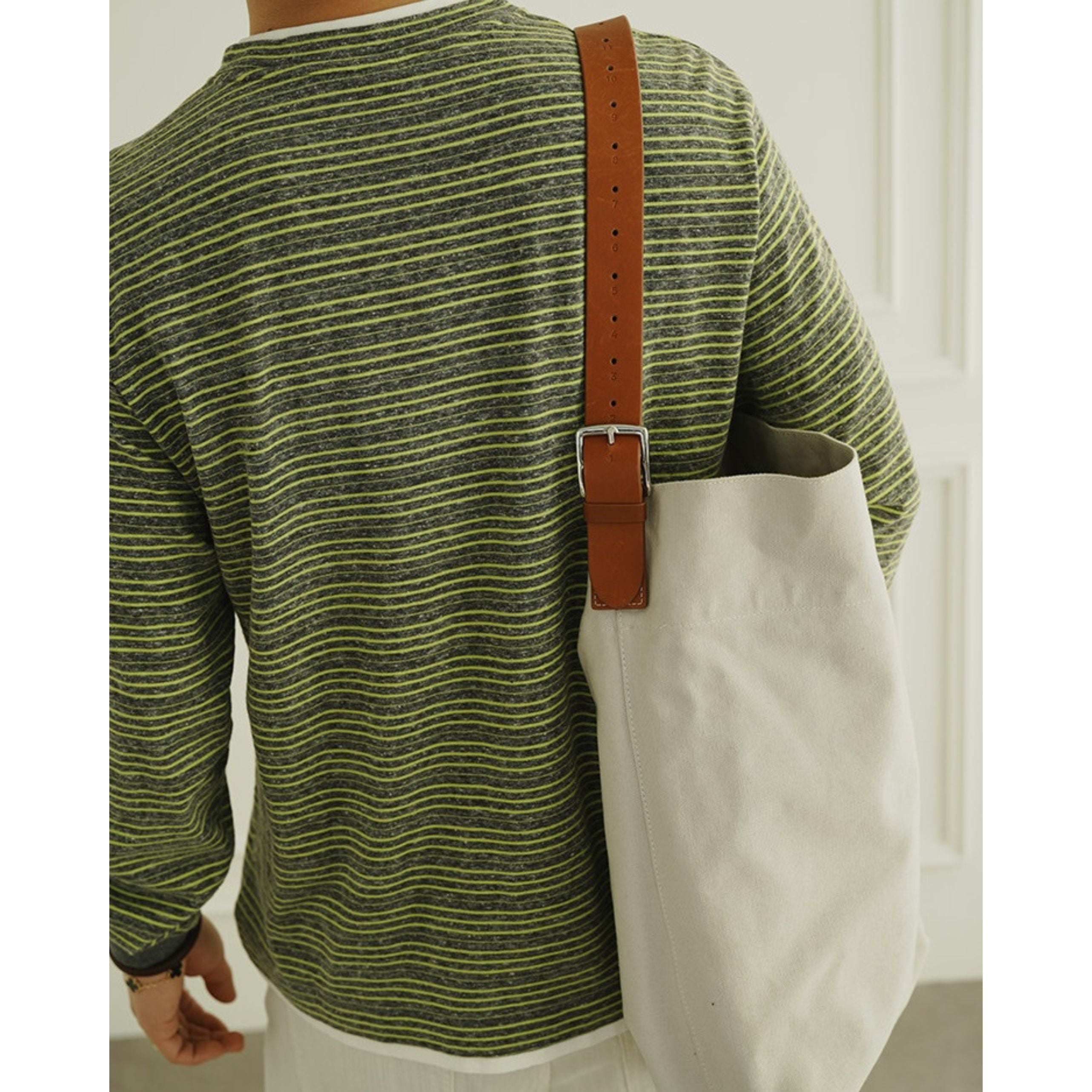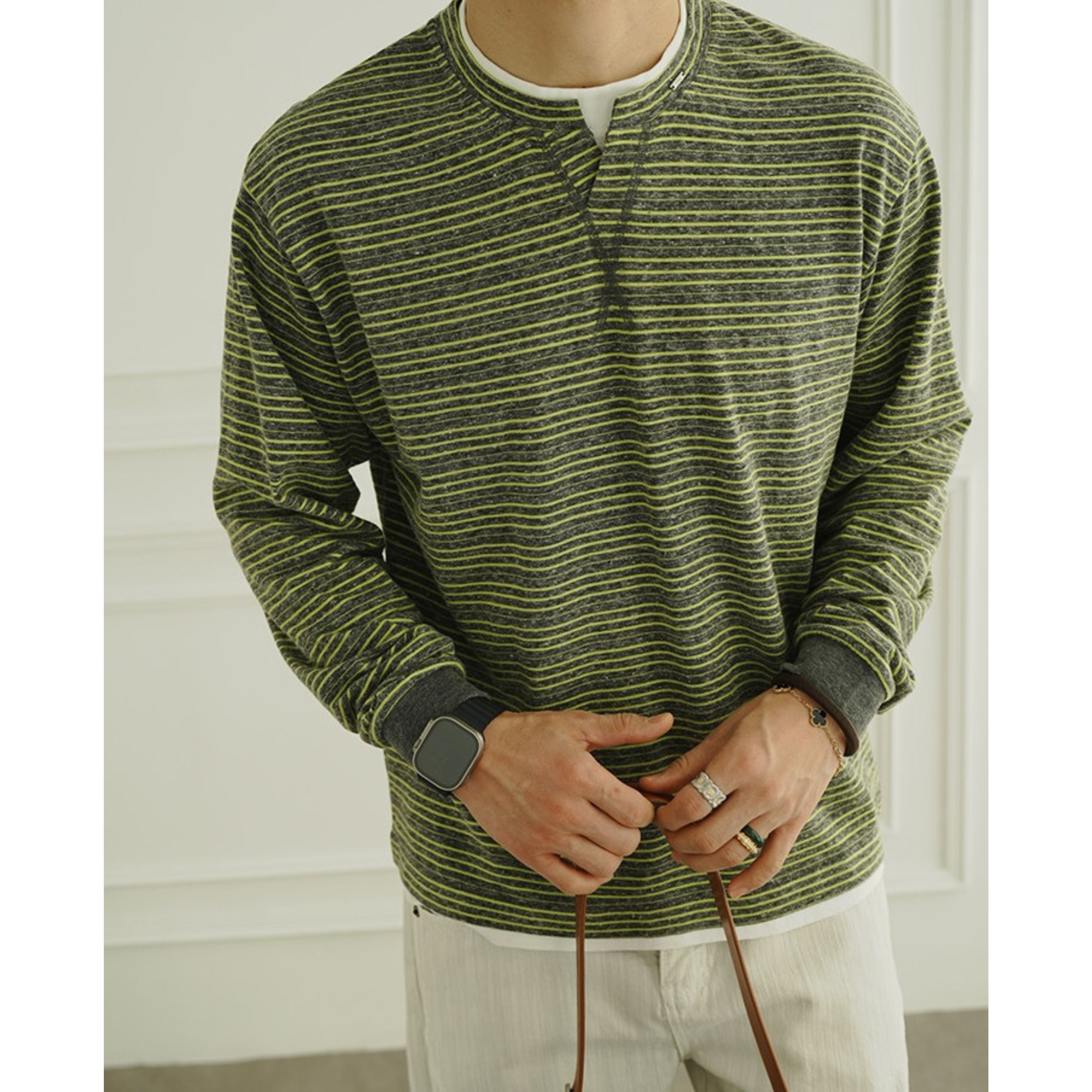 細かなピッチのボーダー柄が上品な印象を与える、
