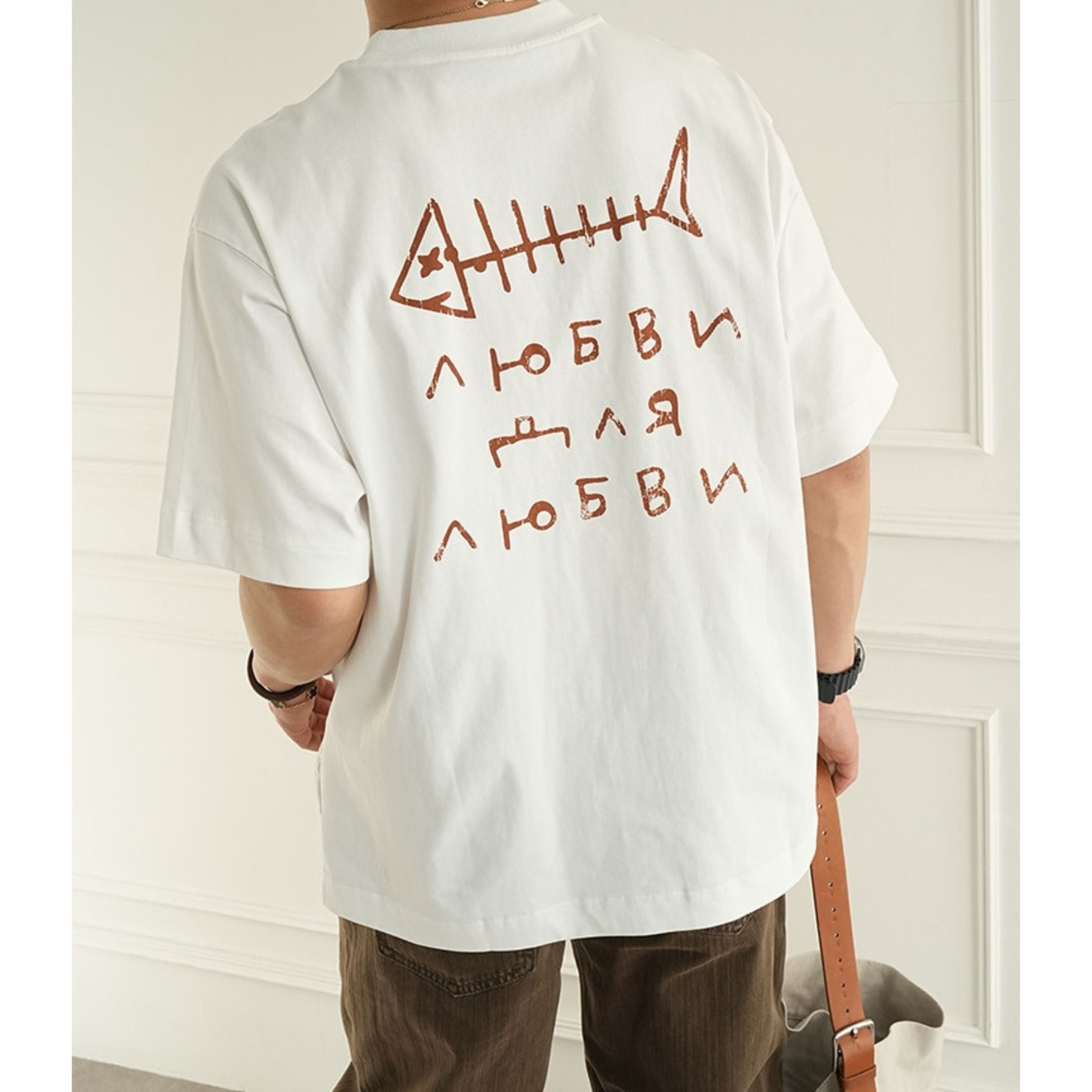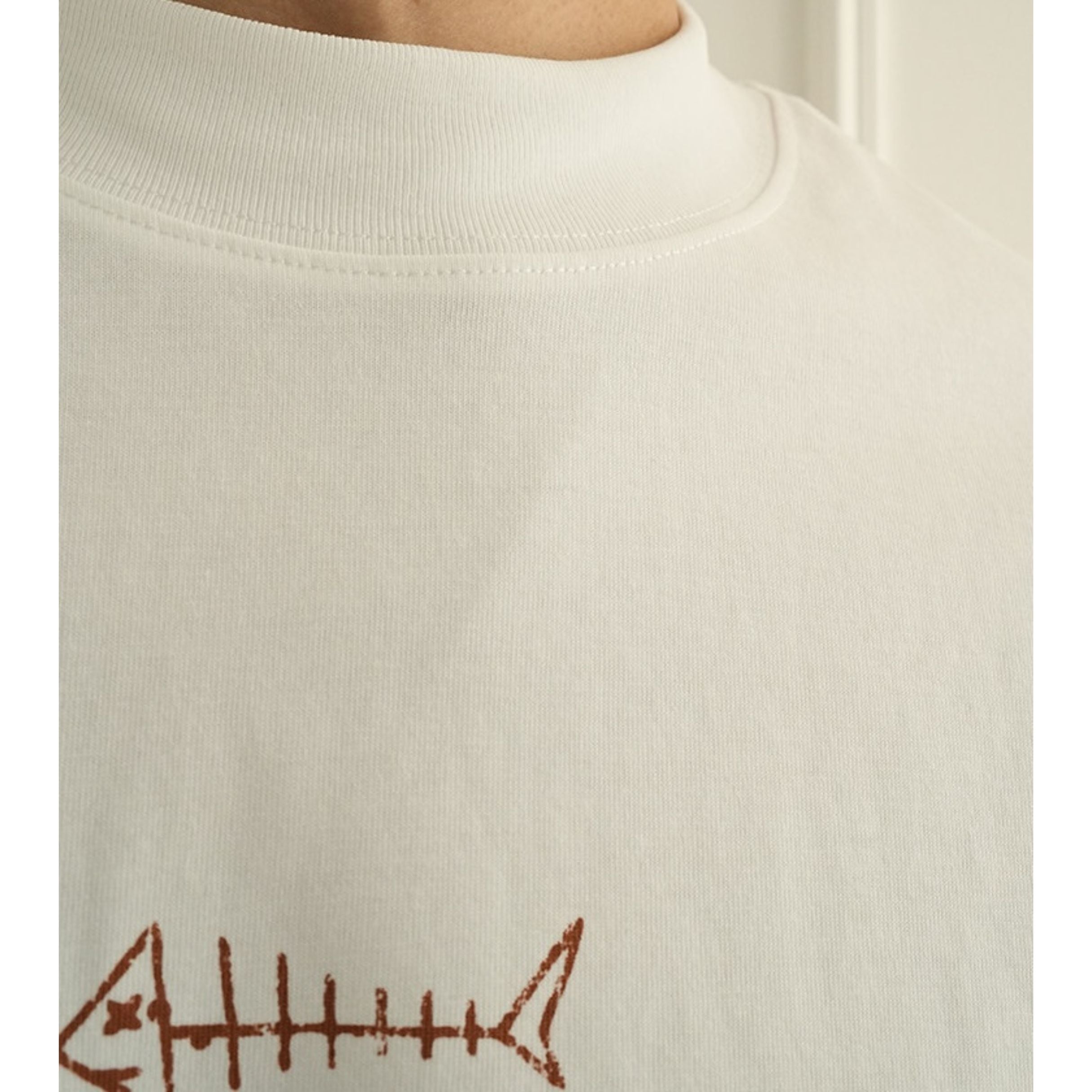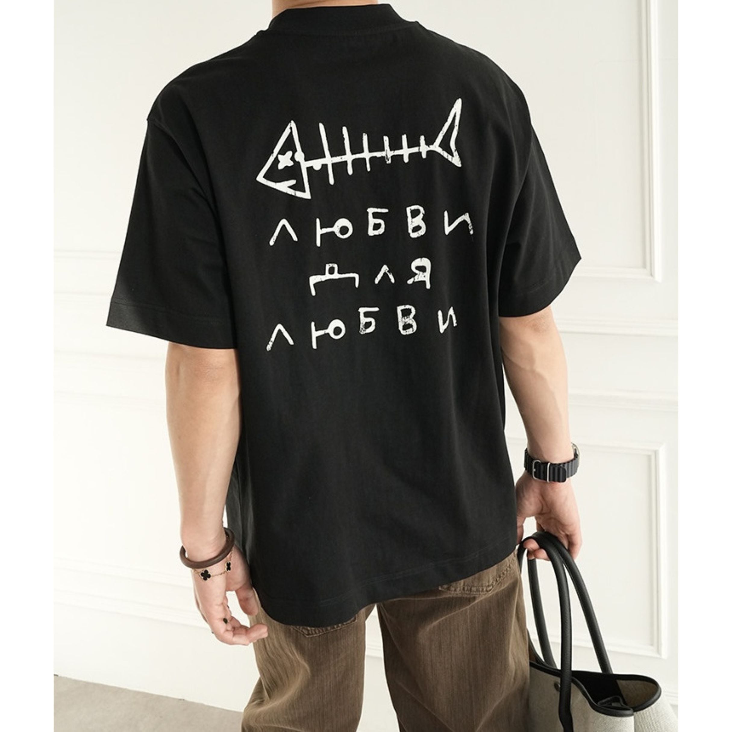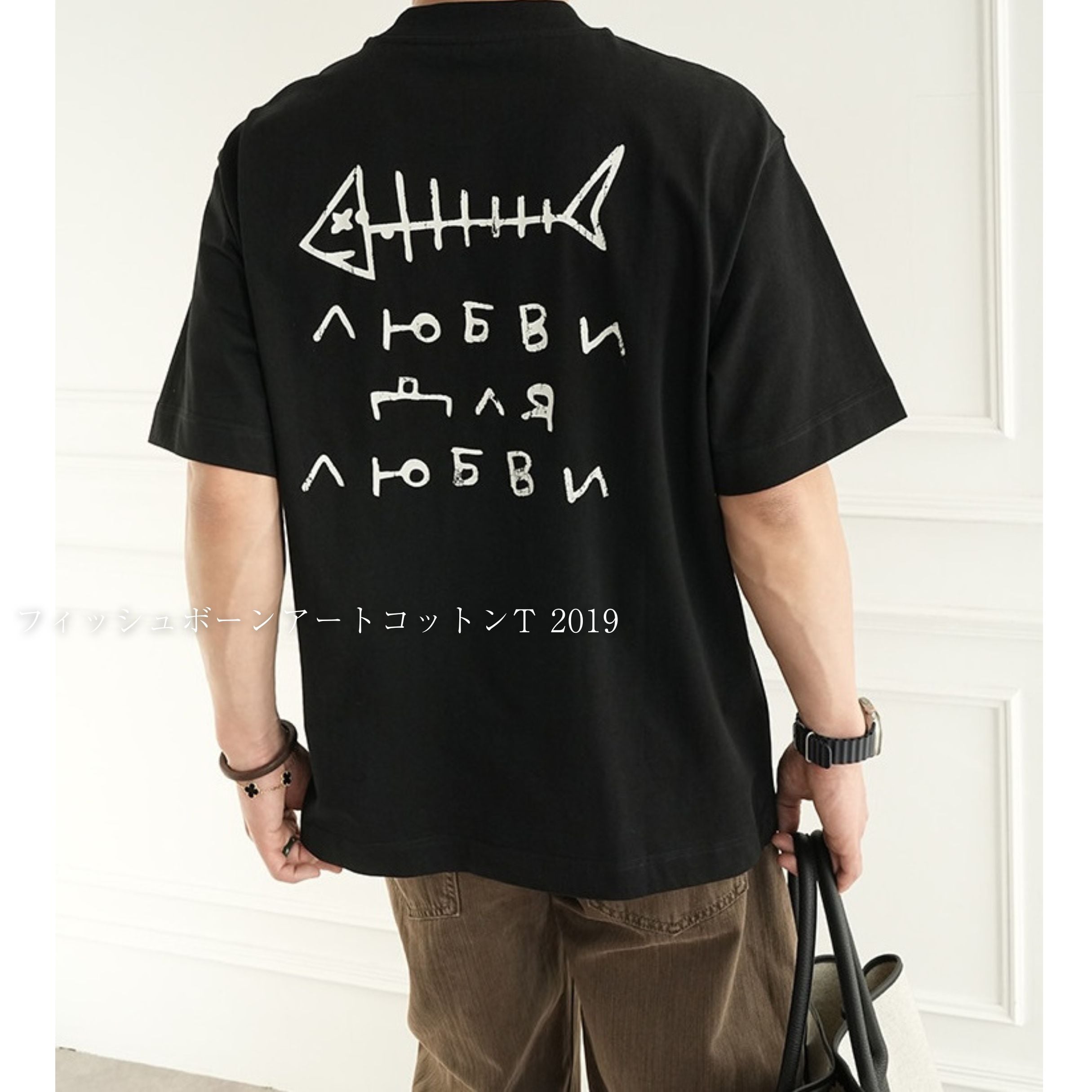 魚の骨をモチーフにした大胆なバックプリントが目を引く、存在感のあるデザインティー。