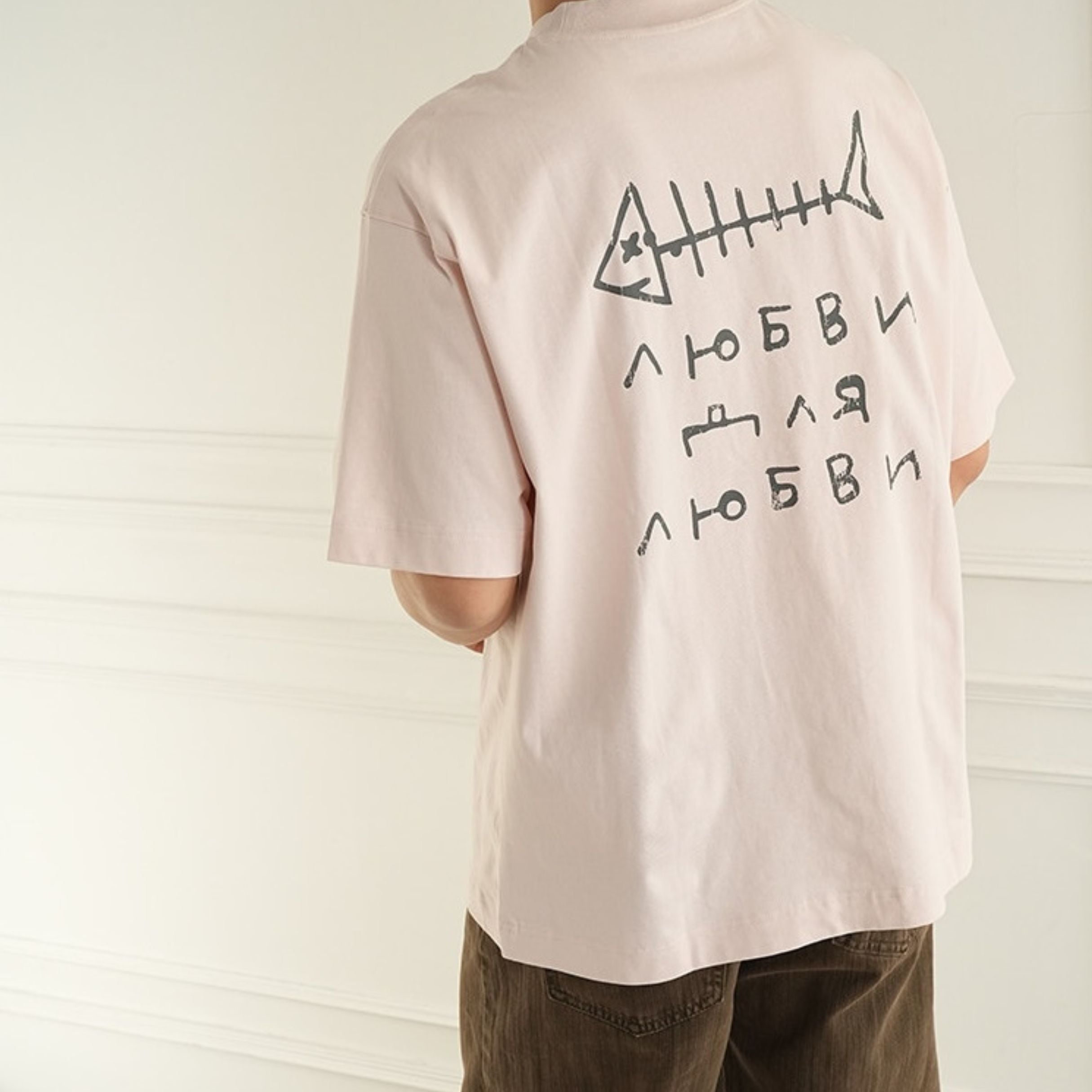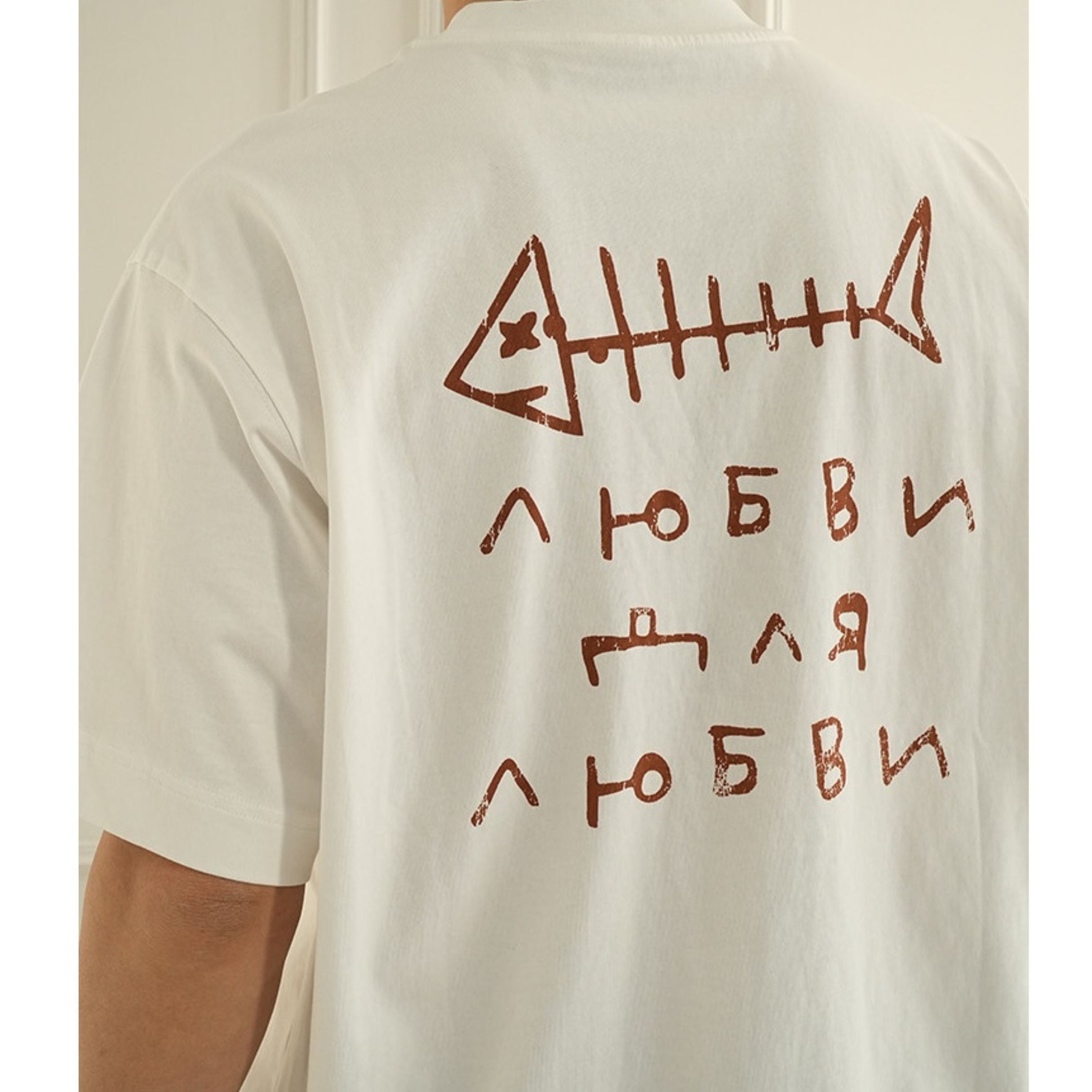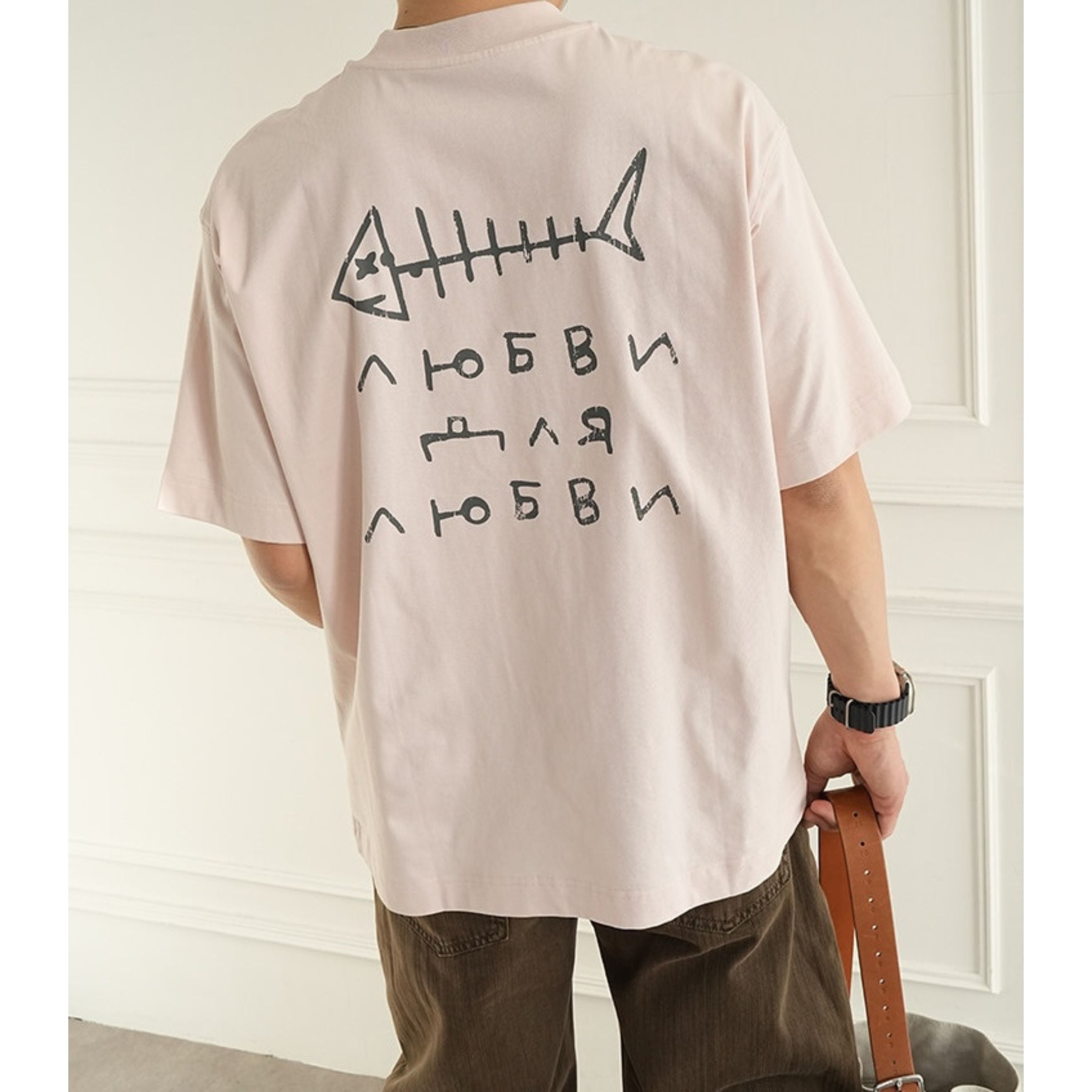 魚の骨をモチーフにした大胆なバックプリントが目を引く、存在感のあるデザインティー。