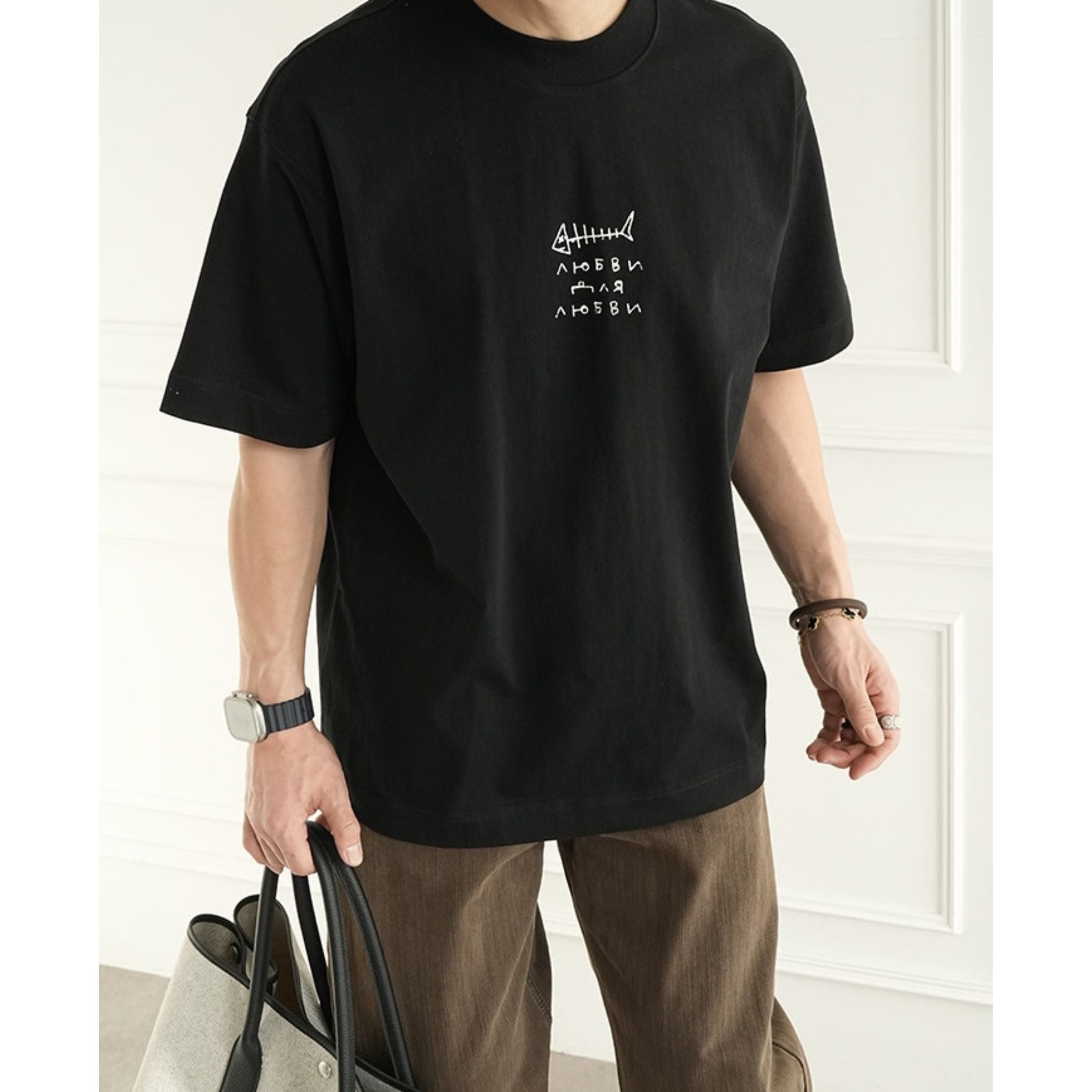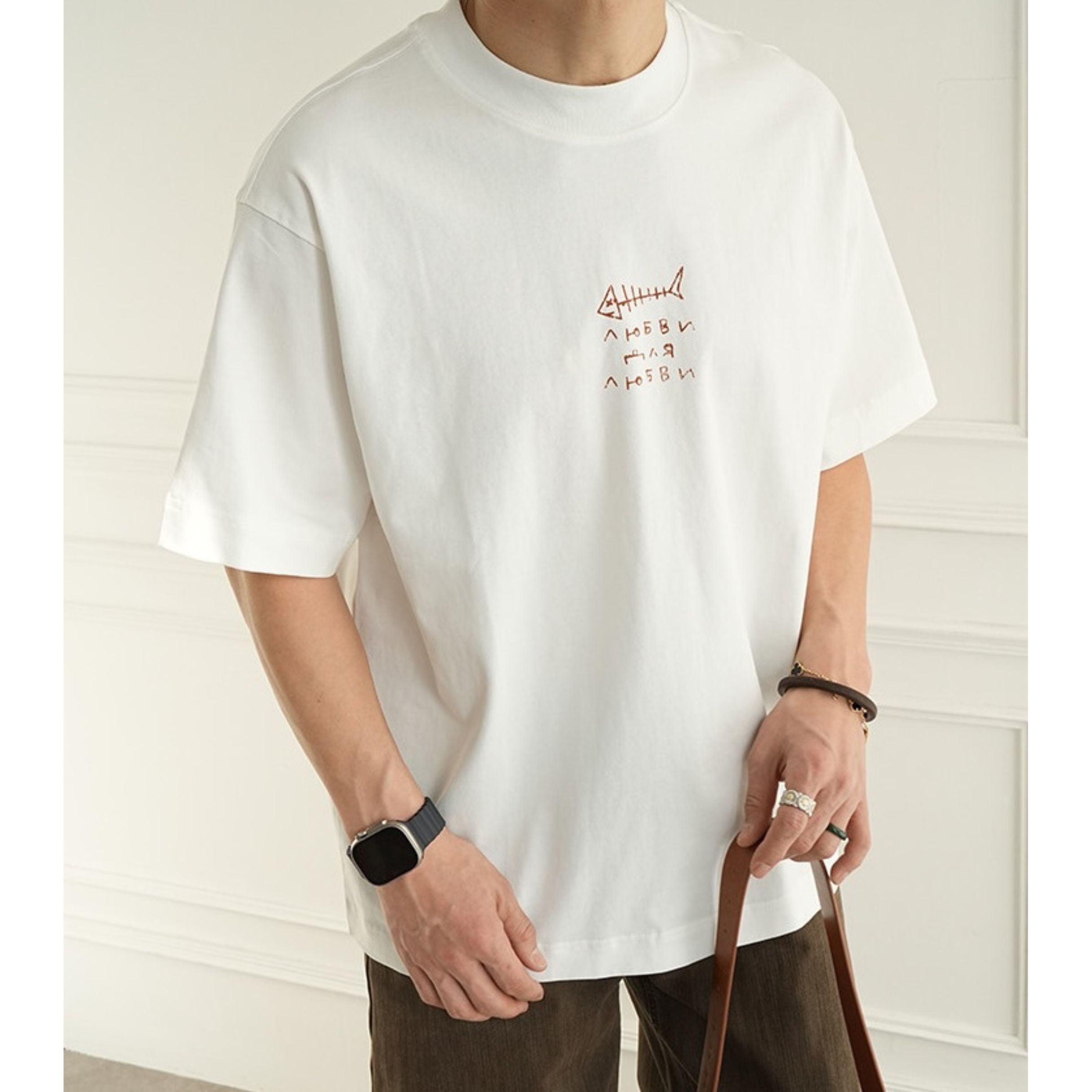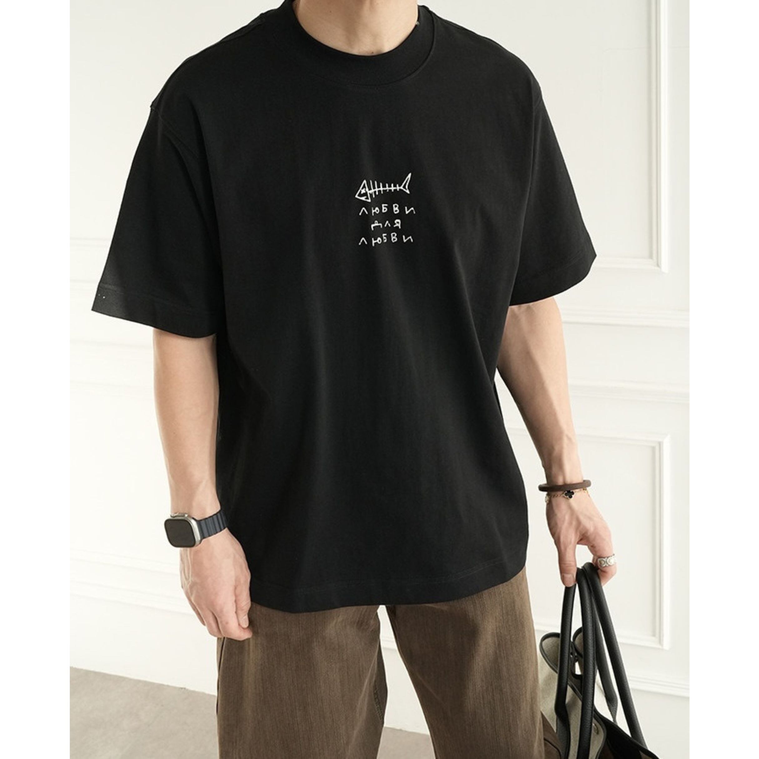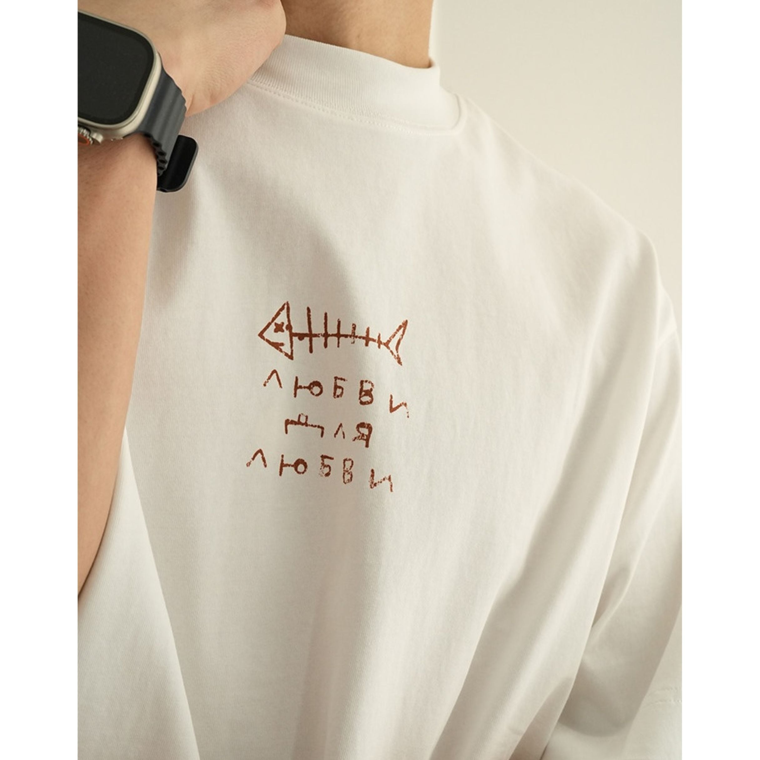 魚の骨をモチーフにした大胆なバックプリントが目を引く、存在感のあるデザインティー。