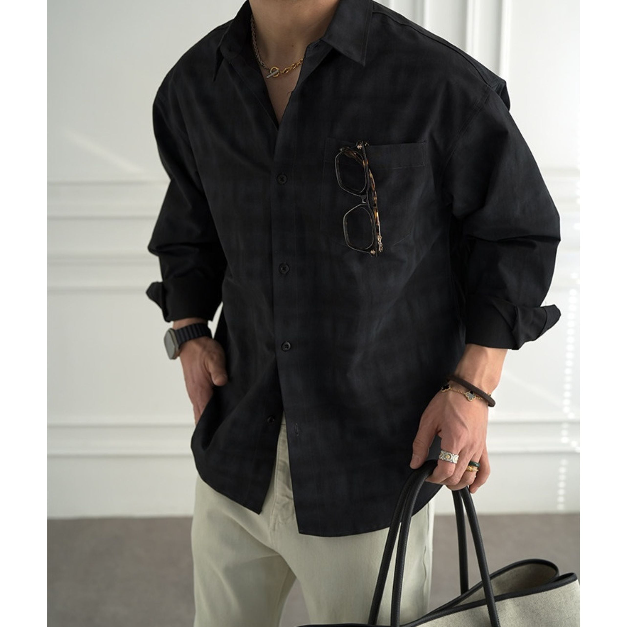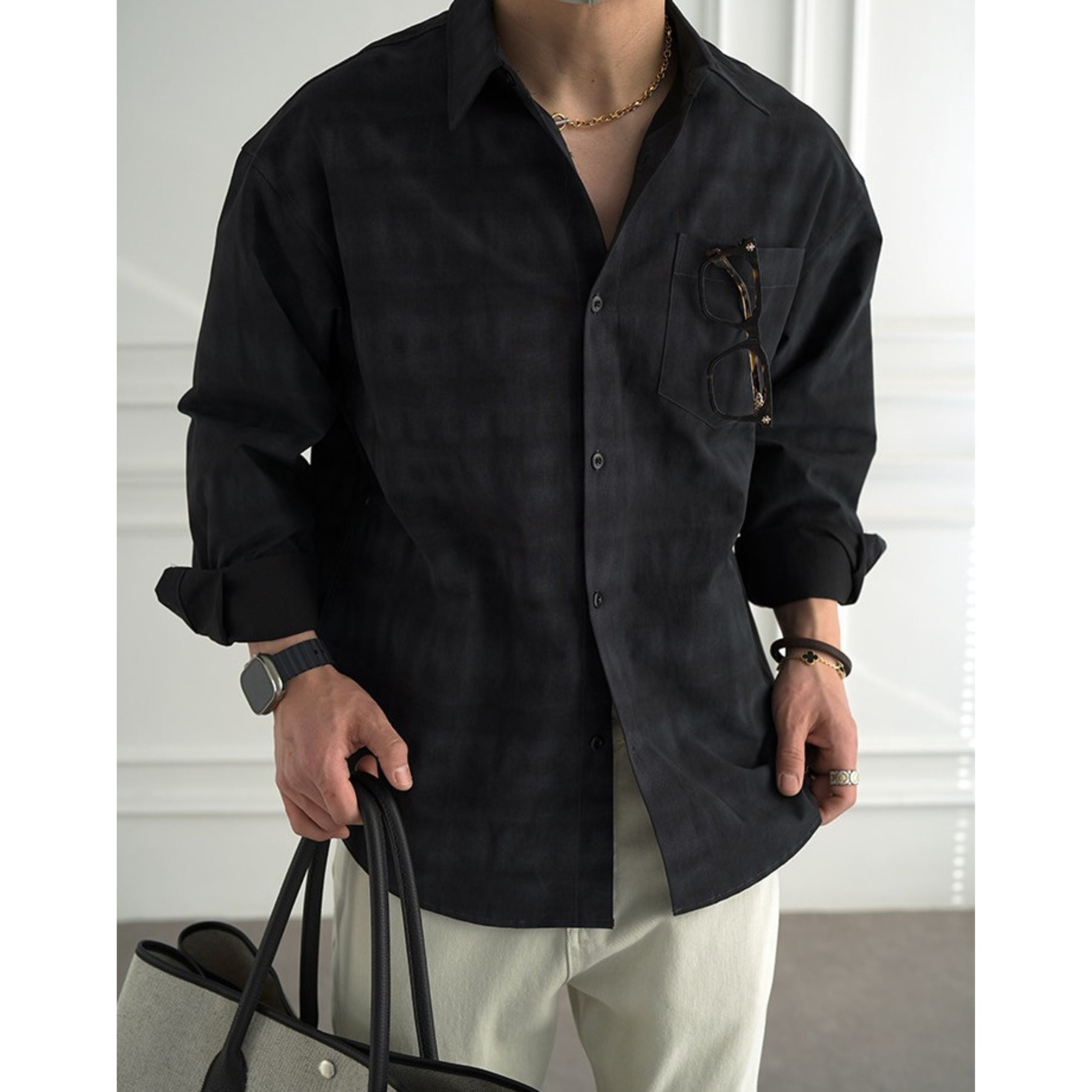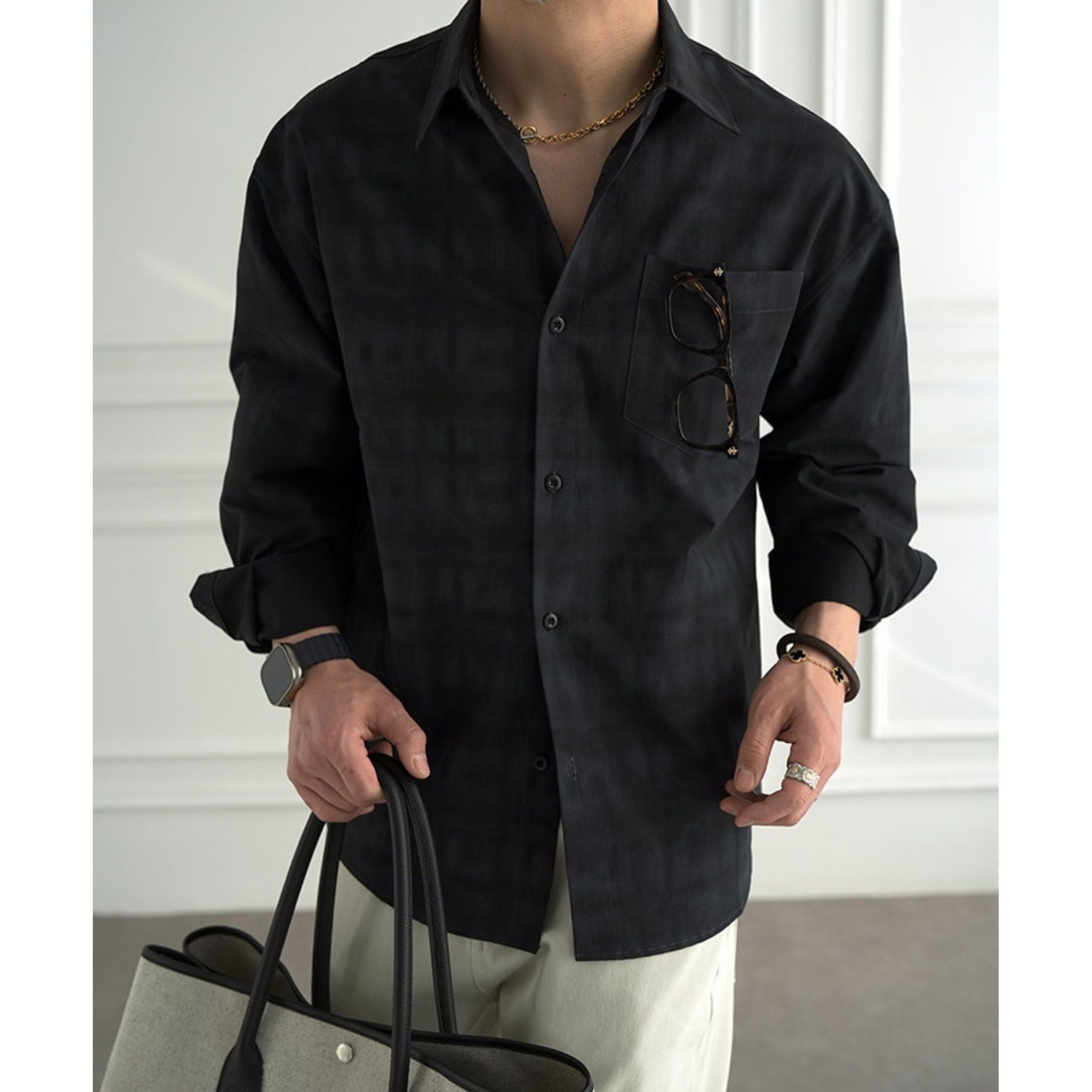 グレーとブラックの落ち着いたトーンが、大人の余裕を感じさせる一枚です。