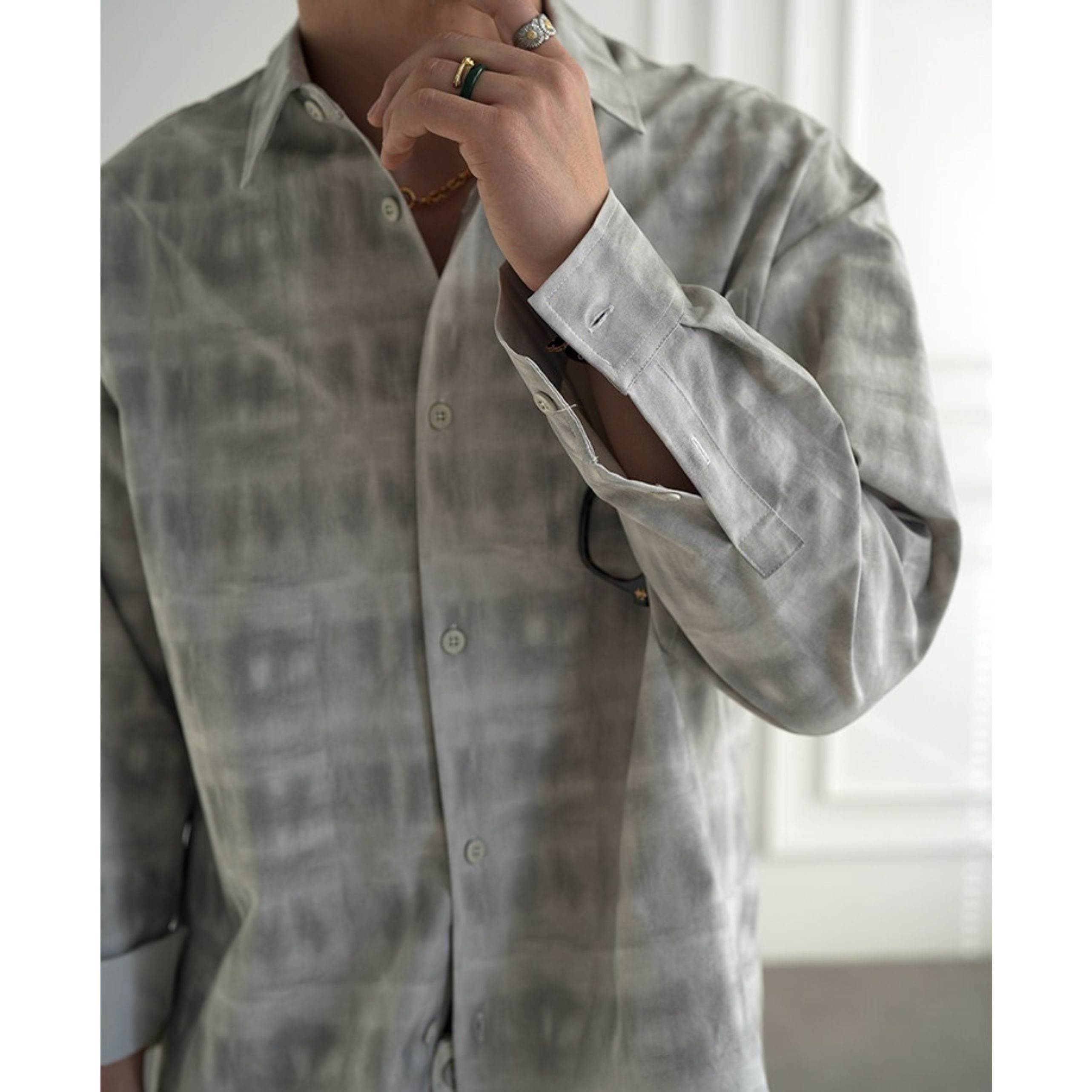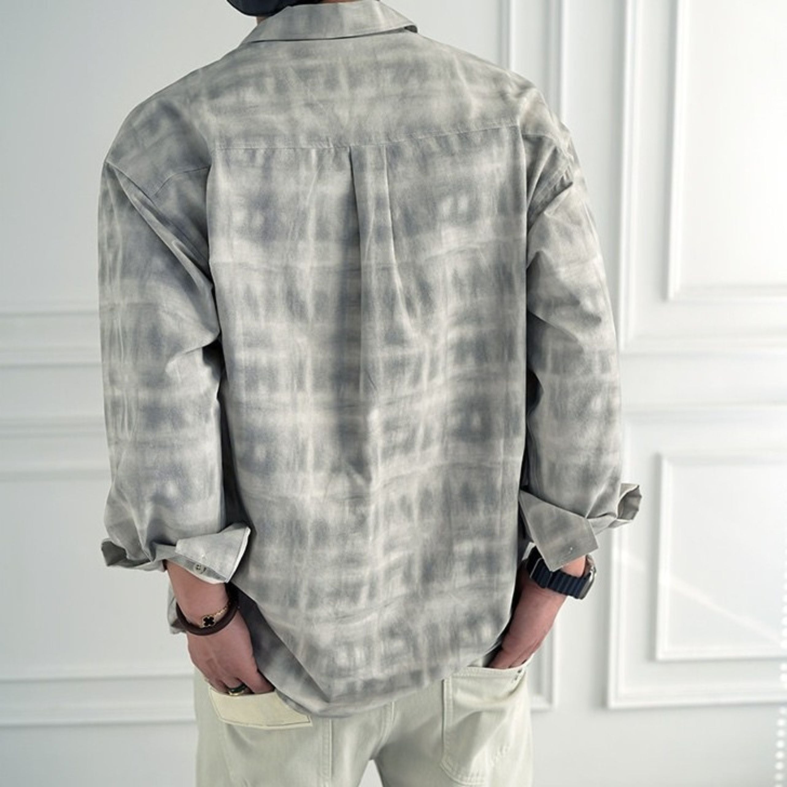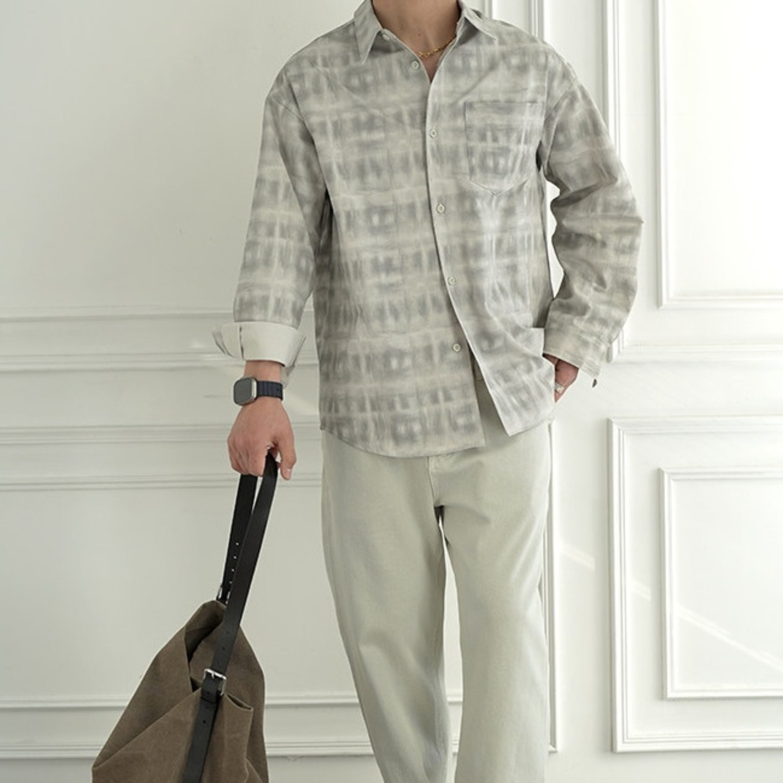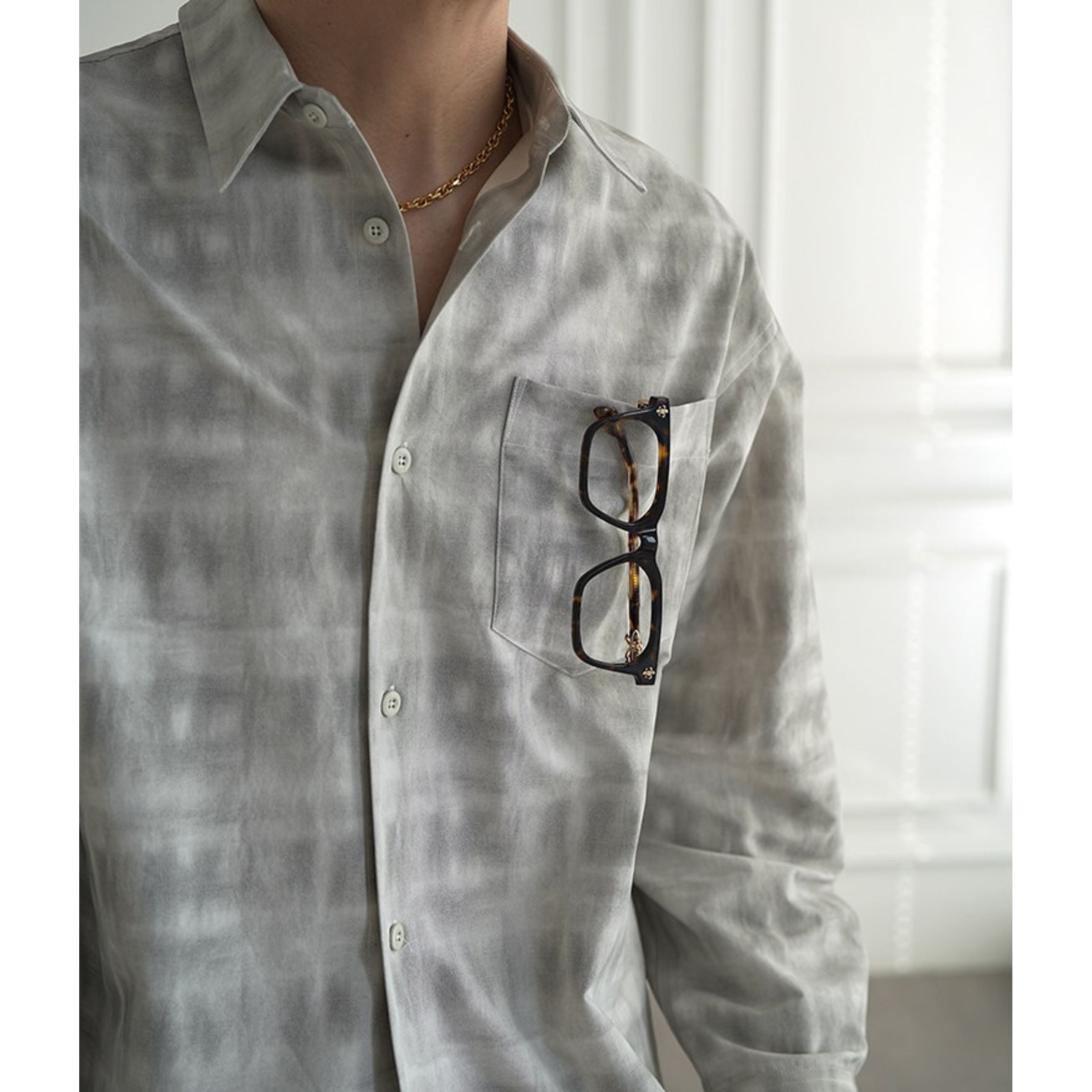 穏淡くにじむようなニュアンスチェックが印象的なロングスリーブシャツ。