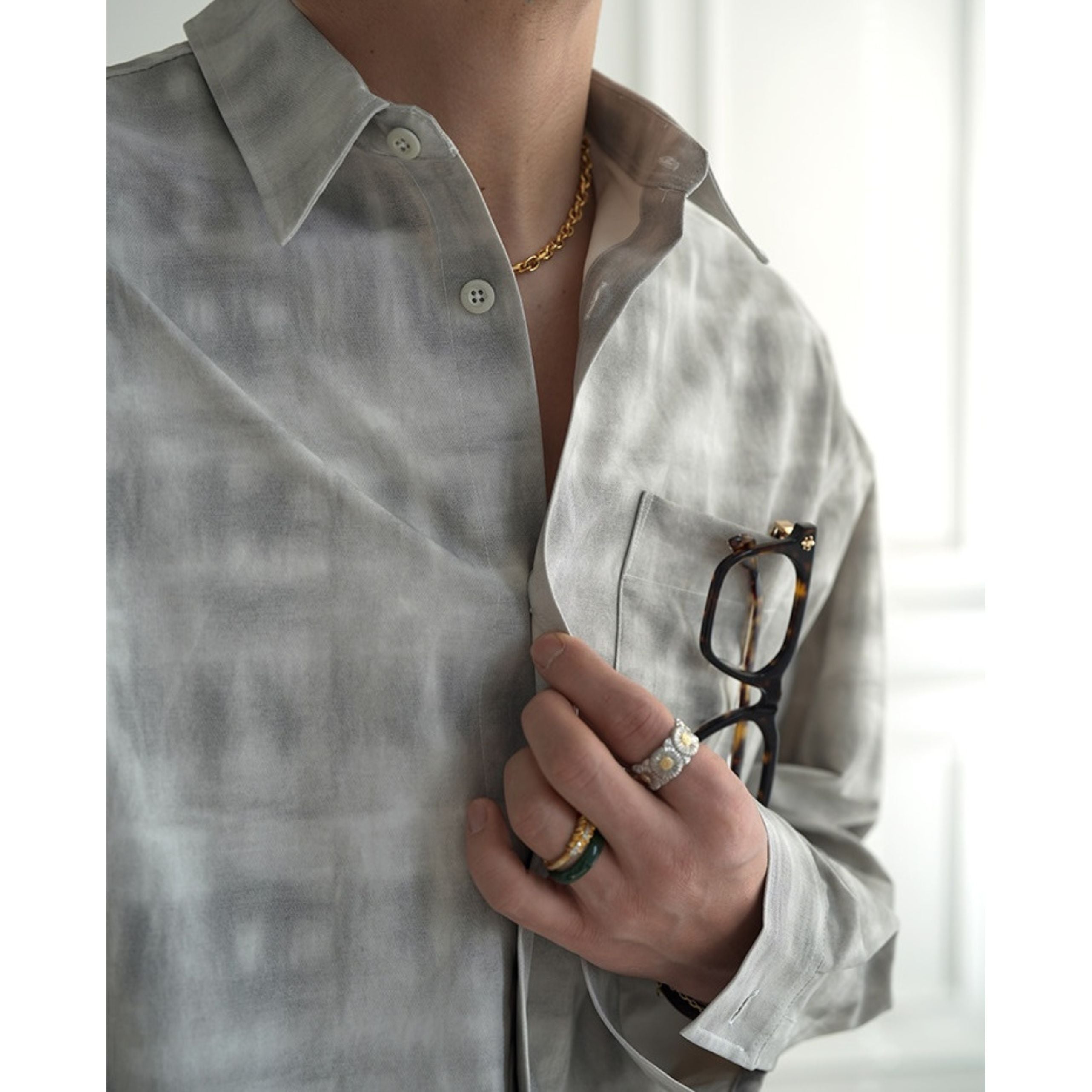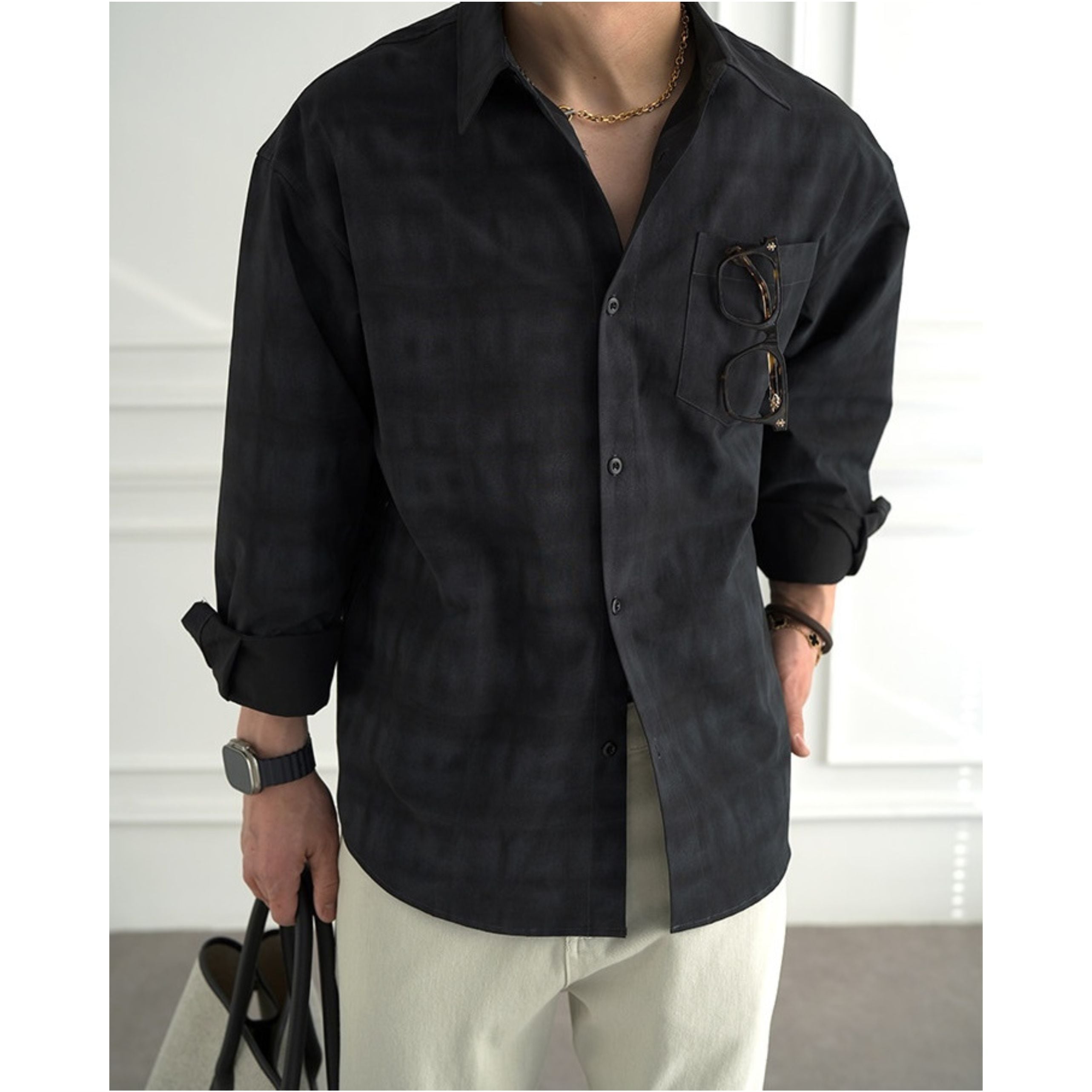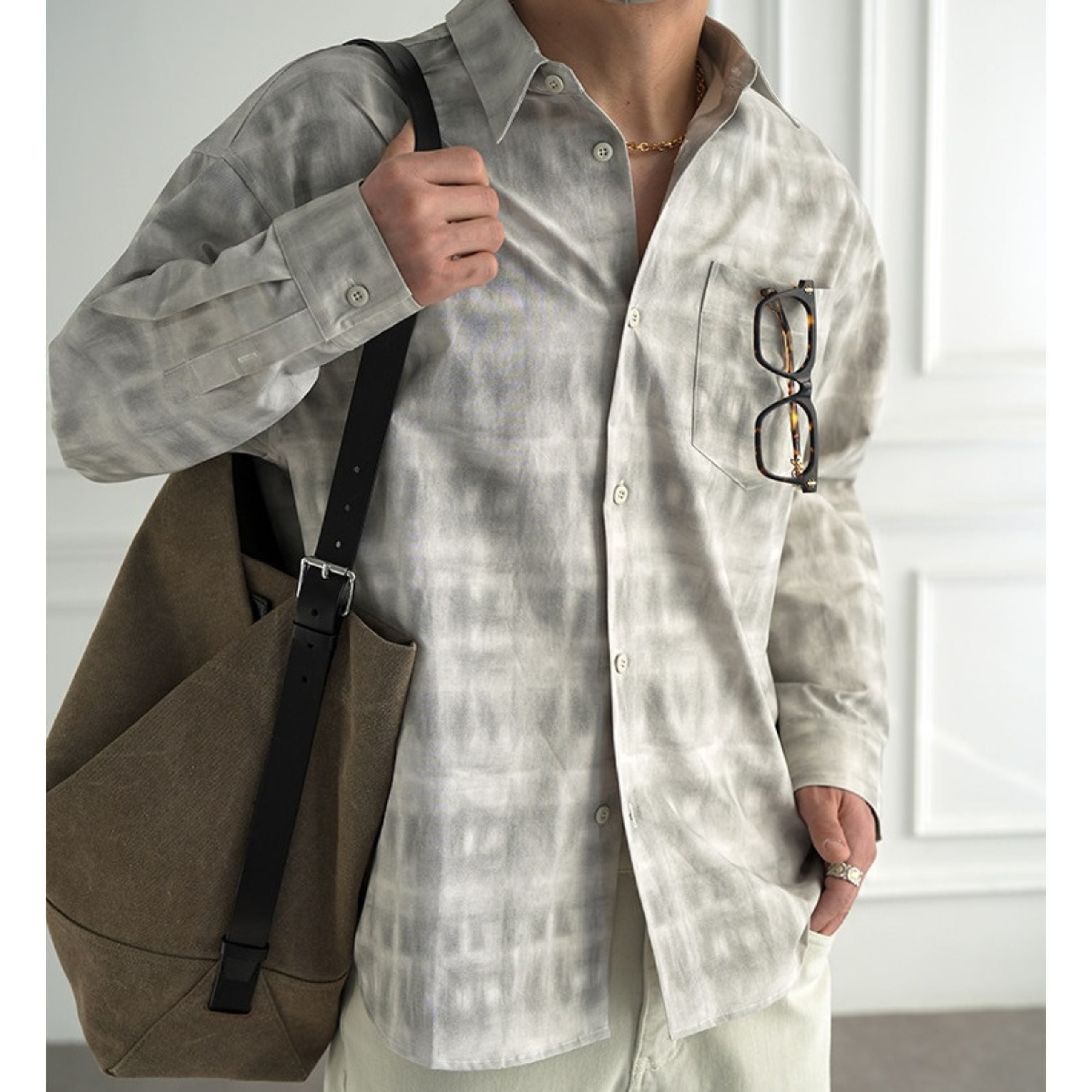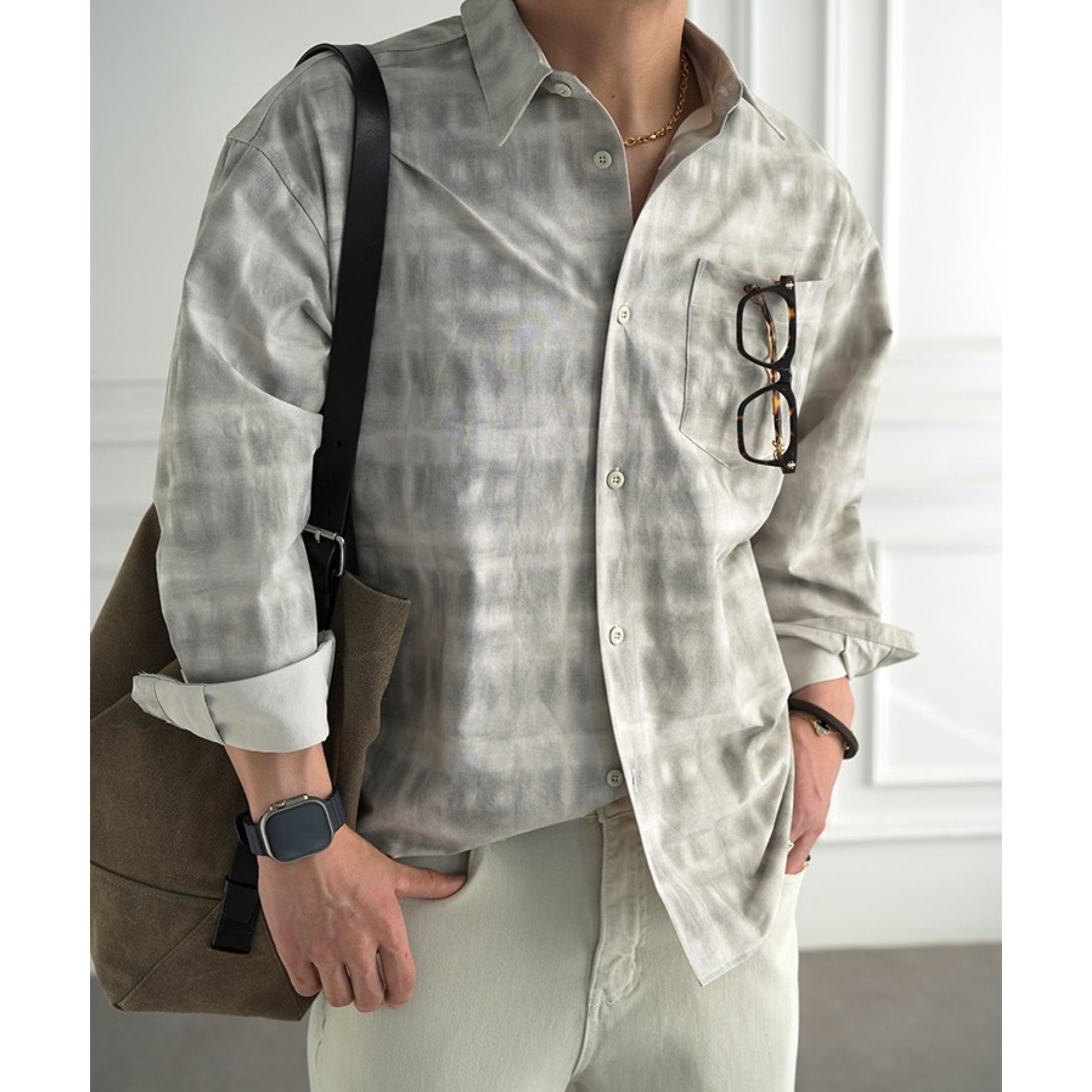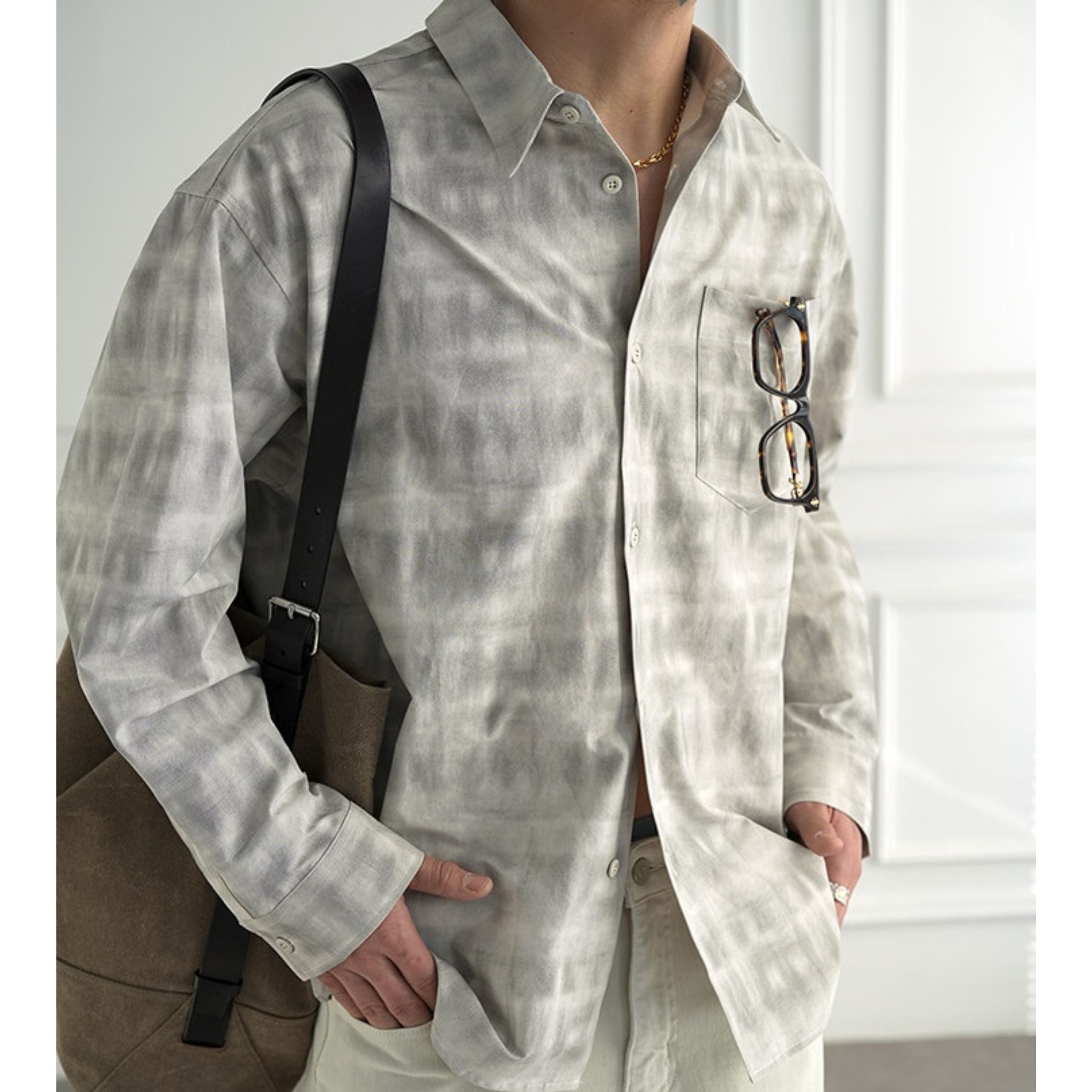 穏淡くにじむようなニュアンスチェックが印象的なロングスリーブシャツ。