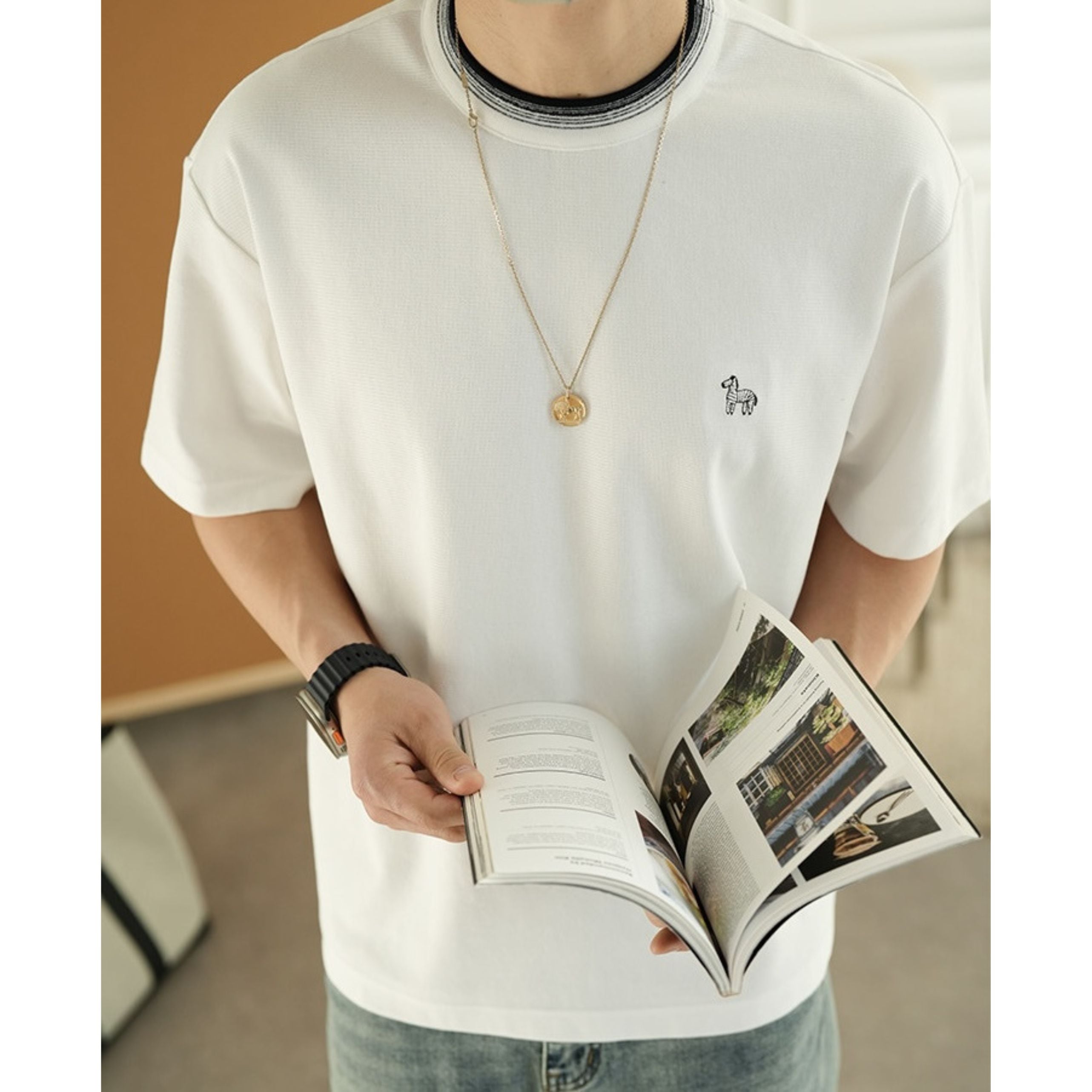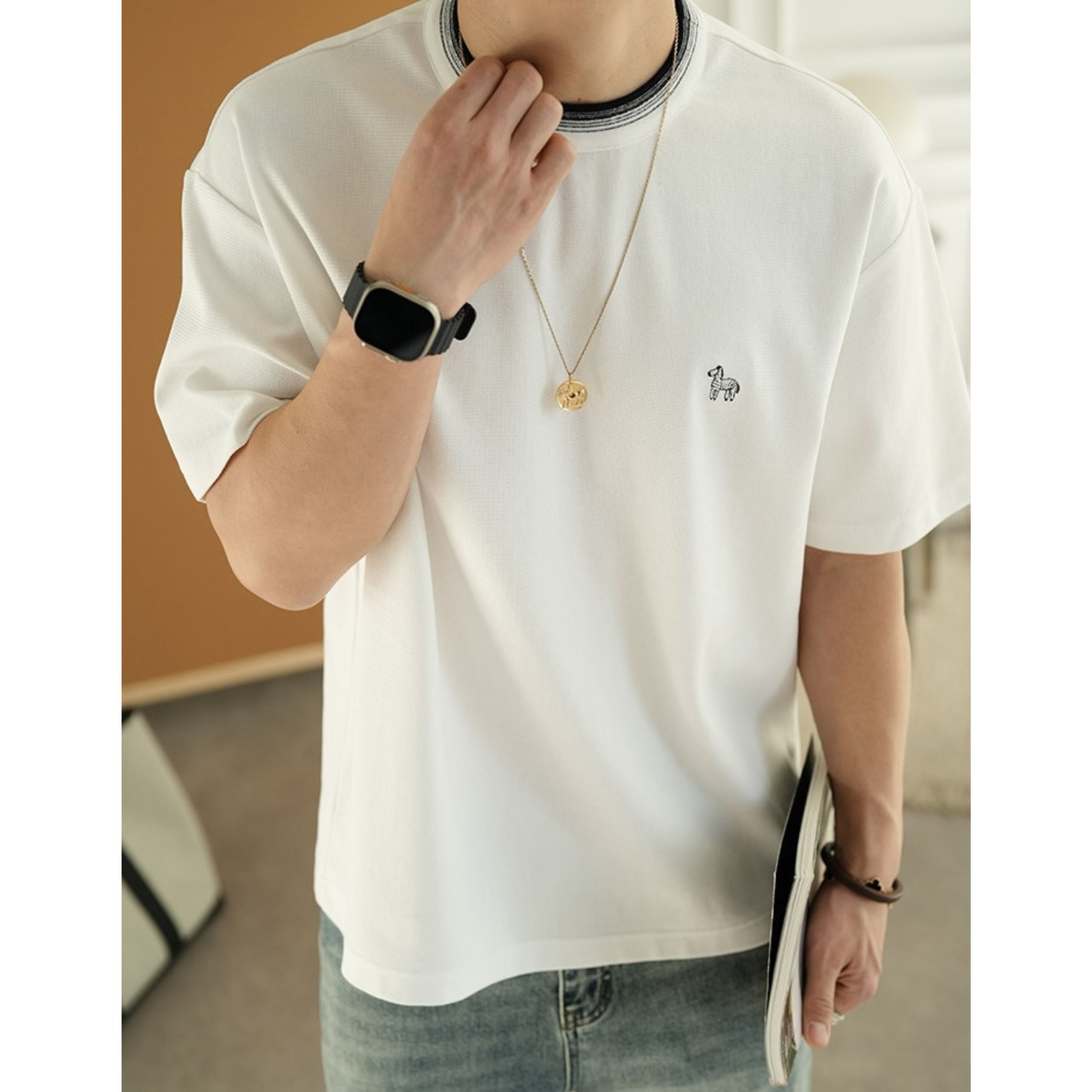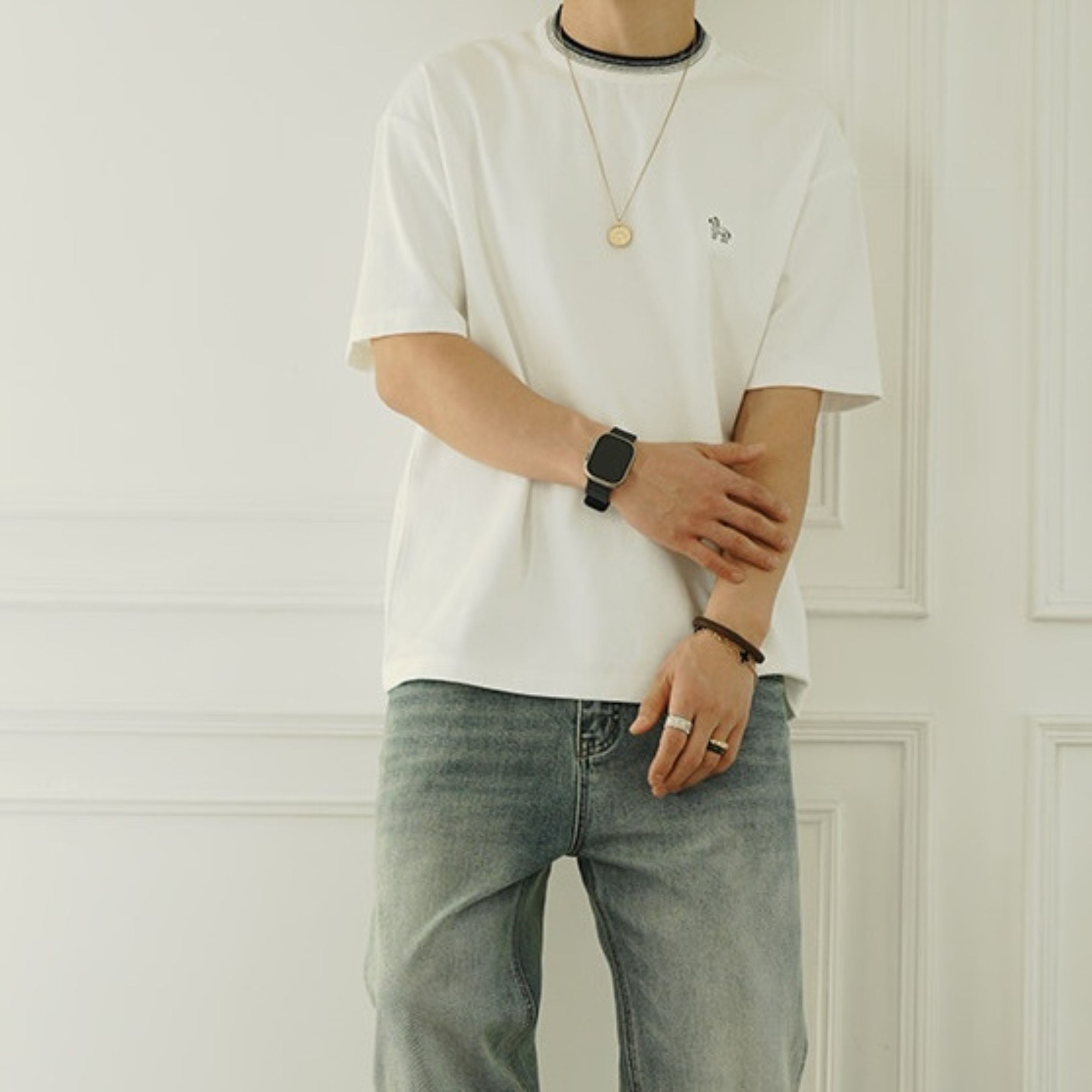 アクセントになるミニマルデザインTシャツ。