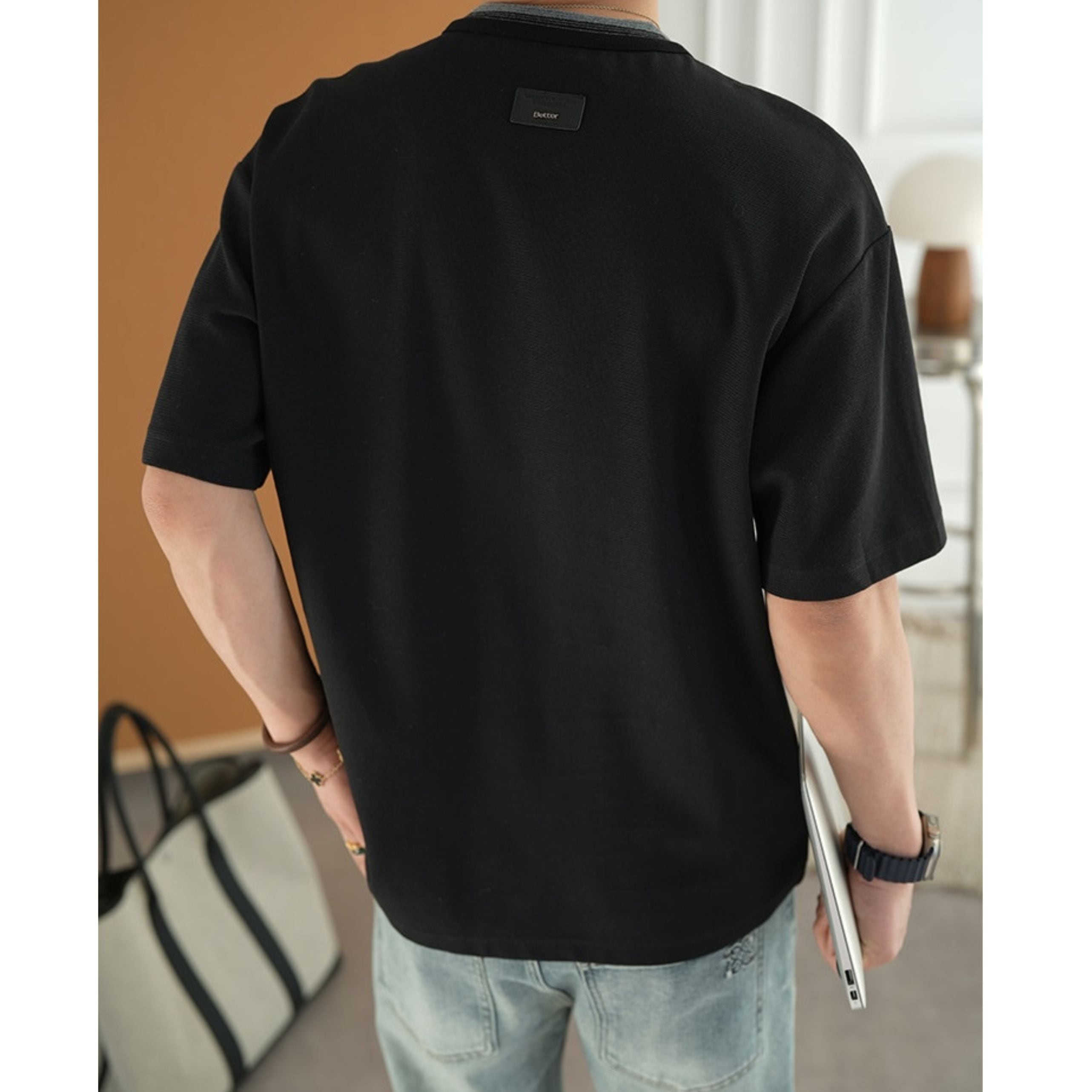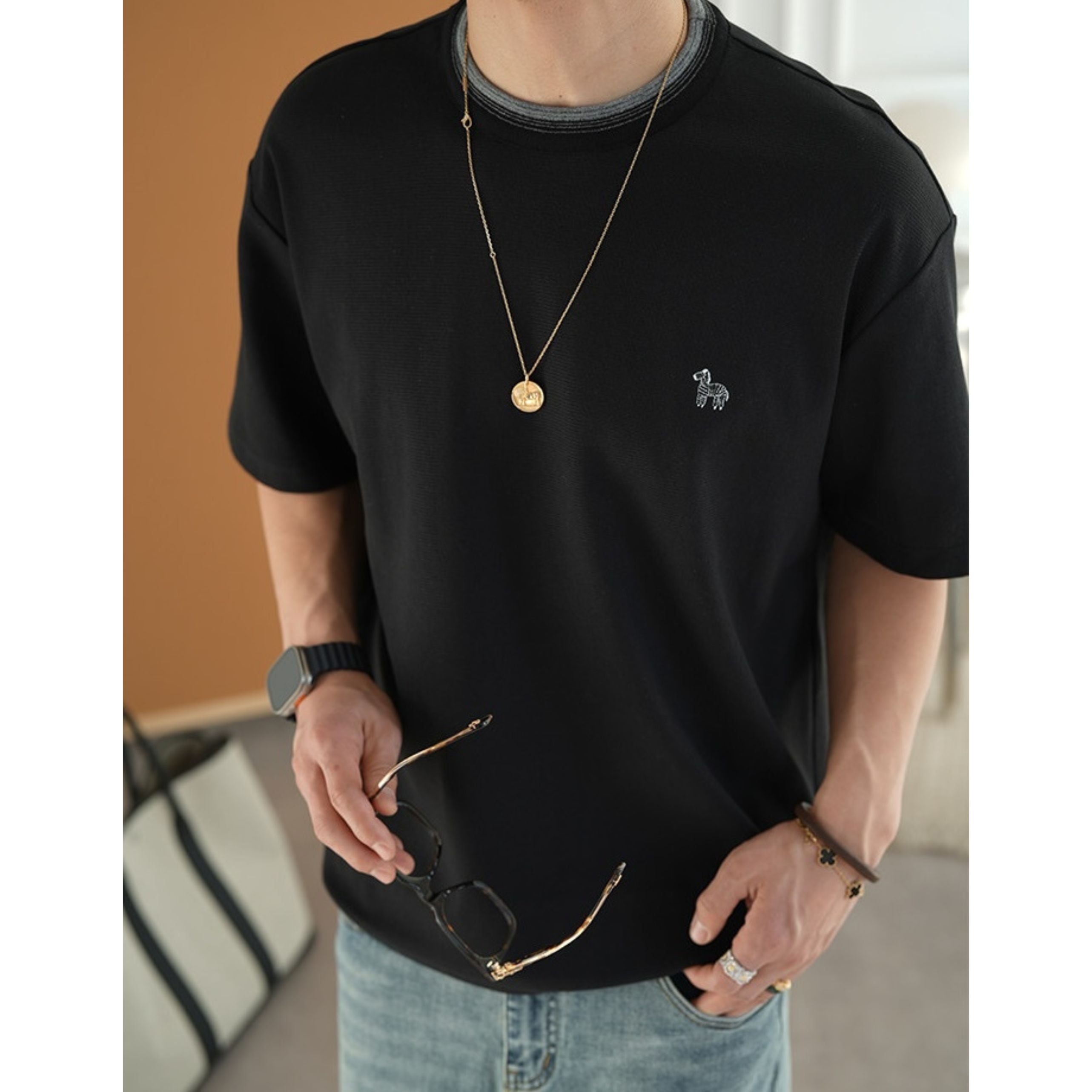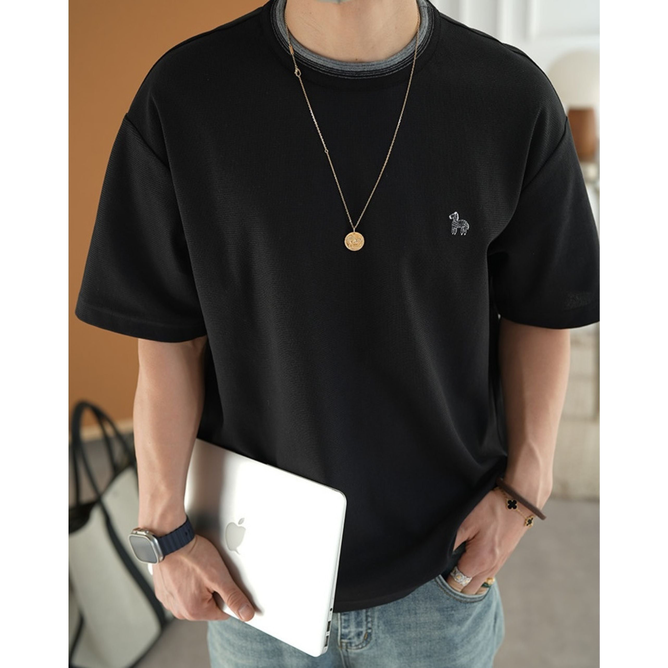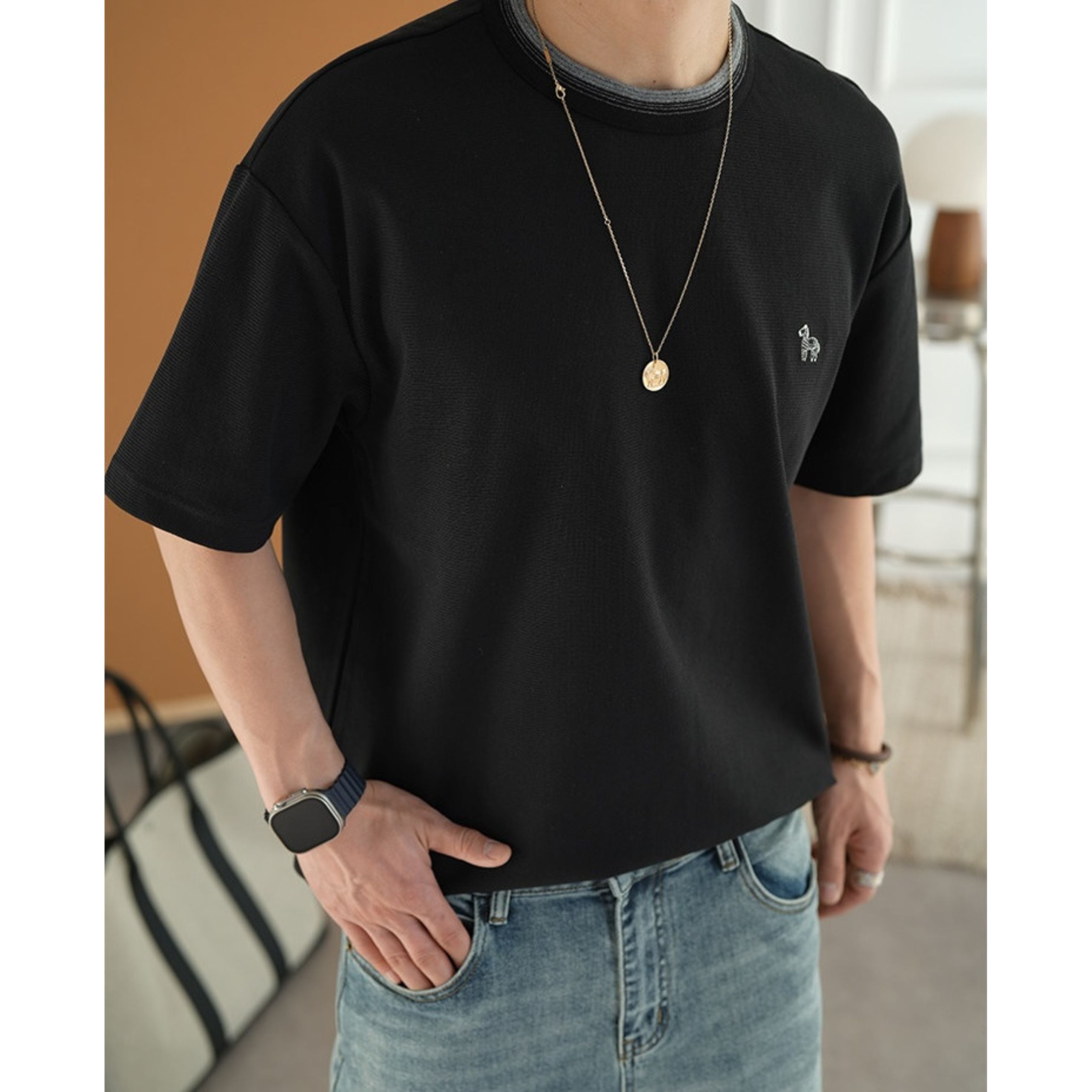 アクセントになるミニマルデザインTシャツ。
