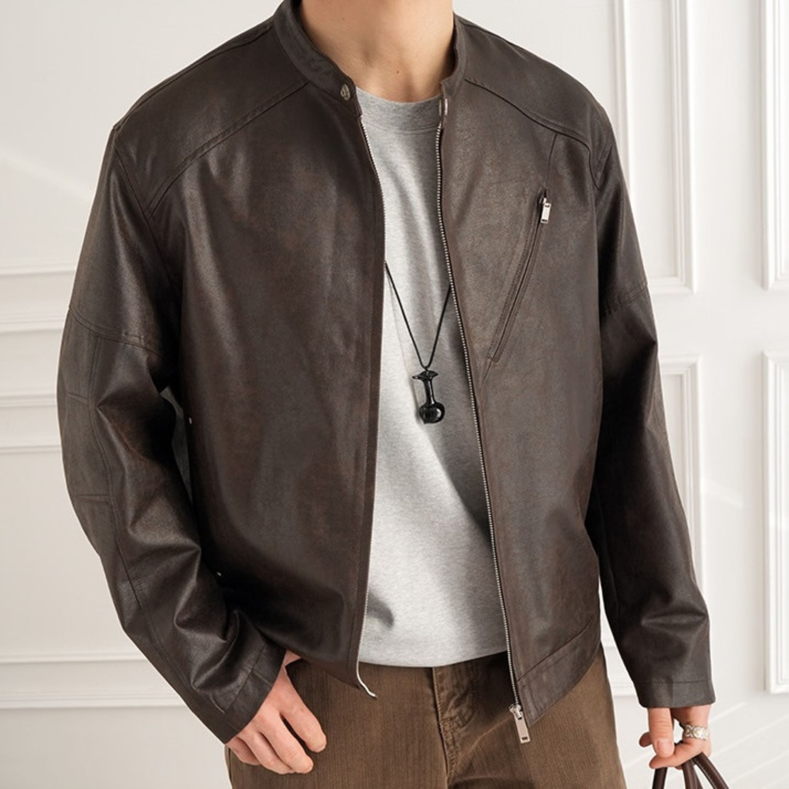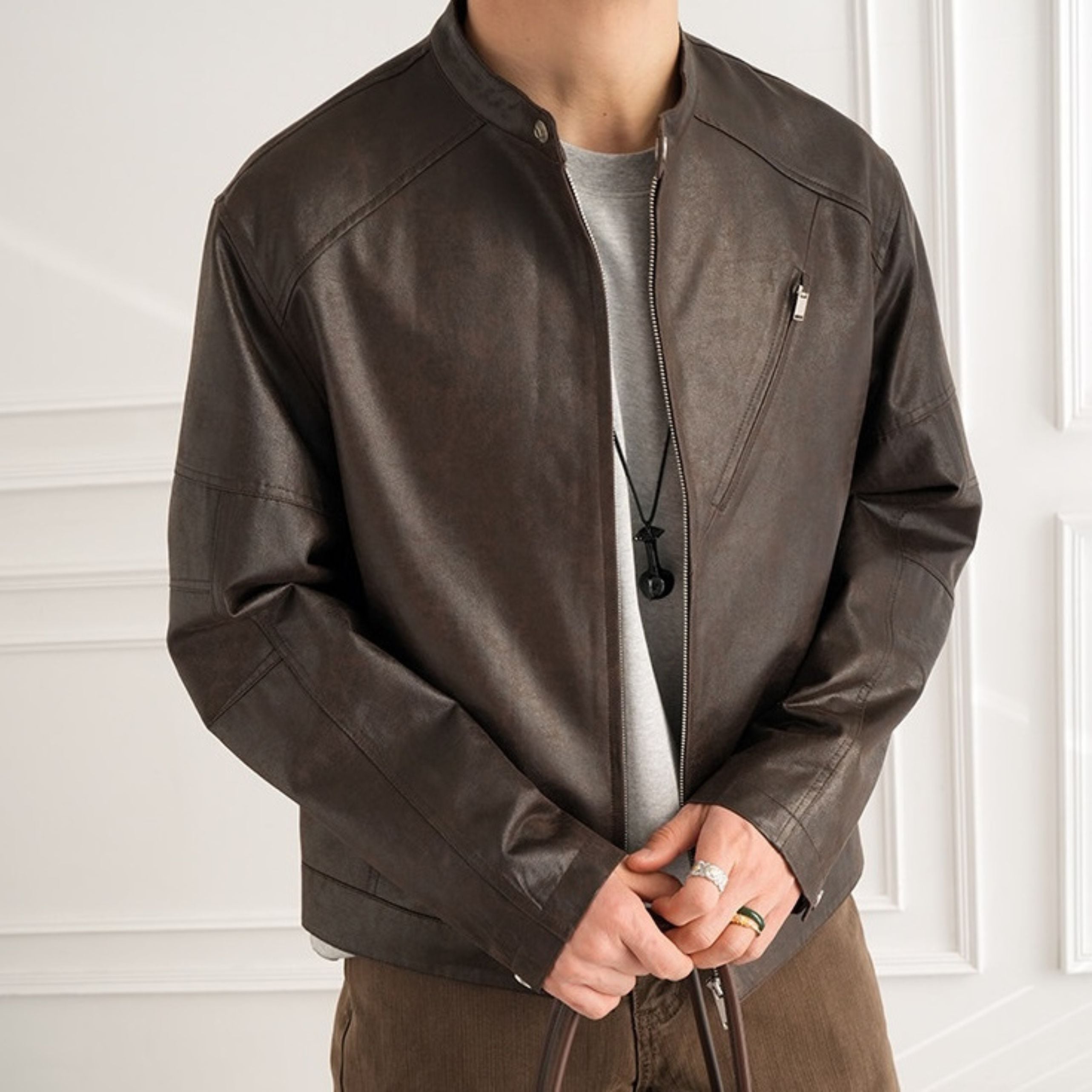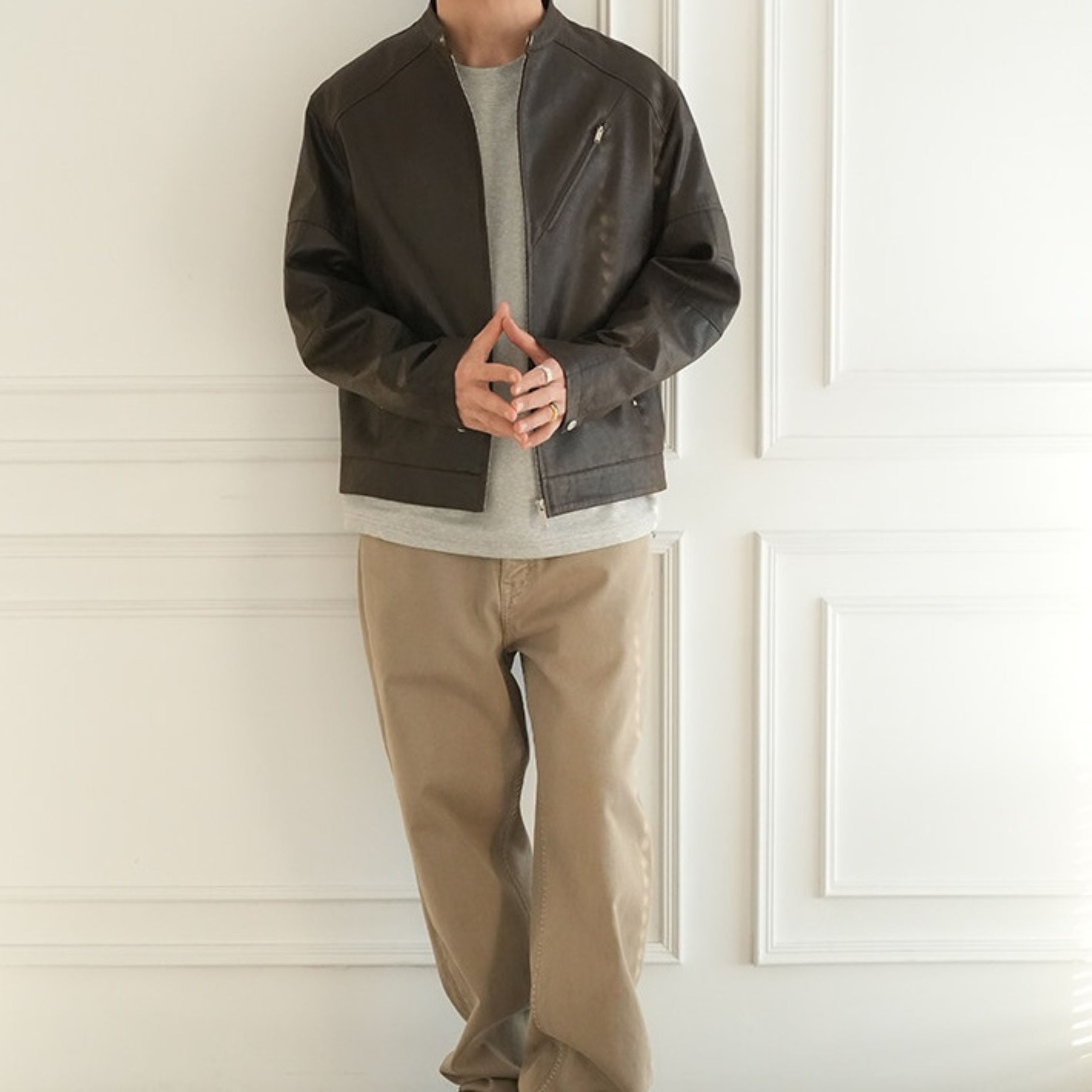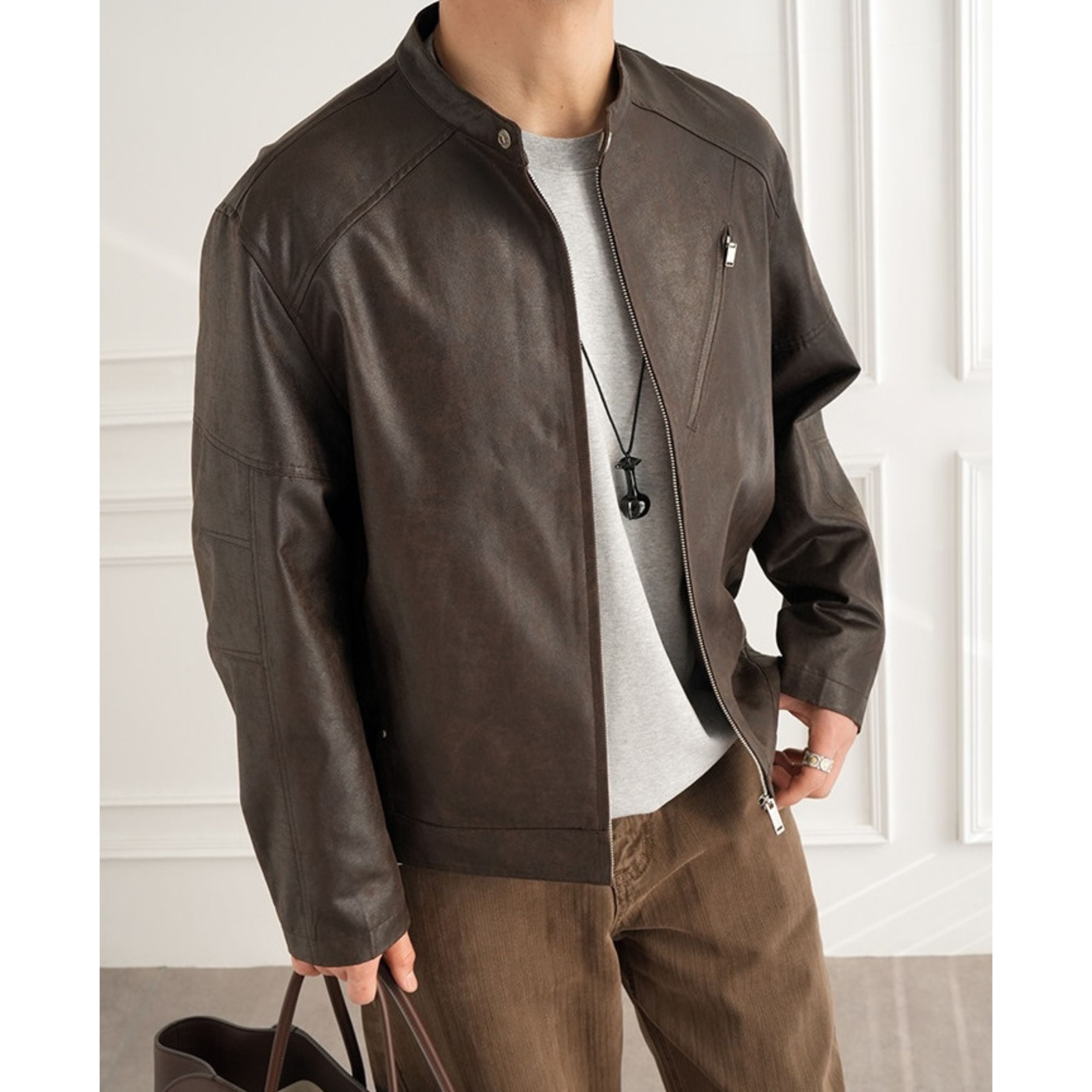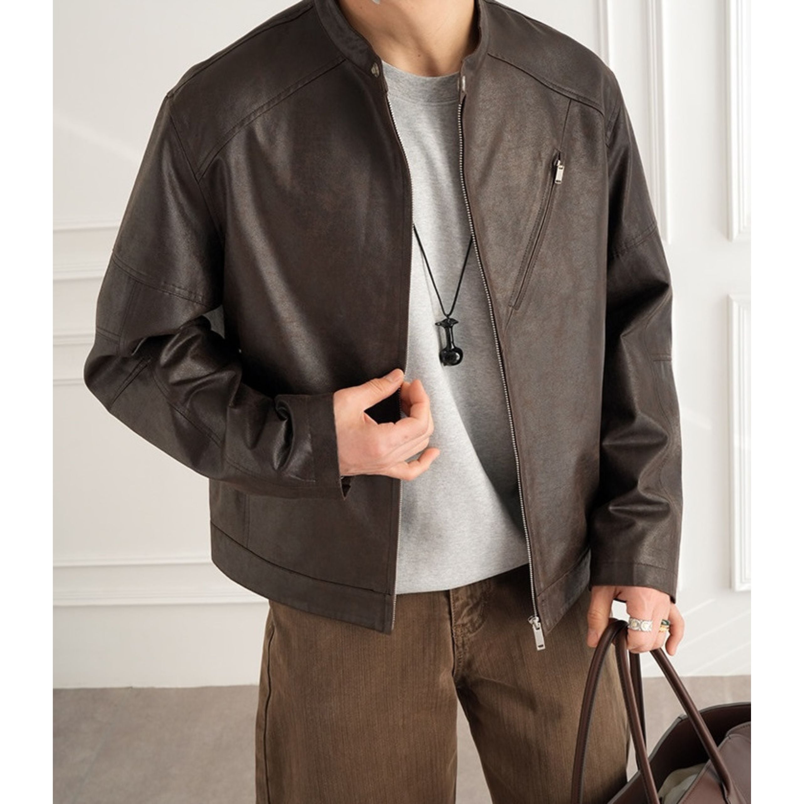 落ち着いたブラウンの風合いが魅力のシングルレザージャケット。