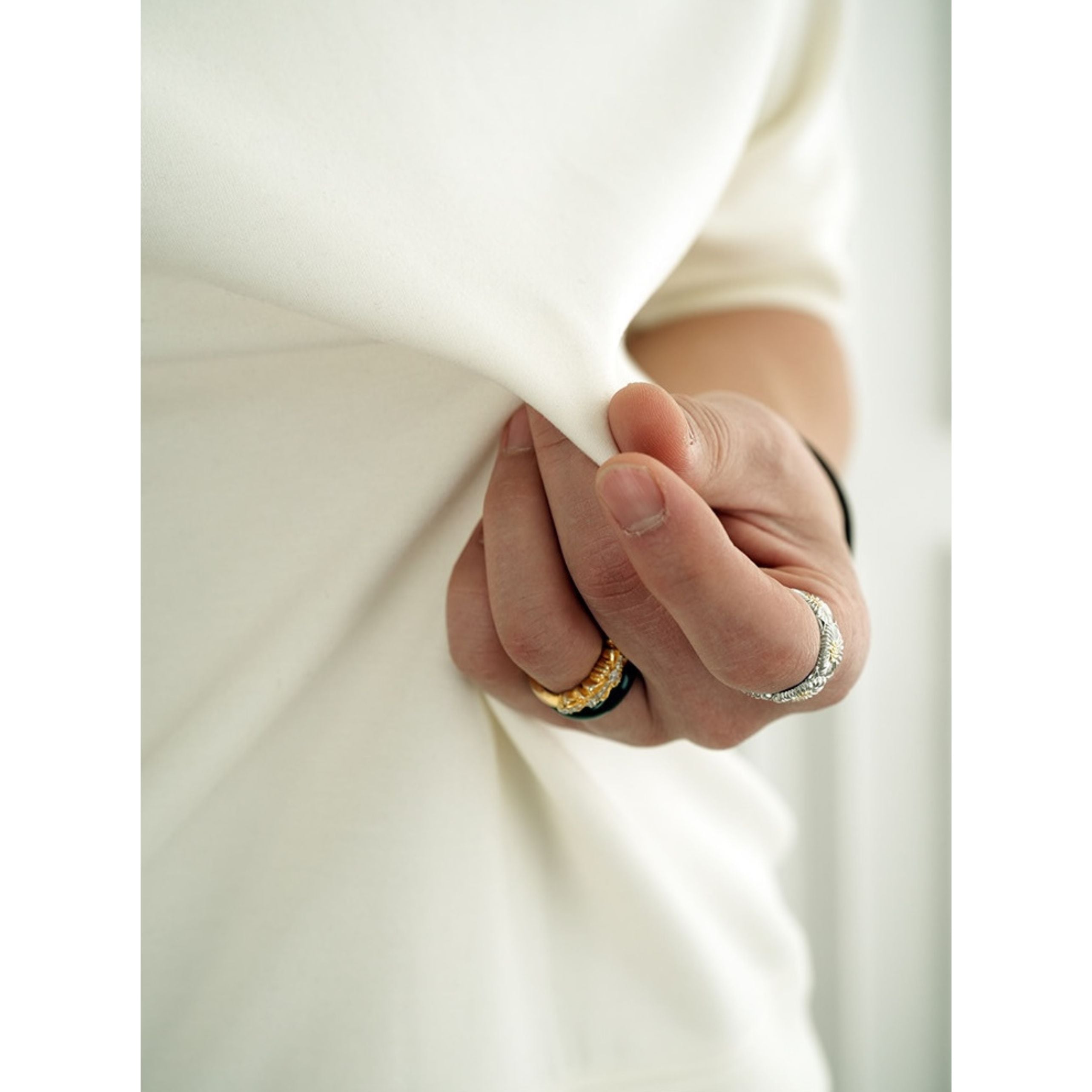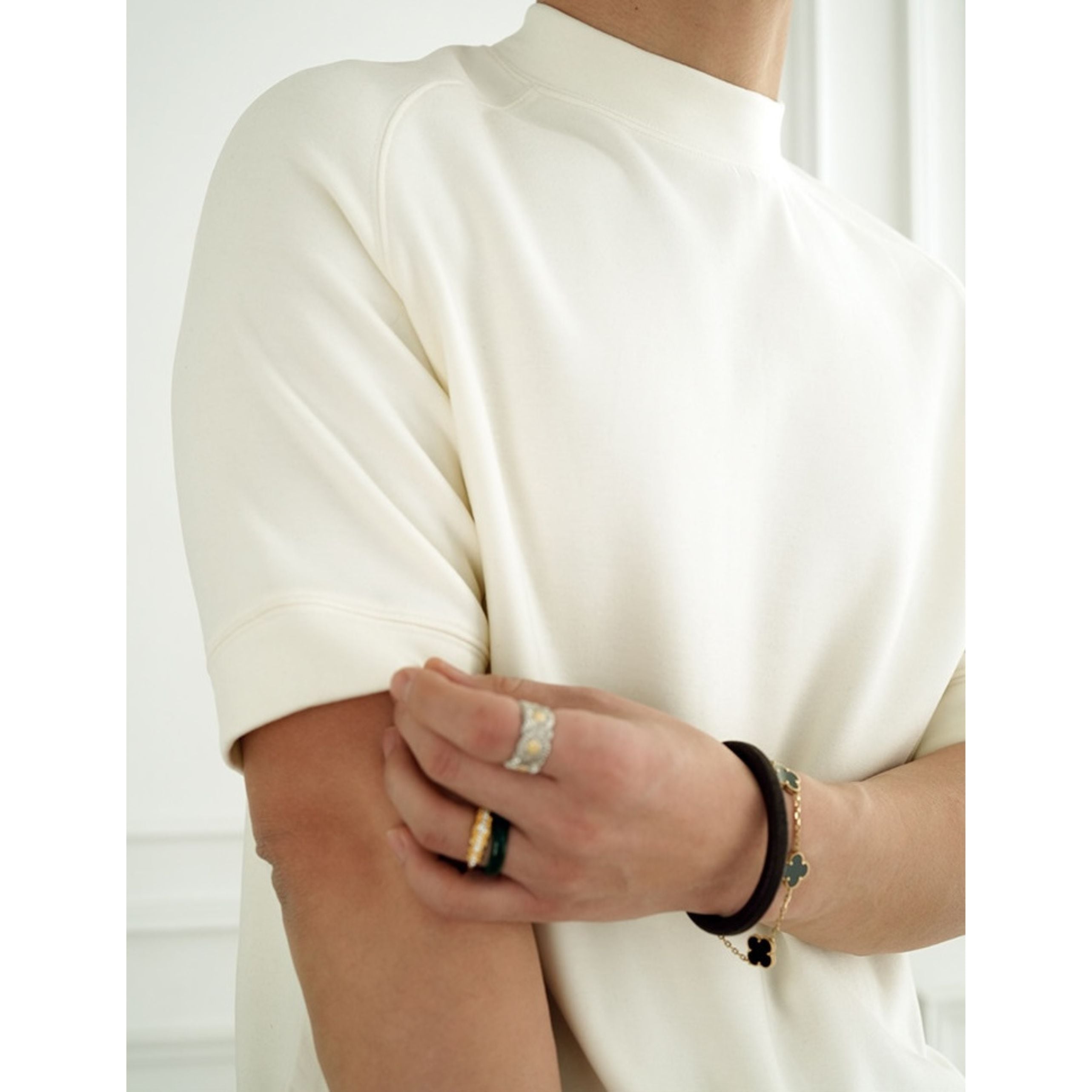 ほどよく立ち上がるモックネックが上品な印象を与える一枚。