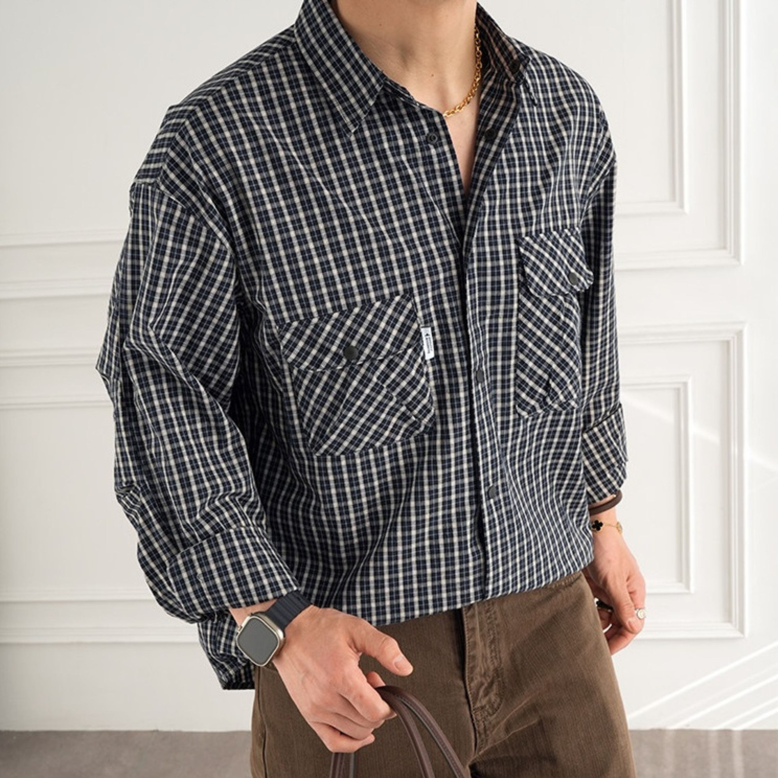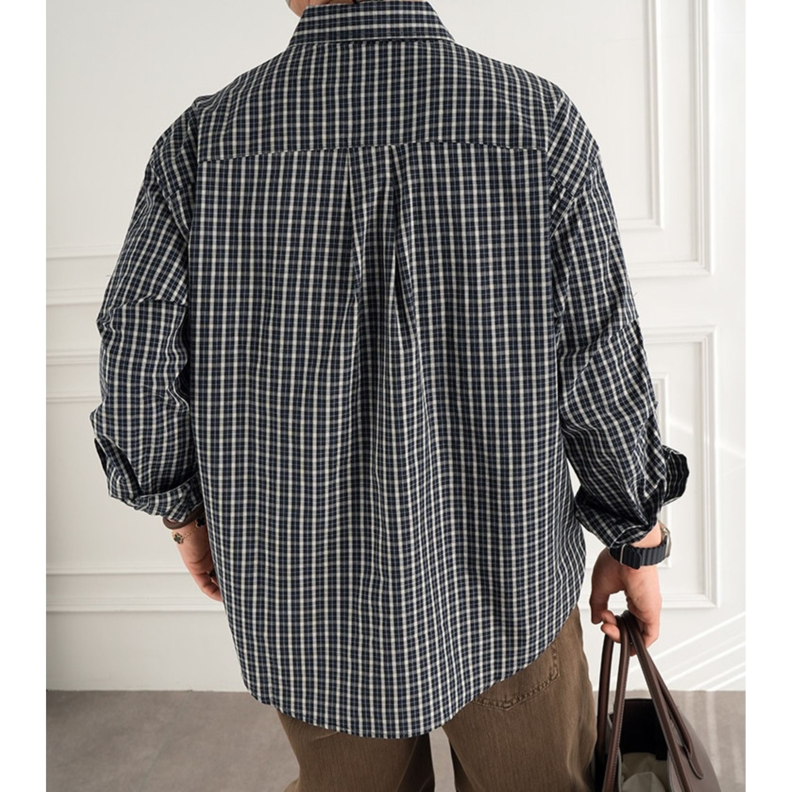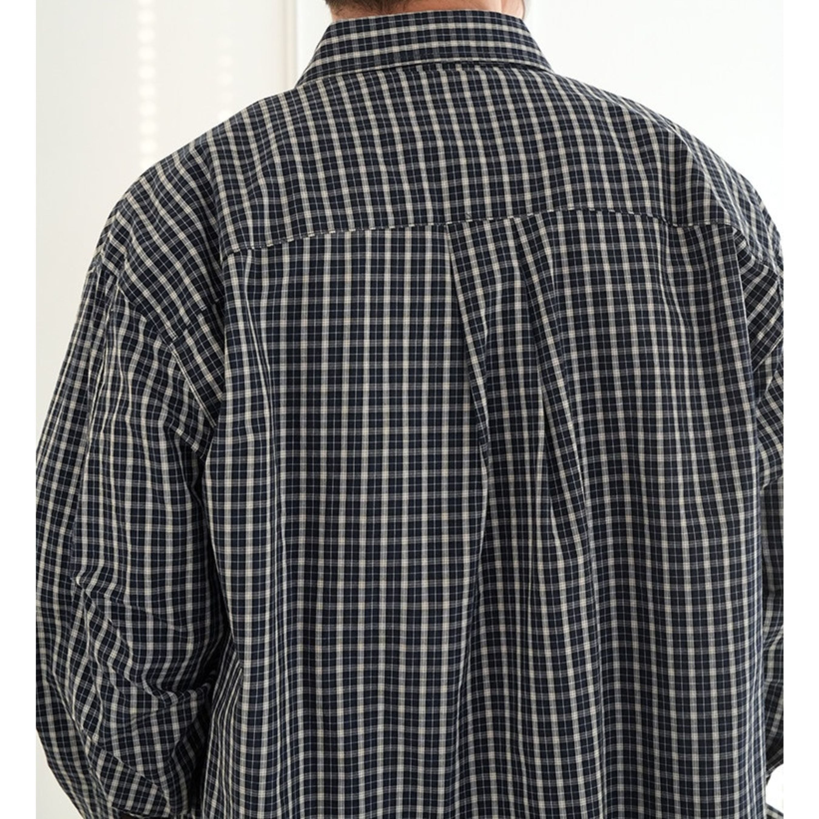 落ち着いた配色の細かなチェック柄が大人の雰囲気を演出するチェック柄シャツ。