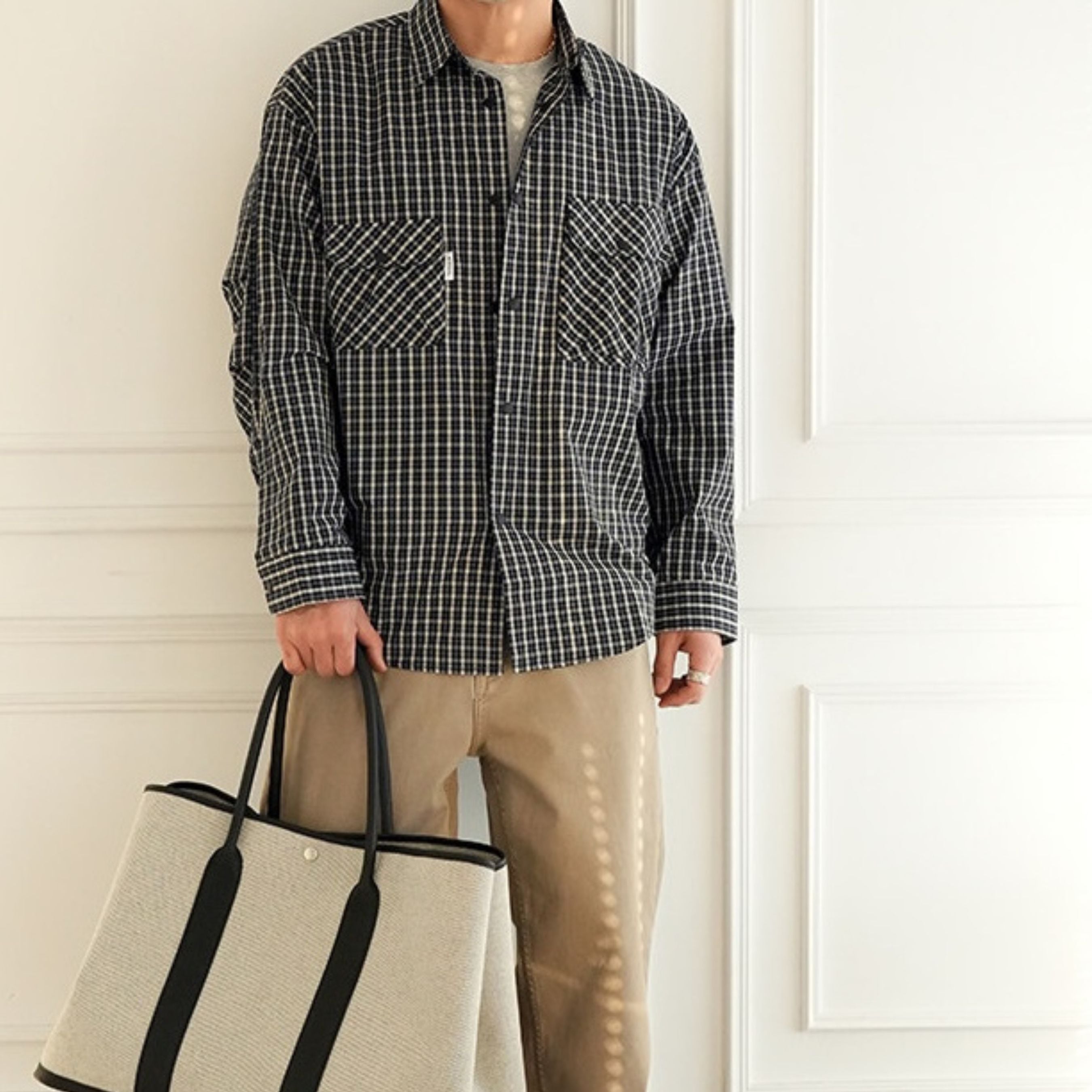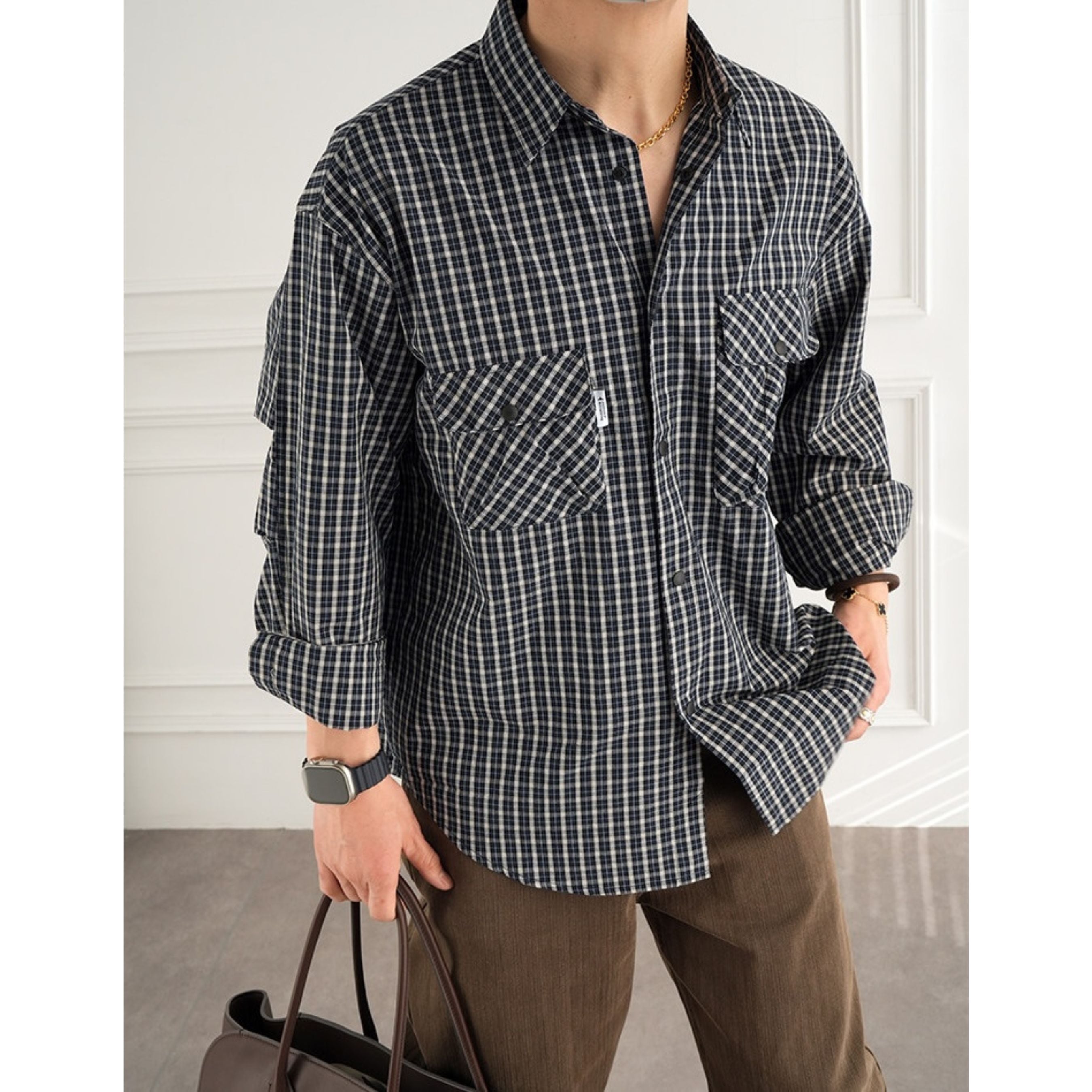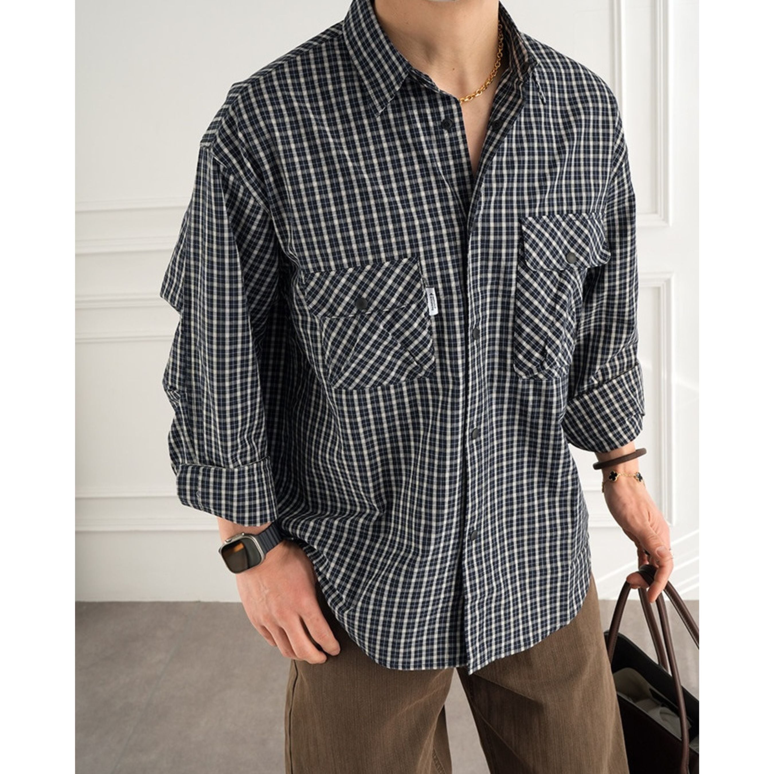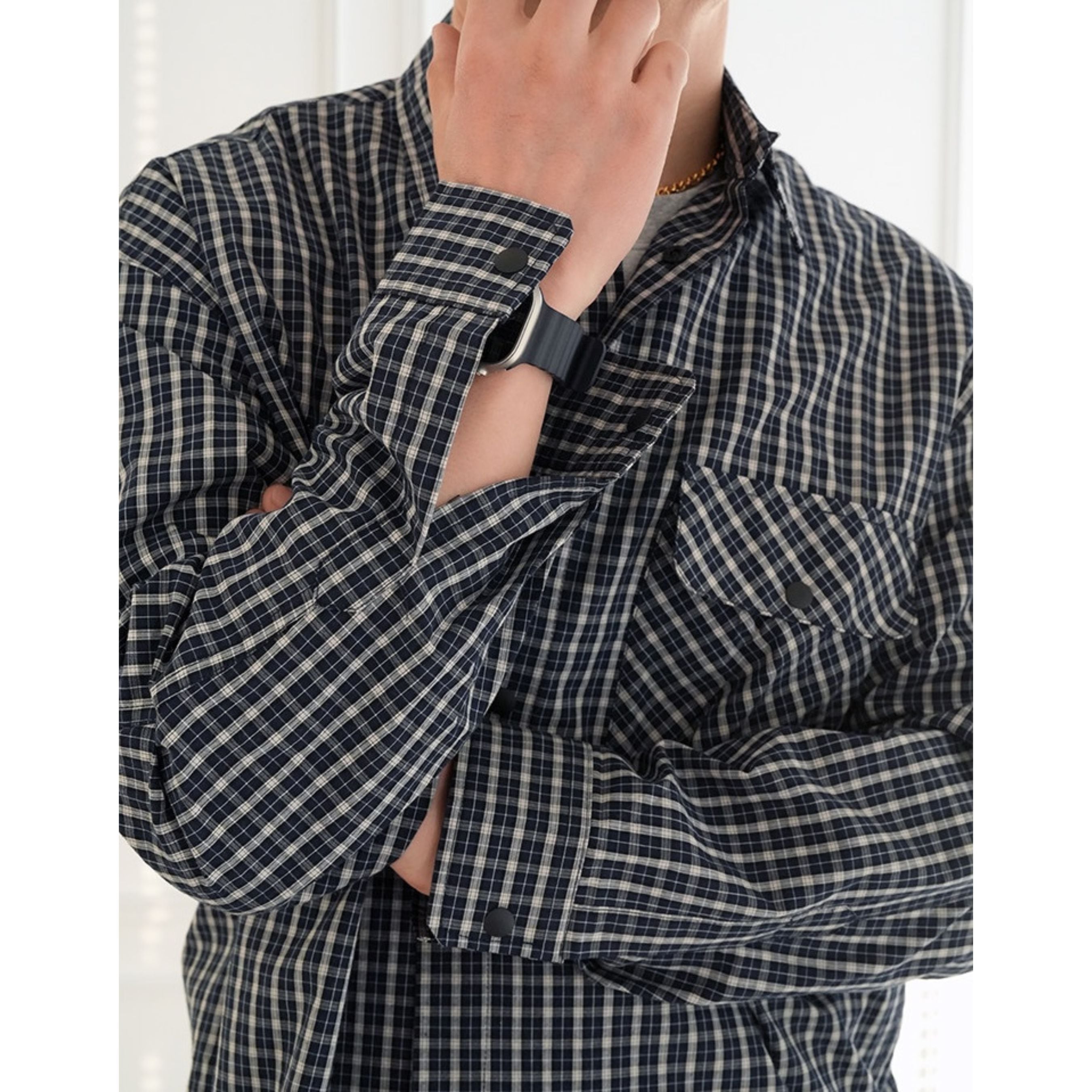落ち着いた配色の細かなチェック柄が大人の雰囲気を演出するチェック柄シャツ。