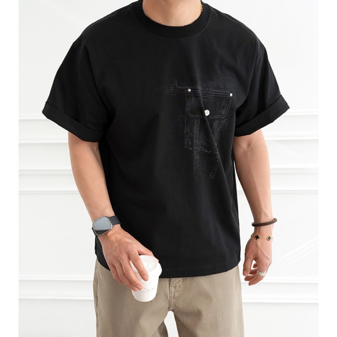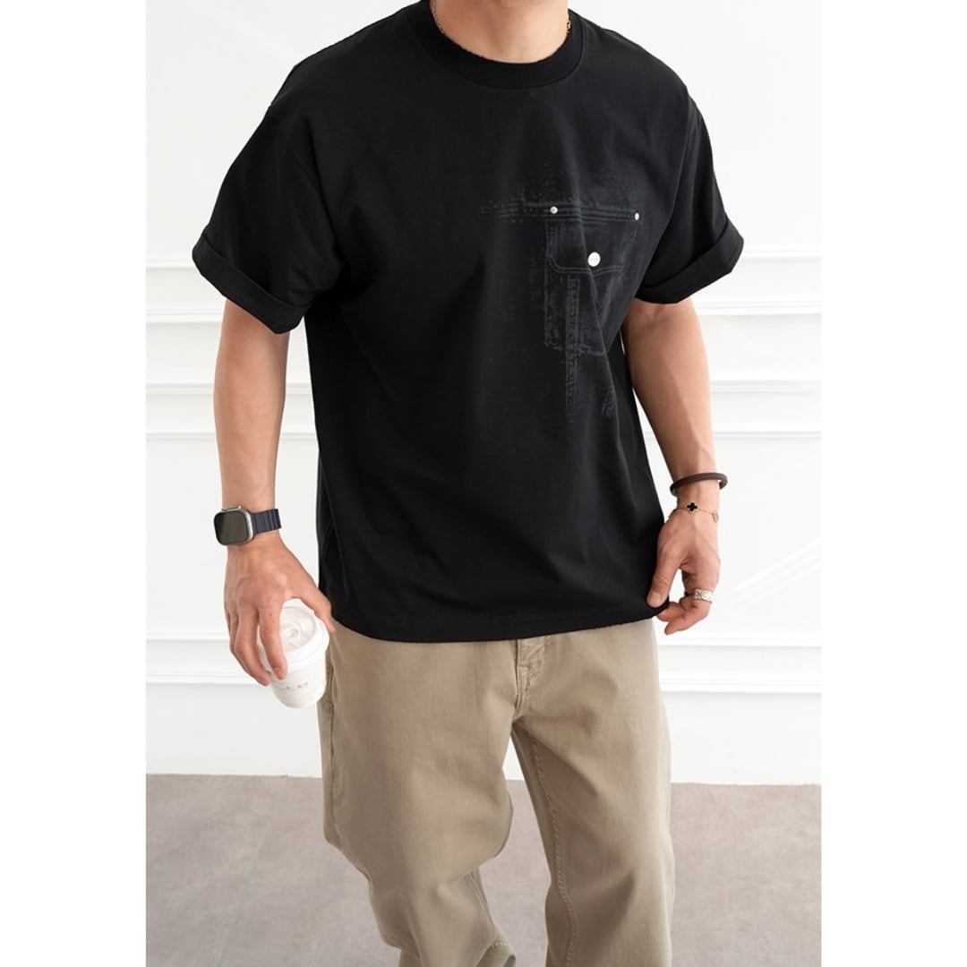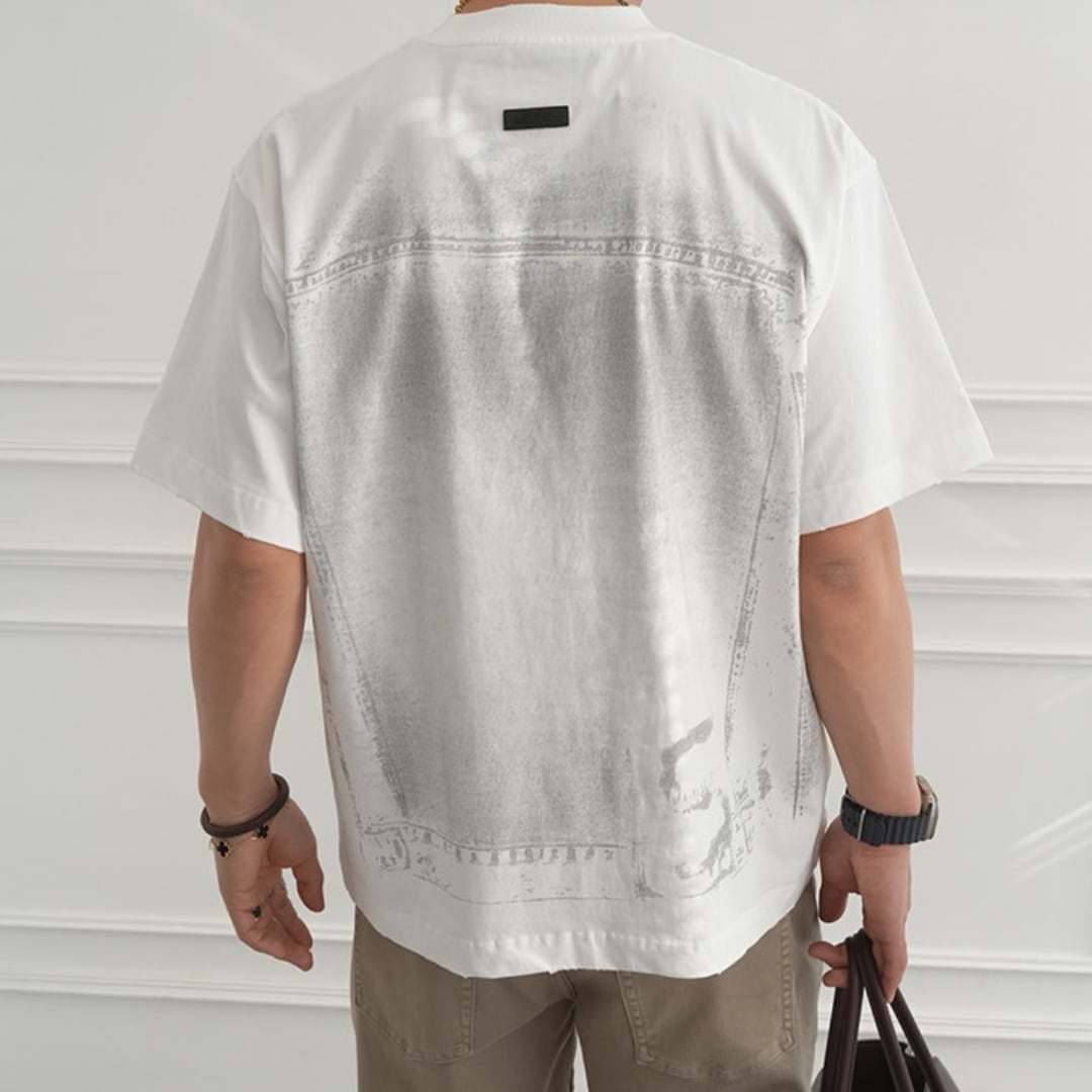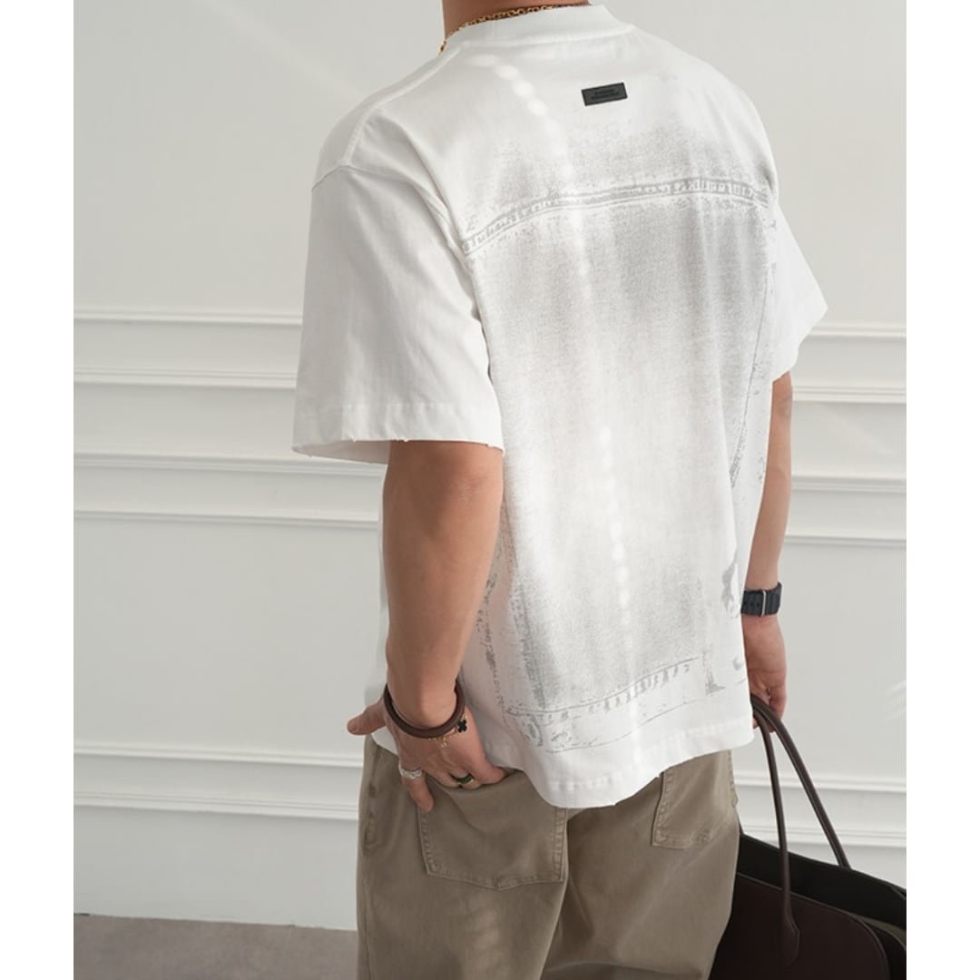 フロントにはデニムポケットをイメージしたグラフィックを配置し、バックには大胆なデニムモチーフプリントを施した存在感のある一枚です。