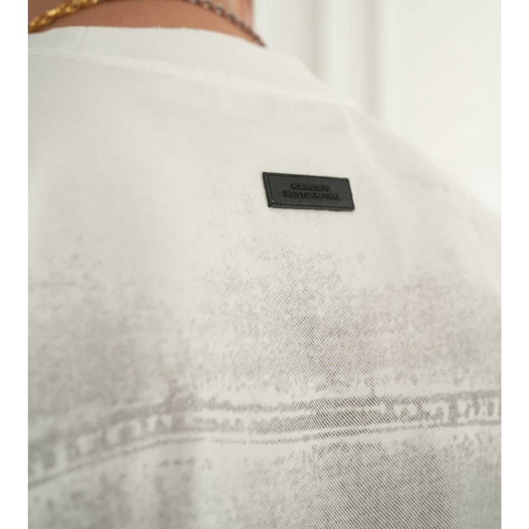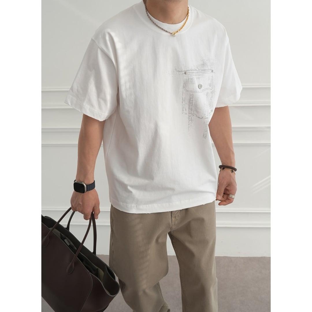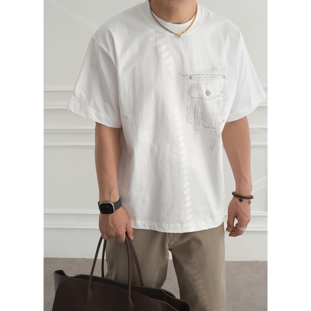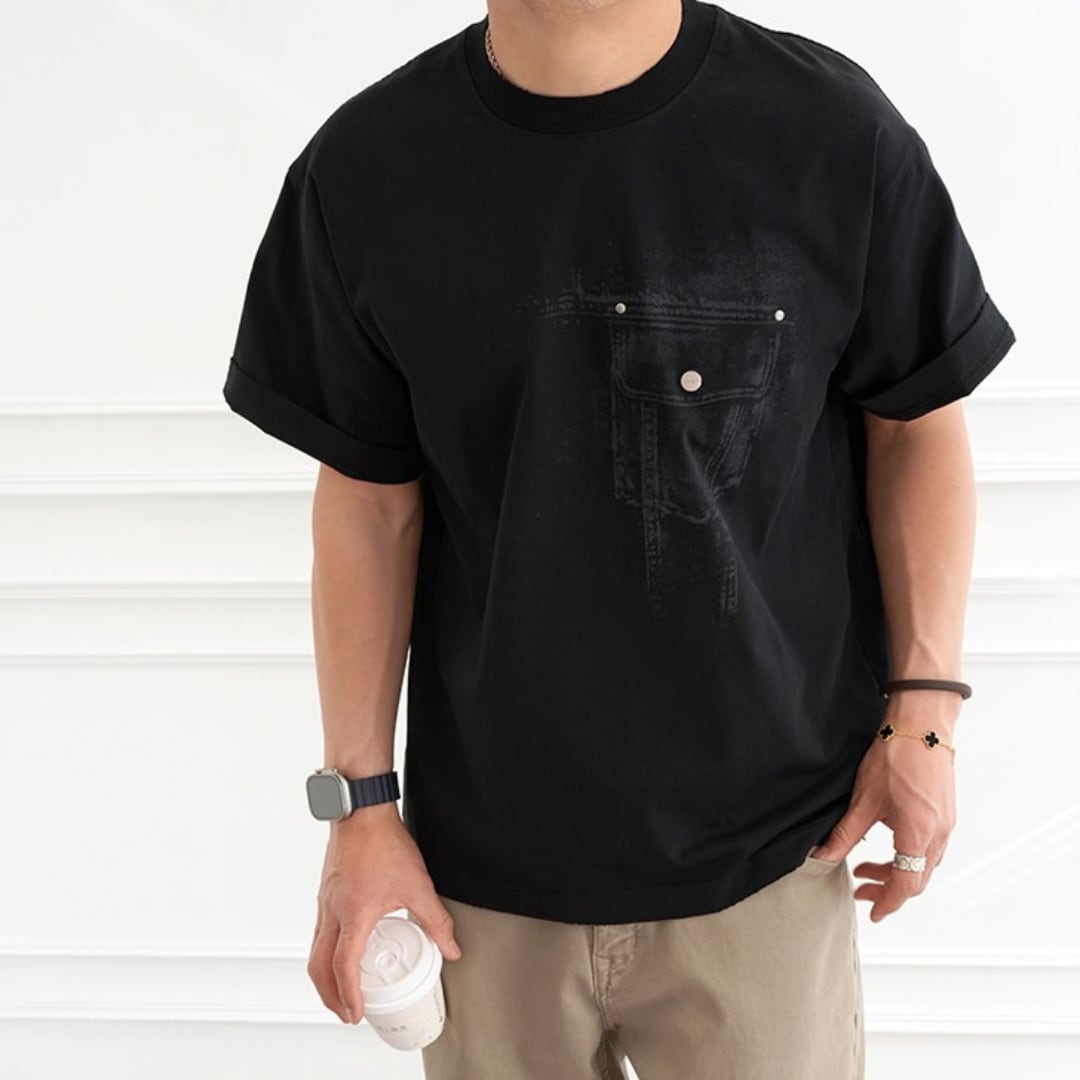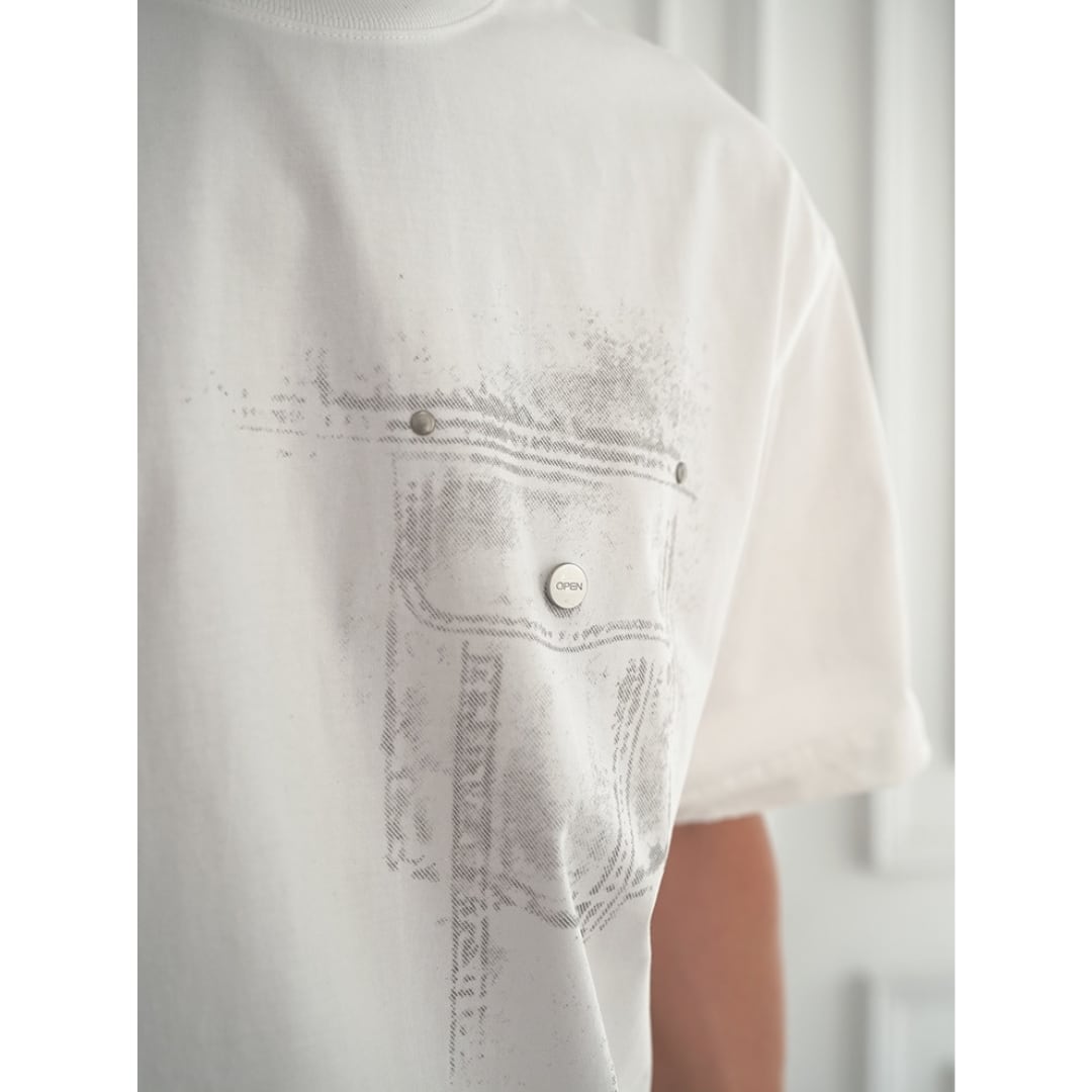 フロントにはデニムポケットをイメージしたグラフィックを配置し、バックには大胆なデニムモチーフプリントを施した存在感のある一枚です。