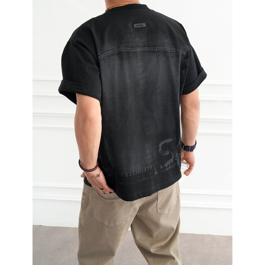 ヴィンテージデニムの風合いをプリントで表現した個性的なデザインTシャツ。