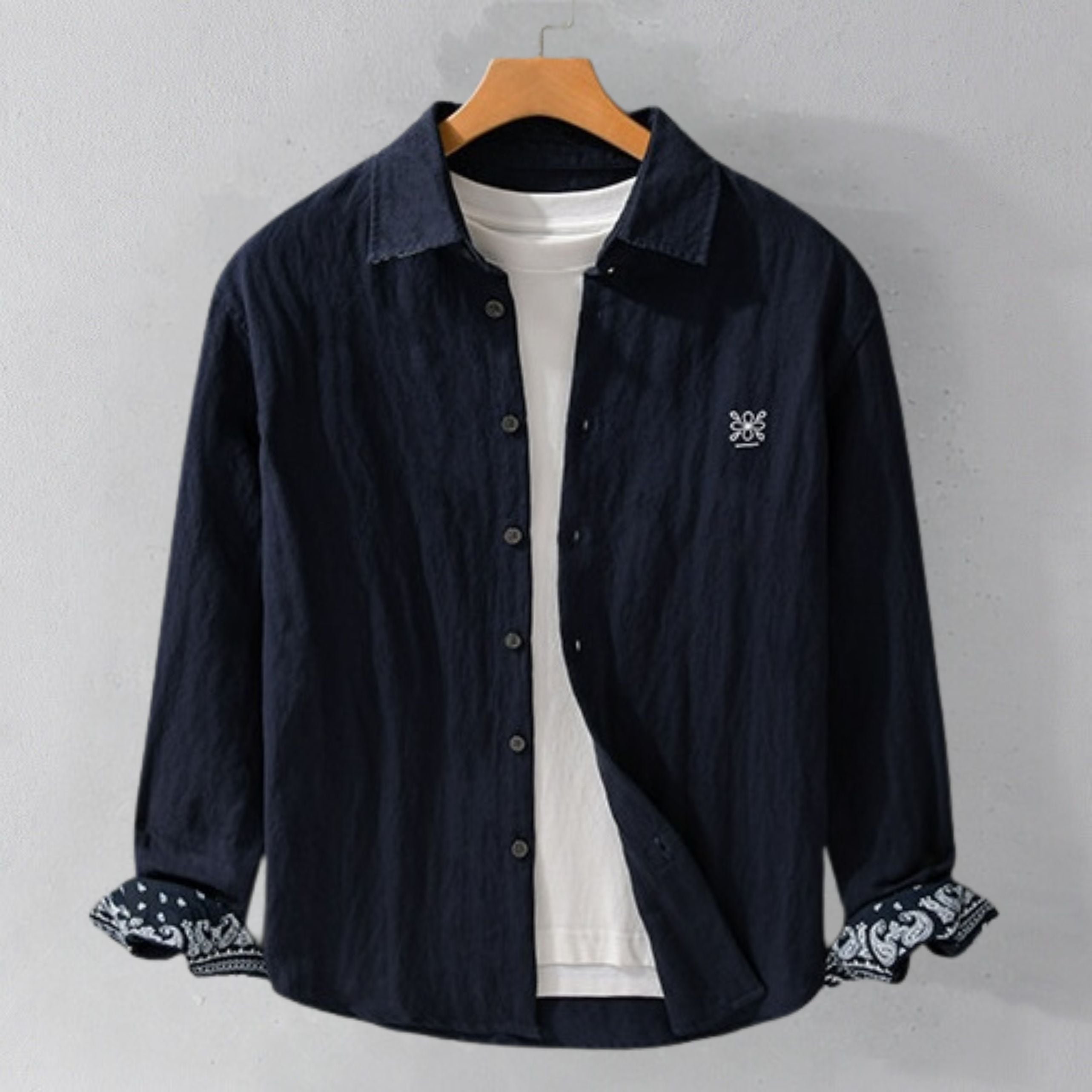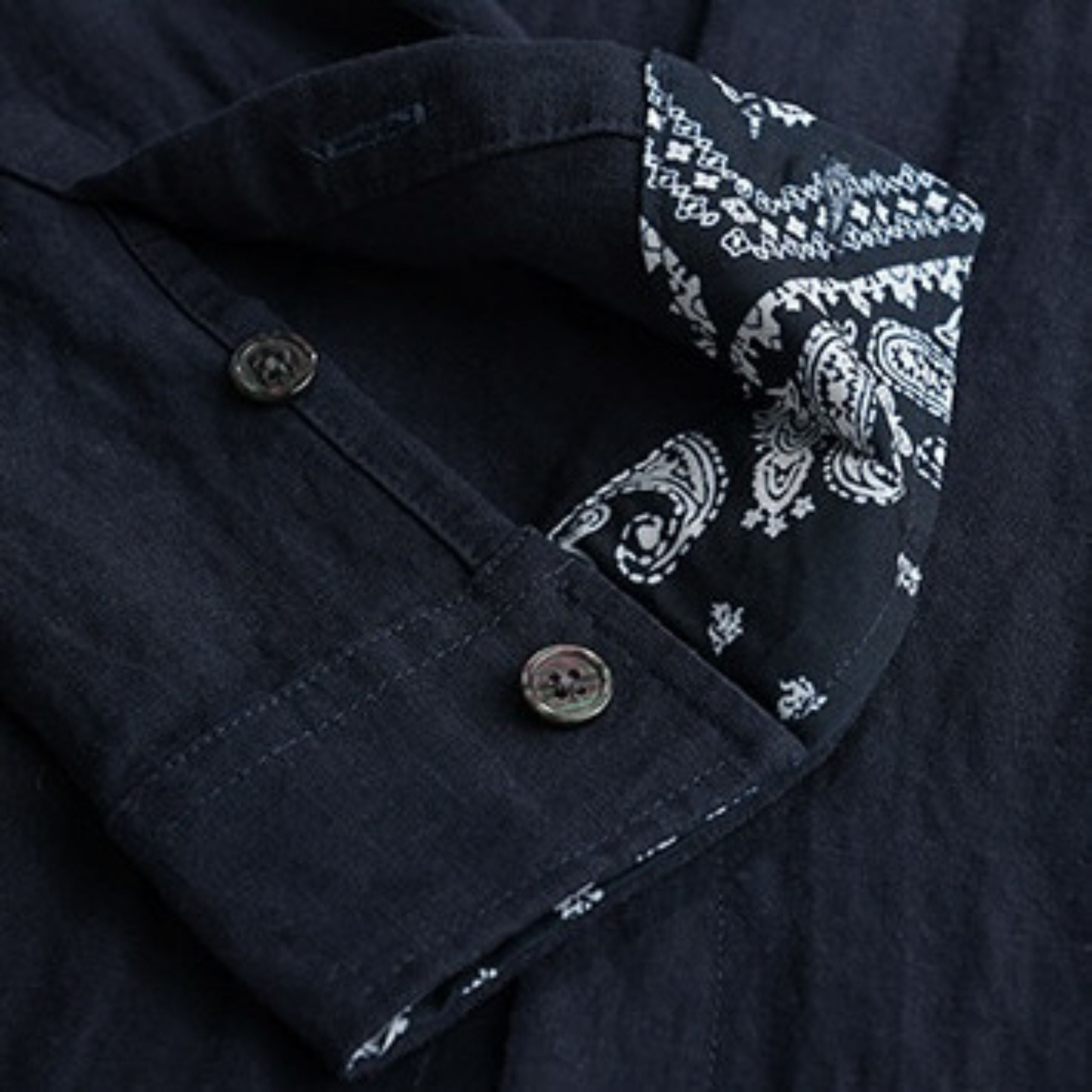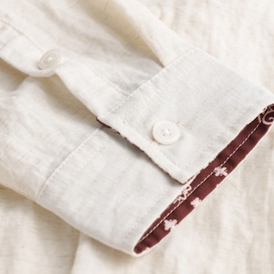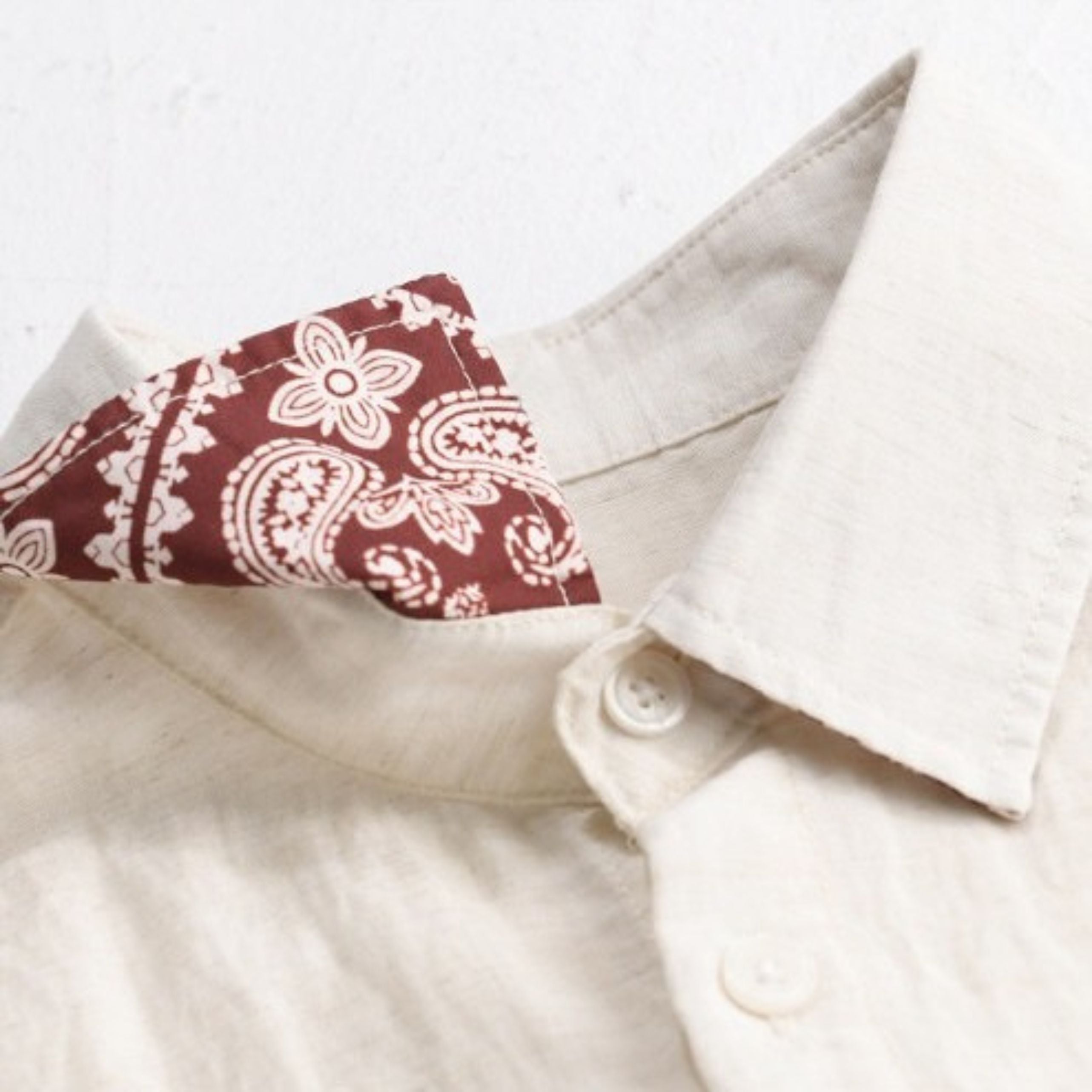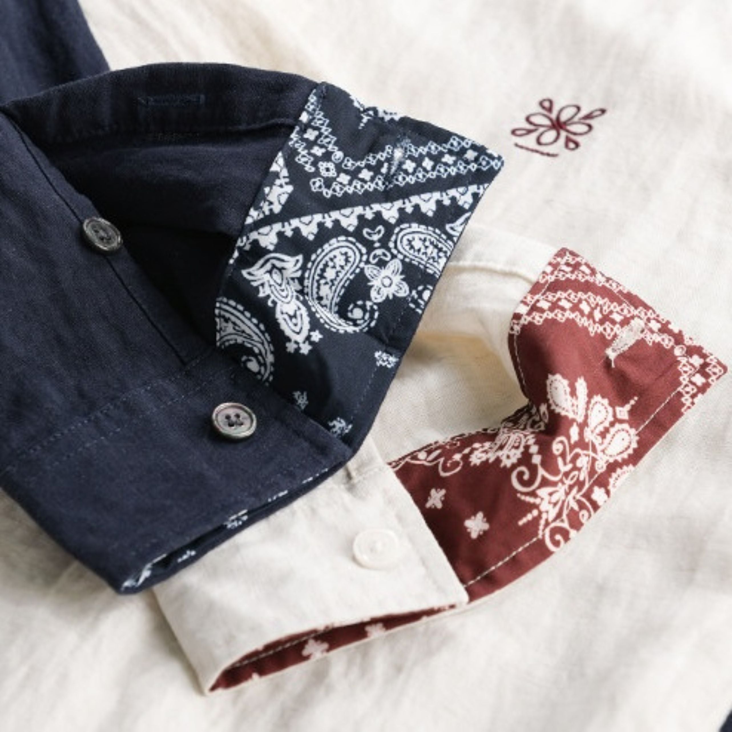 胸元にはさりげない刺繍デザインを施し、袖裏にはペイズリー柄をあしらいました。