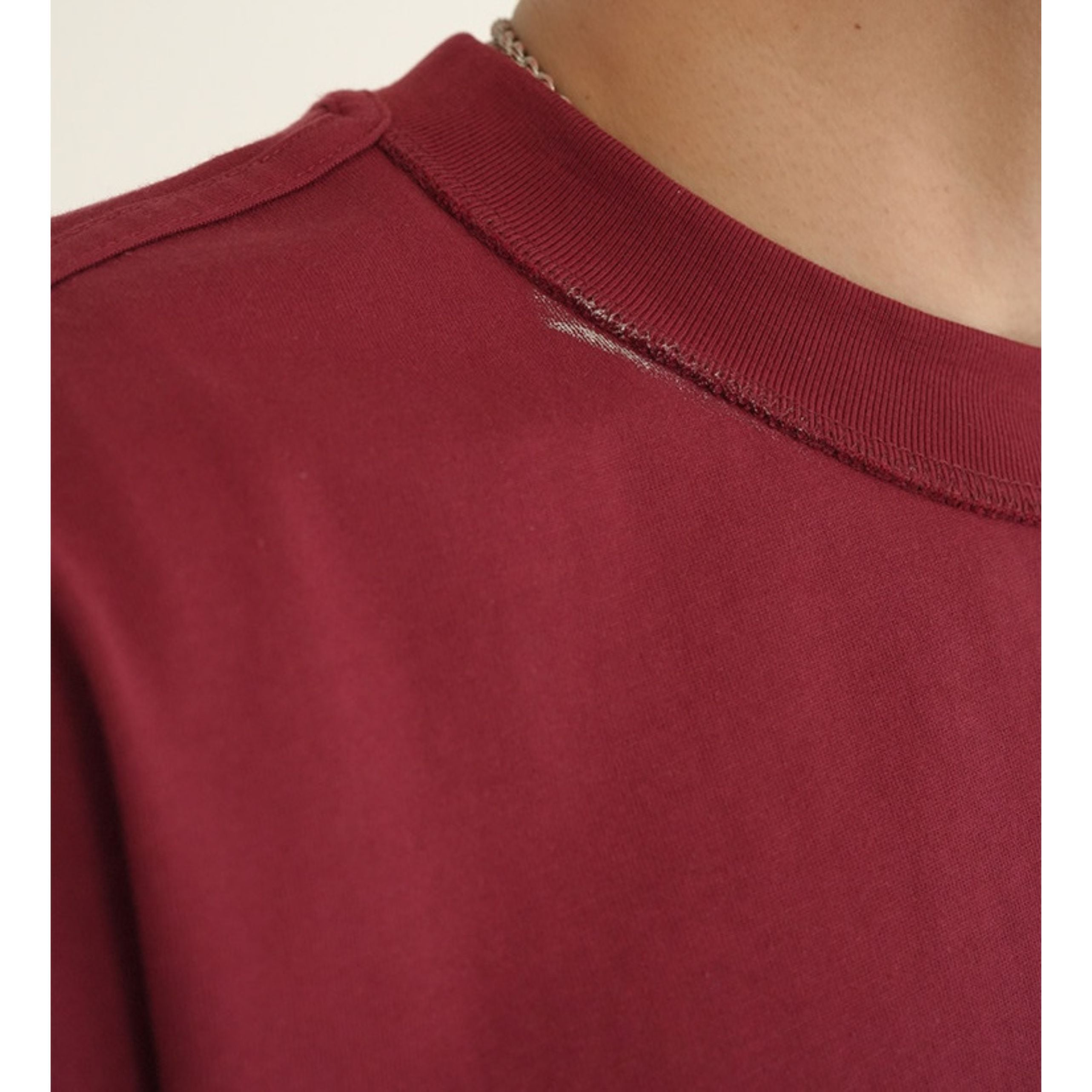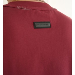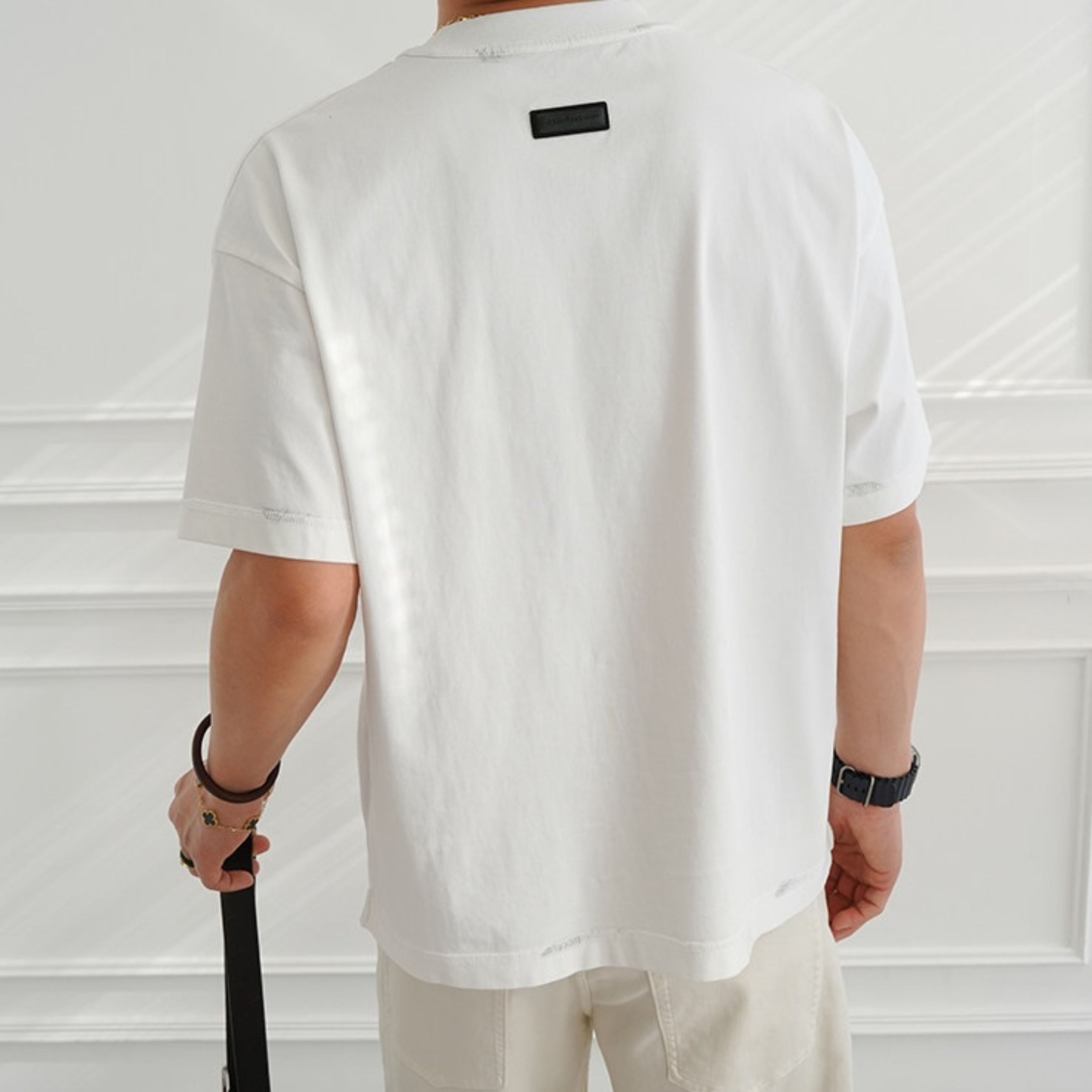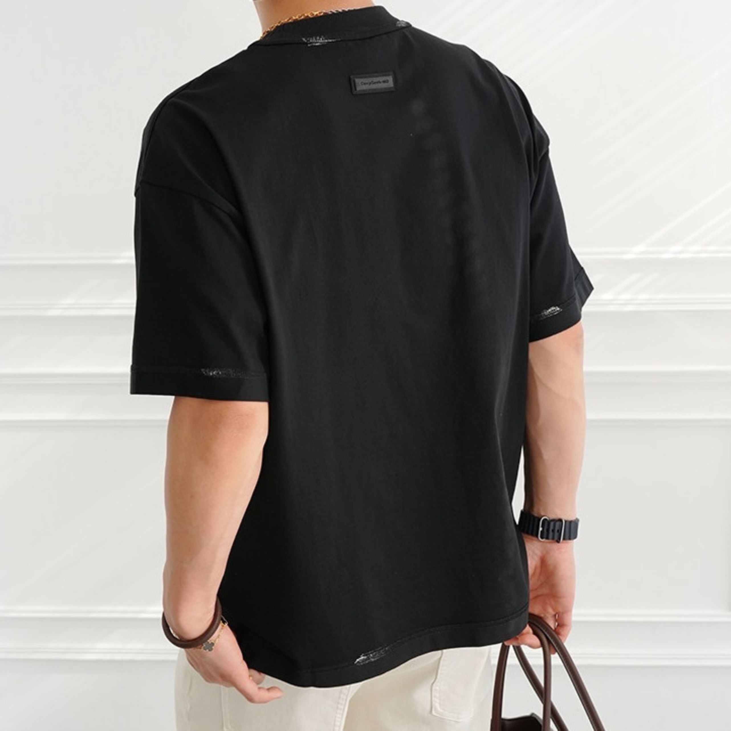 首元や袖口に施された絶妙なペイント風のダメージデザインが、ヴィンテージライクな表情を演出します。