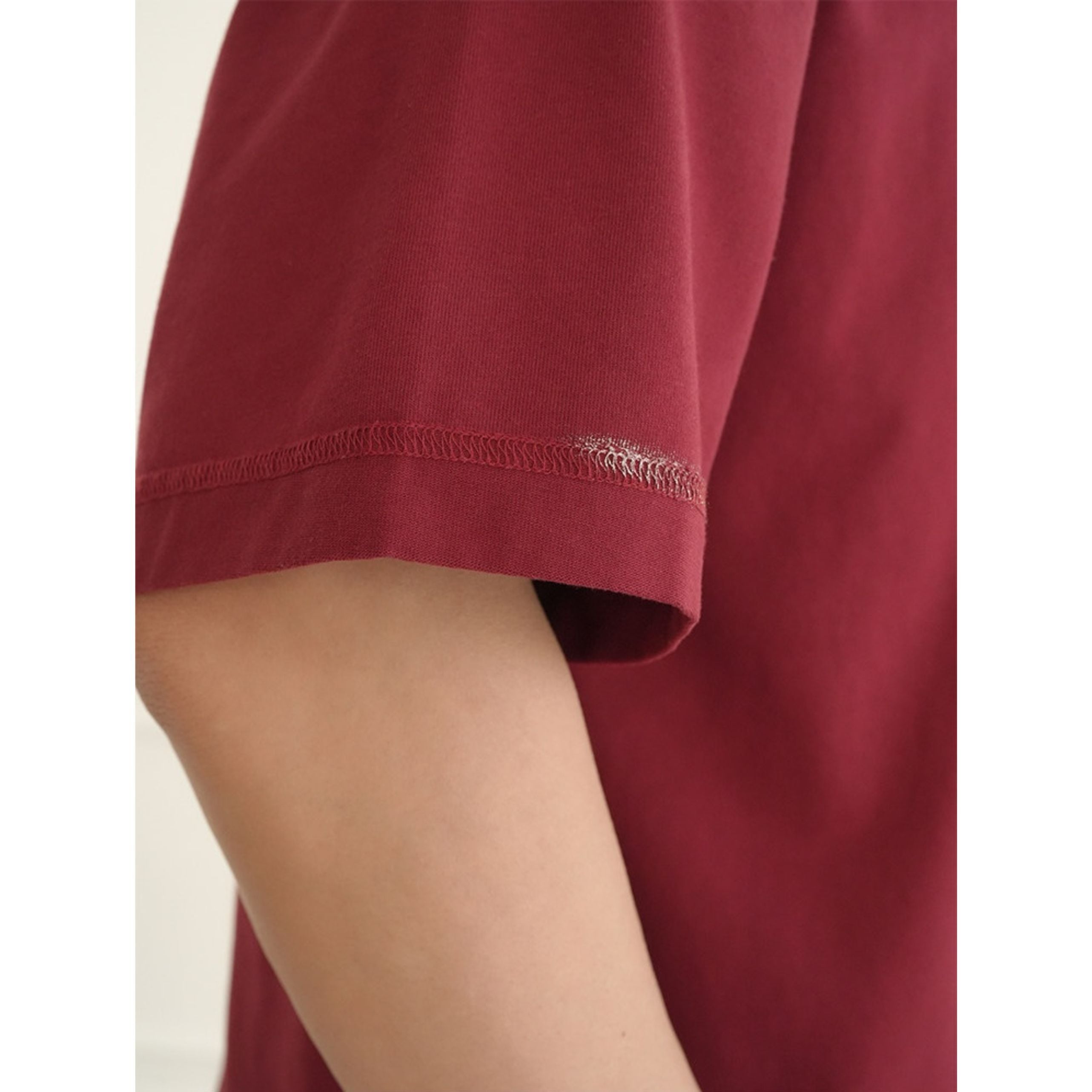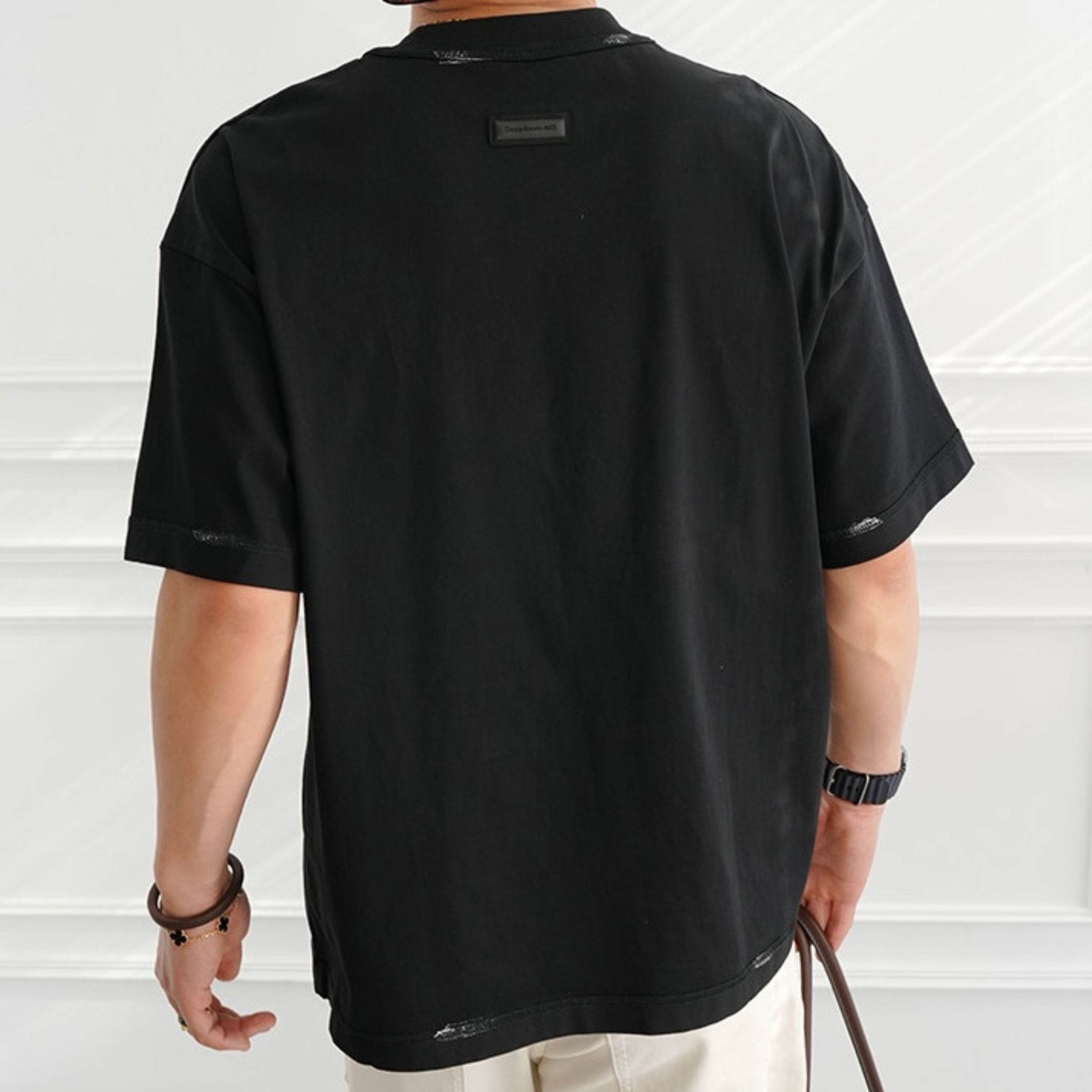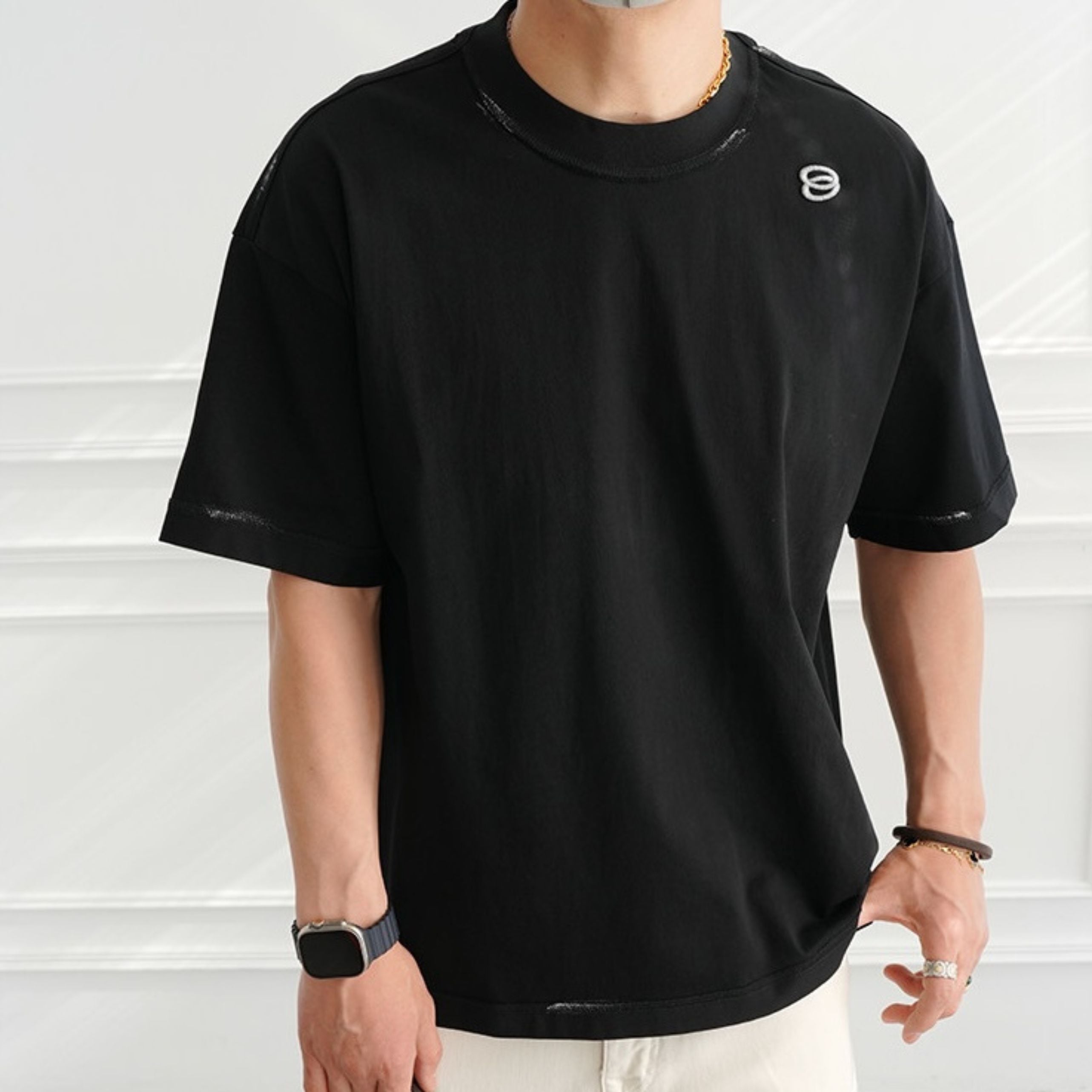 首元や袖口に施された絶妙なペイント風のダメージデザインが、ヴィンテージライクな表情を演出します。