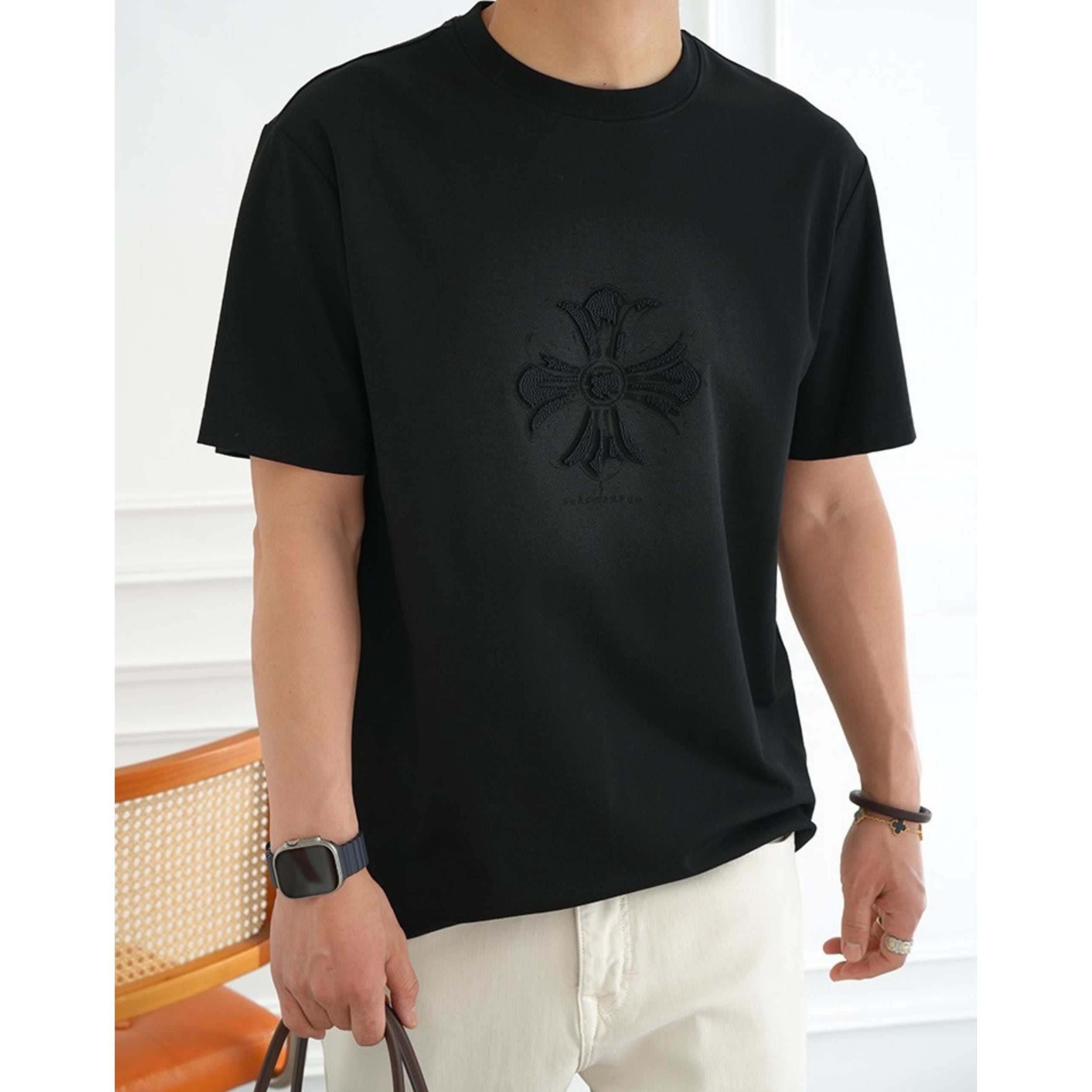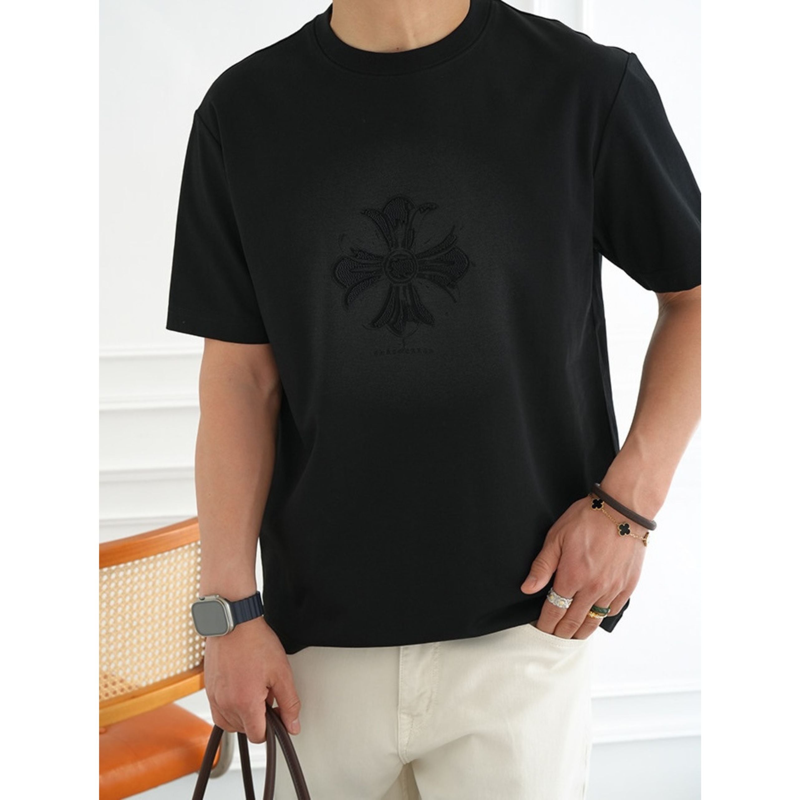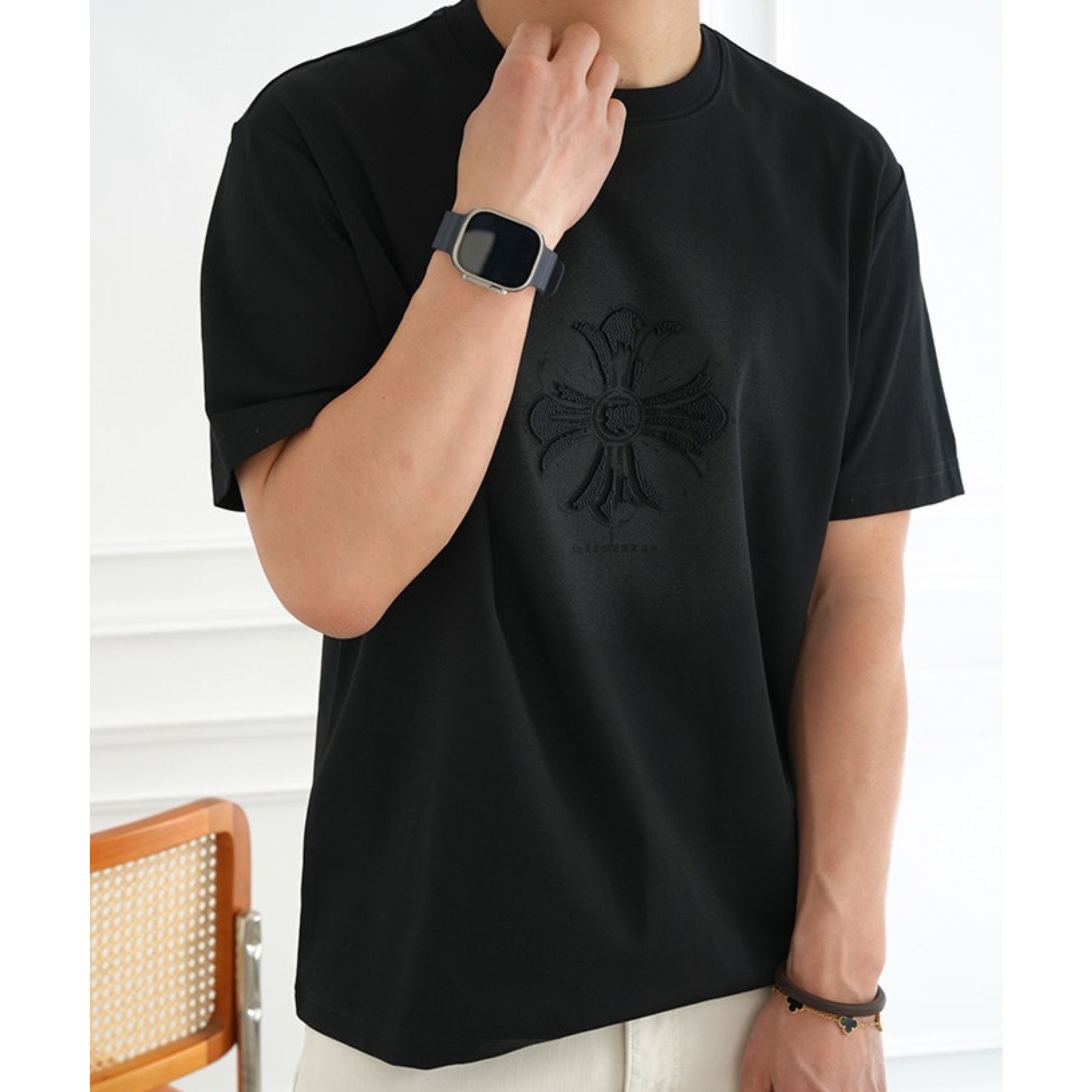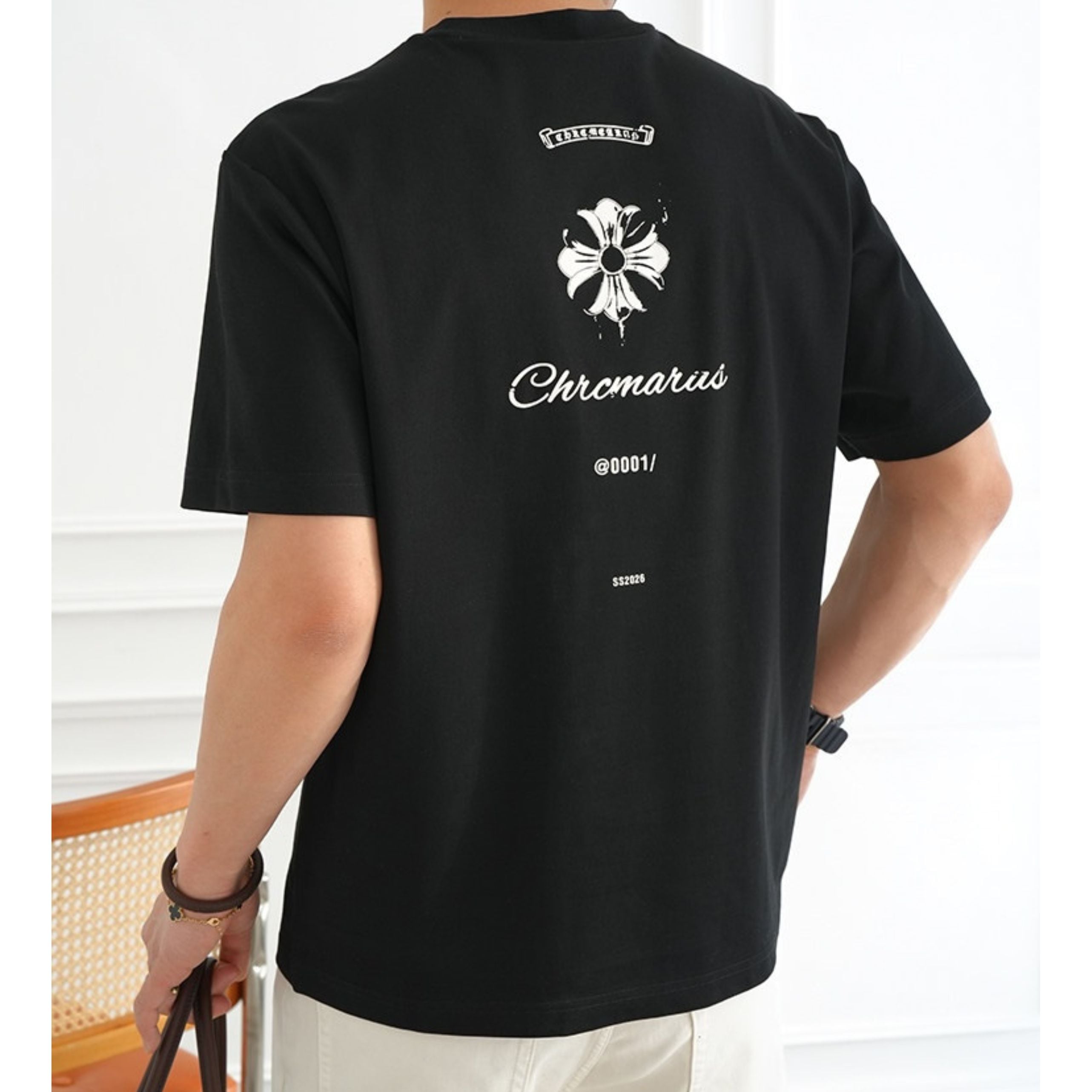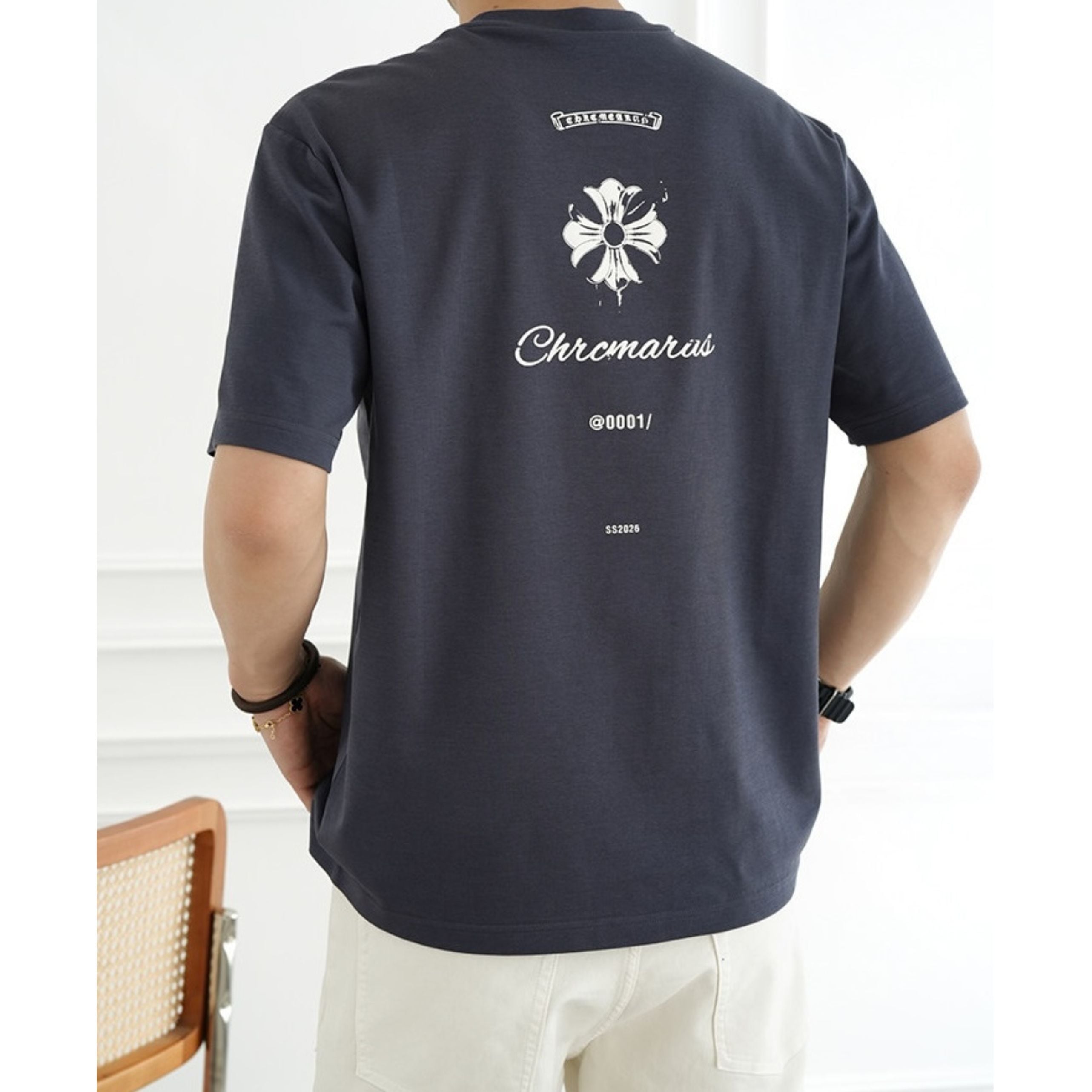 フロントは同色でまとめたシックな仕上がり、バックにはロゴとタイポグラフィーを配し、前後で異なる表情を楽しめます。