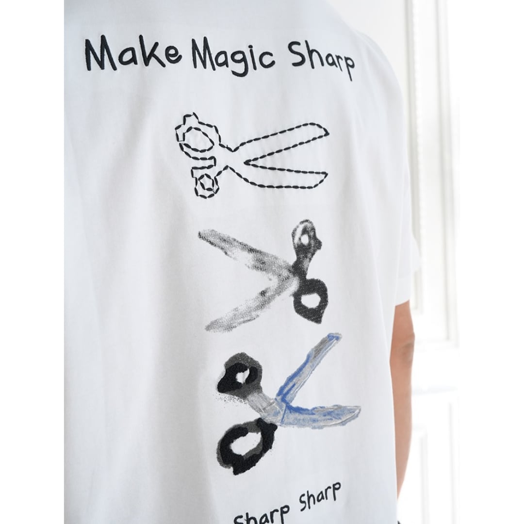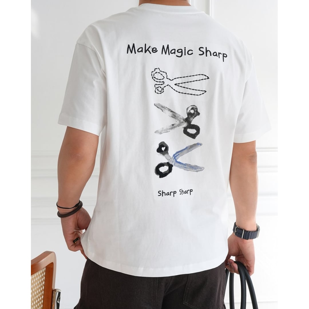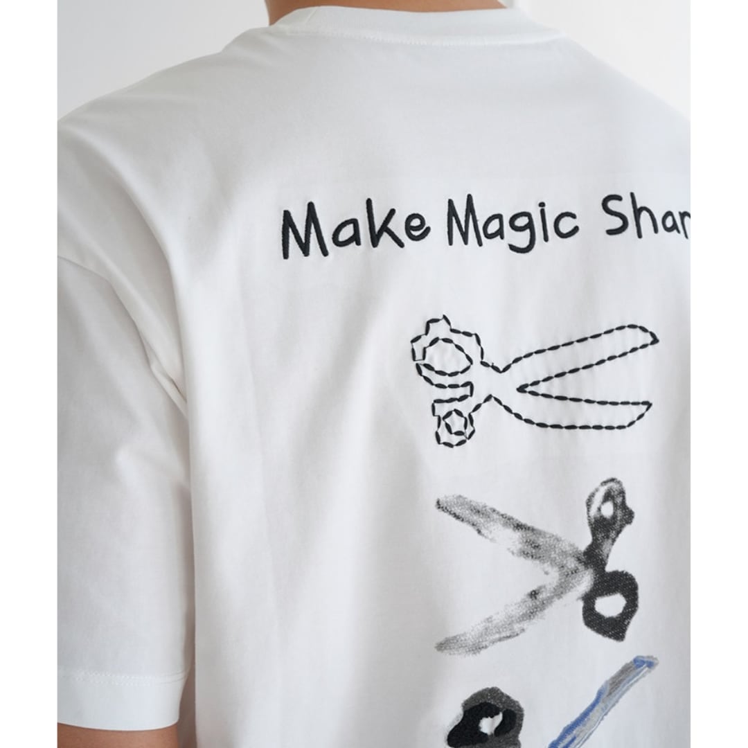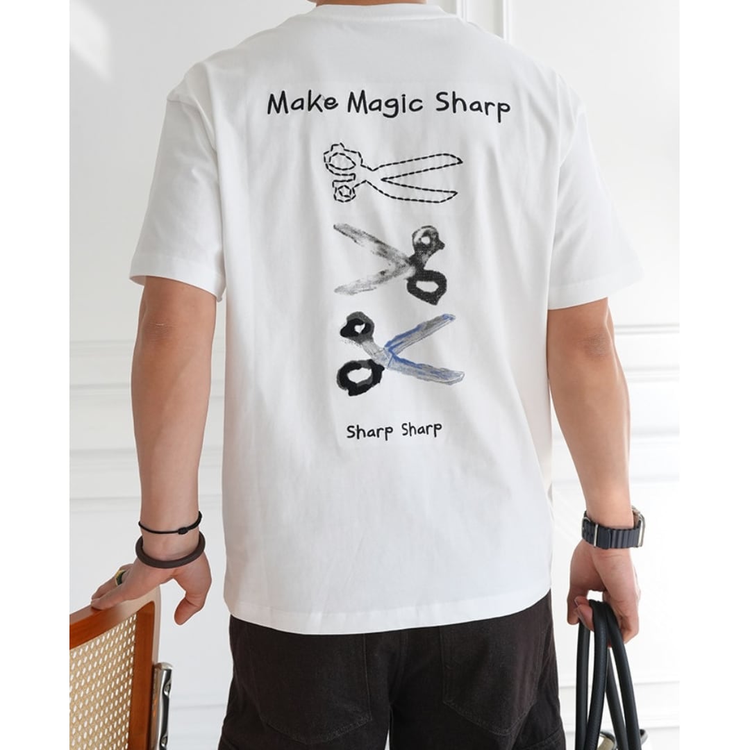 手描き風のハサミモチーフが目を引くバックプリントTシャツ。