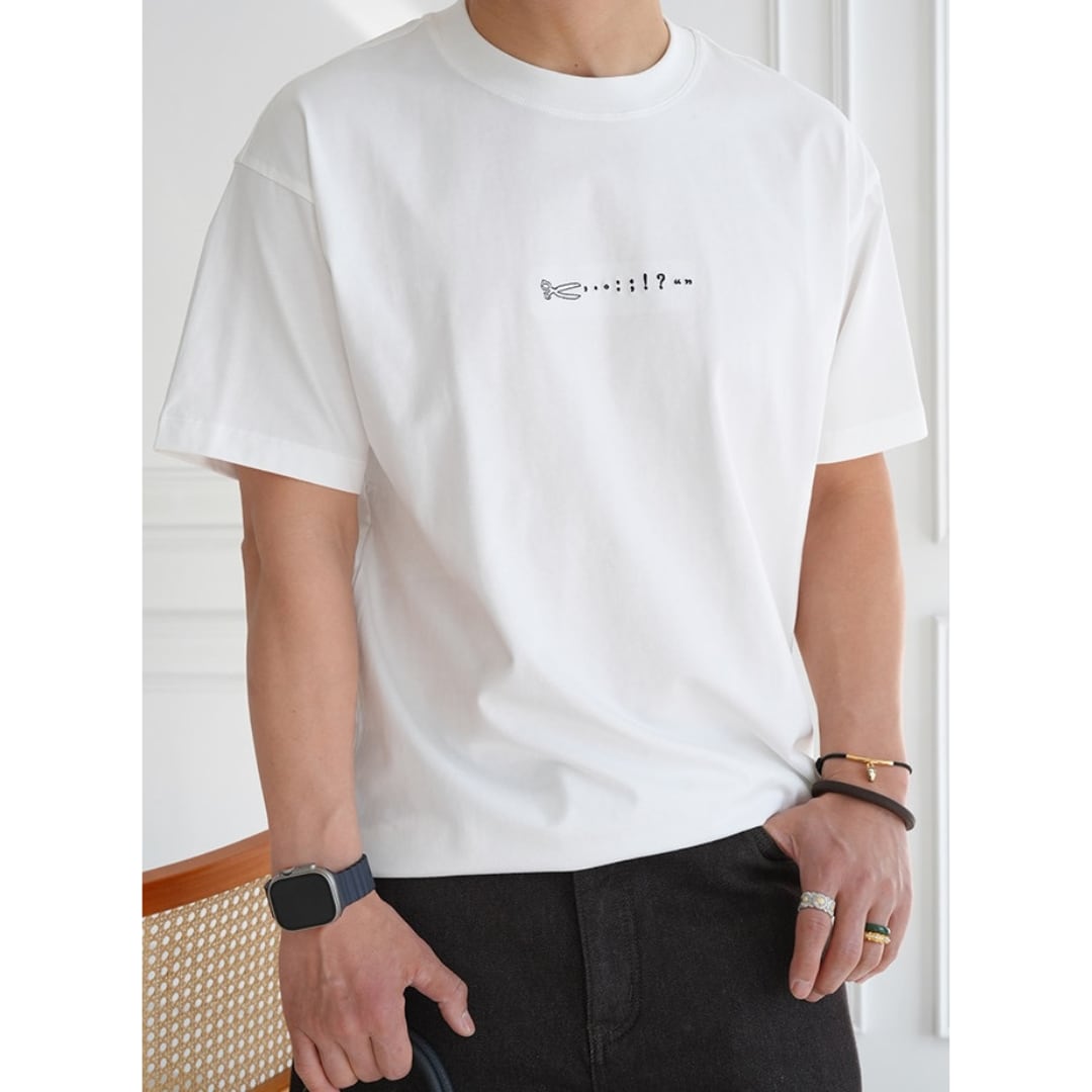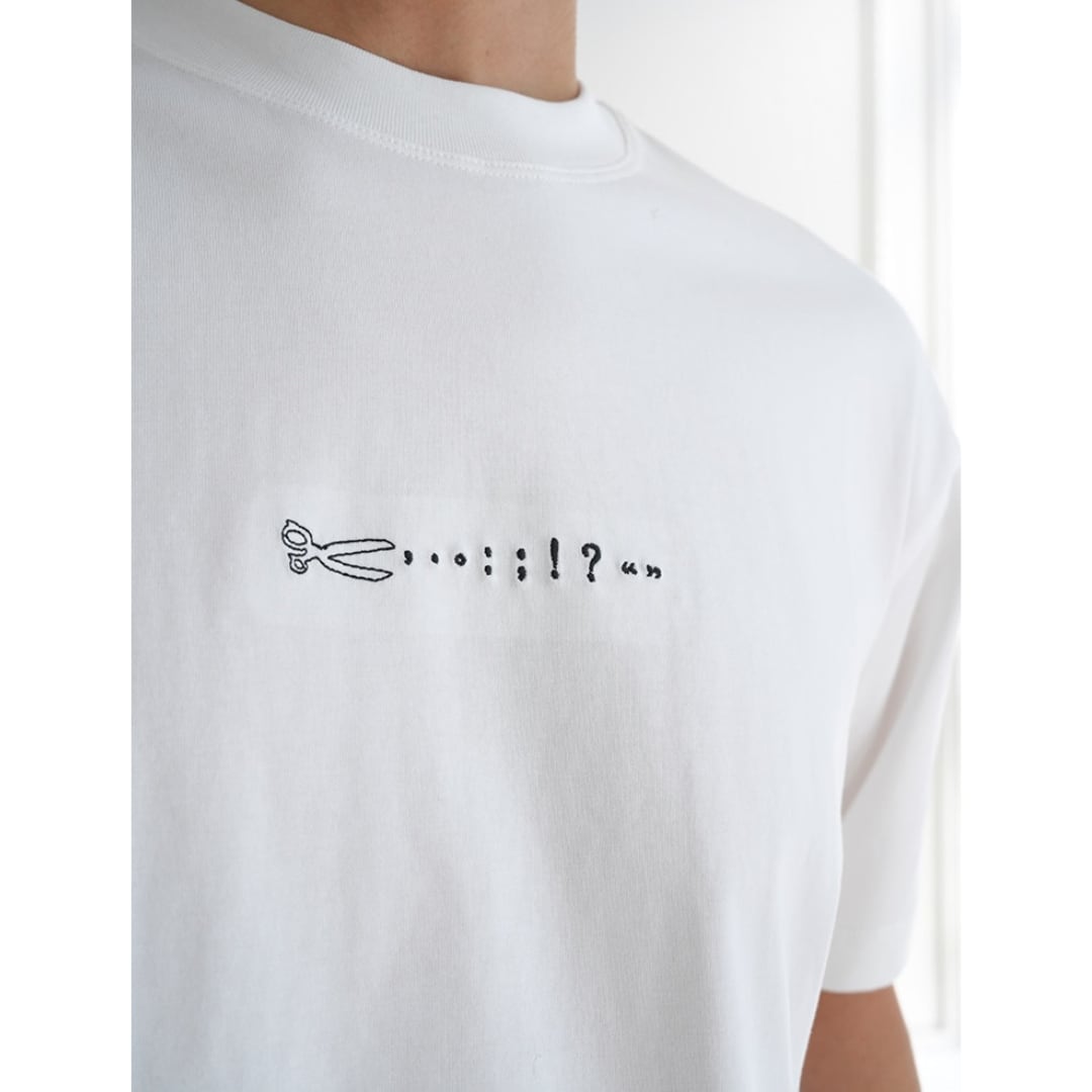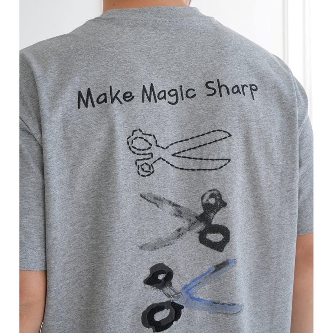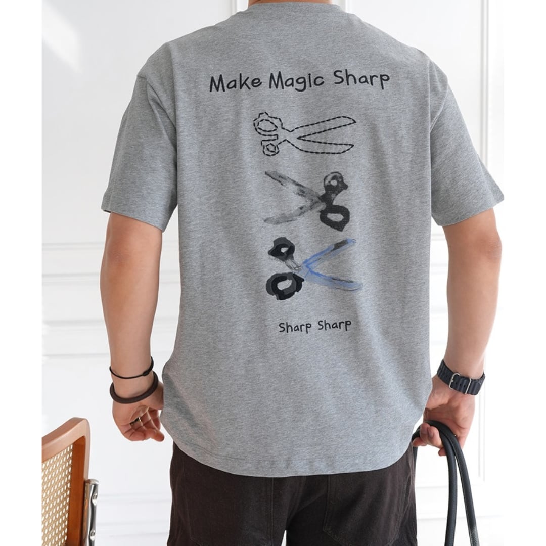 手描き風のハサミモチーフが目を引くバックプリントTシャツ。